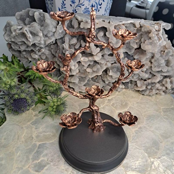 Toffe bolhouder van een bloesemboom met 7 bloesems waar bollen op te plaatsen zijn. De maximale grootte van de bollen is 6 cm maar nog leuker om te stylen met minibolletjes!Deze zware metalen bronskleurige houder is ongeveer 17cm hoog.