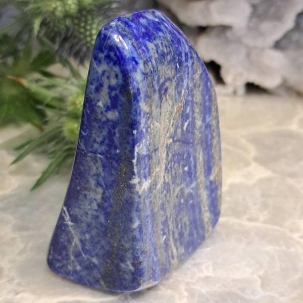 Dit mooie sculptuurtje van diepblauwe Lapis Lazuli met aders van pyriet komt uit Pakistan en is 175 gram en 5x6,5 cm groot.