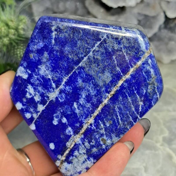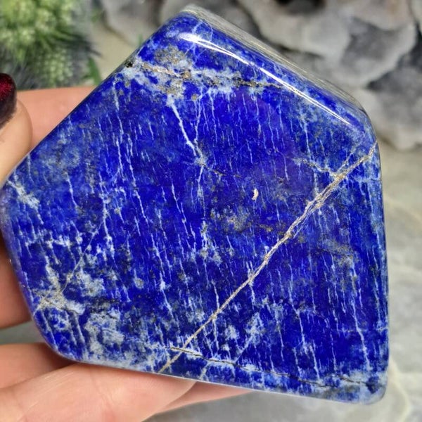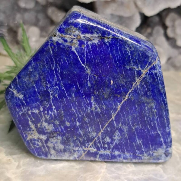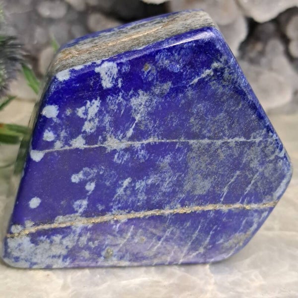 Dit mooie sculptuurtje van diepblauwe Lapis Lazuli met aders van pyriet komt uit Pakistan en is 345 gram en 8x7 cm groot.