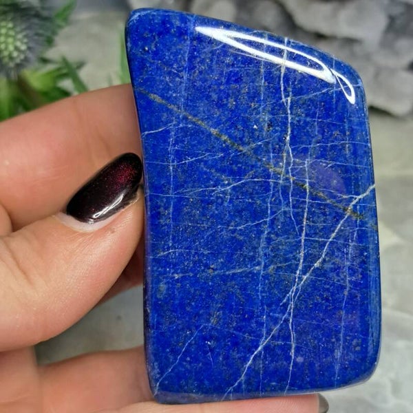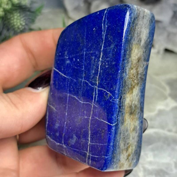 Dit mooie sculptuurtje van diepblauwe Lapis Lazuli met aders van pyriet komt uit Pakistan en is 1215 gram en 7x4,5 cm groot.