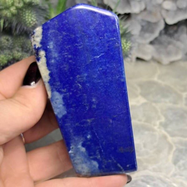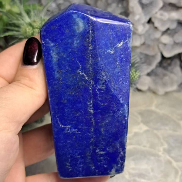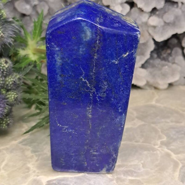 Dit mooie sculptuurtje van diepblauwe Lapis Lazuli met aders van pyriet komt uit Pakistan en is 319 gram en 10x5 cm groot.