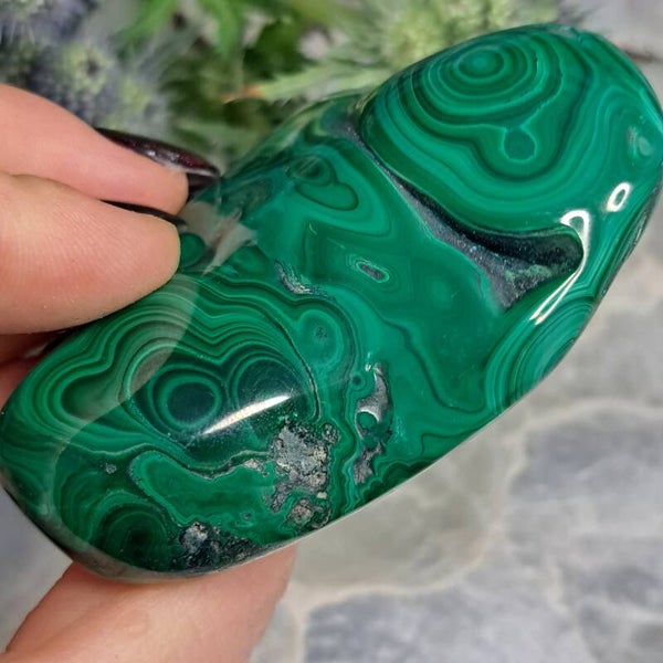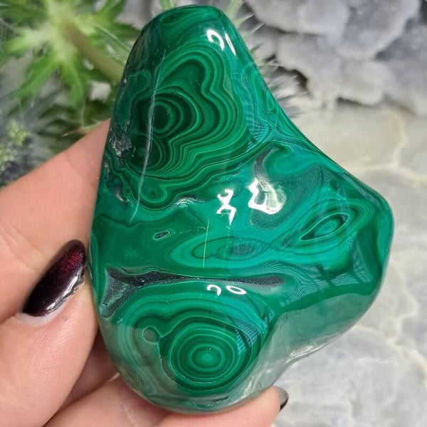 Mooie jumbo palmsteen van malachiet met prachtig patroon.