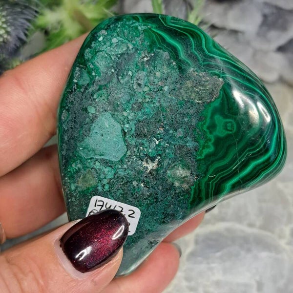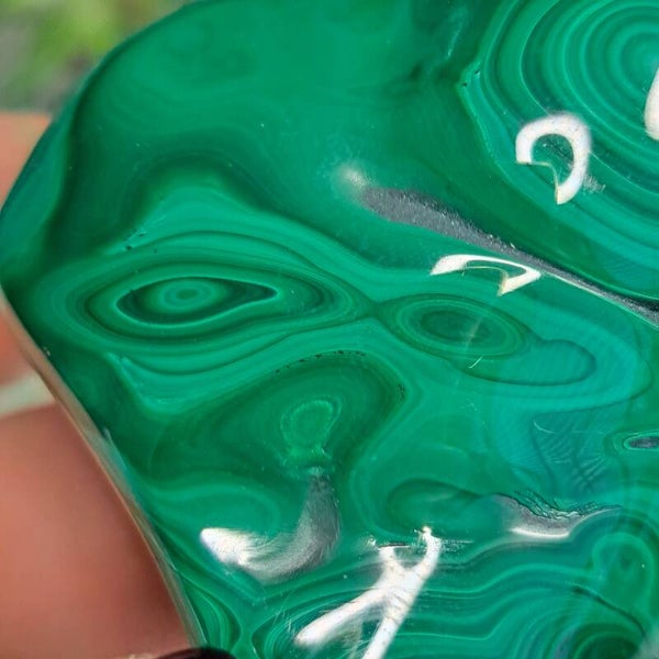 Deze gave jumbo is 174 gram en 7,2 cm groot en heeft allemaal prachtige lijnen en patronen die zo kenmerkend zijn voor malachiet.