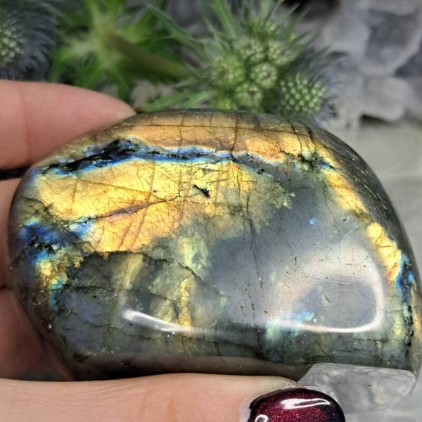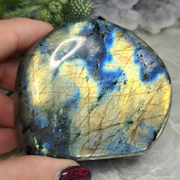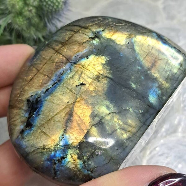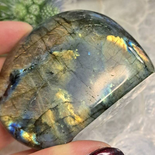 Dit mooie sculptuurtje van dubbelzijdige flashy labradoriet heeft prachtige meerkleur en is 286 gram en 8x6,5 cm groot.