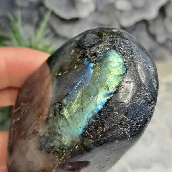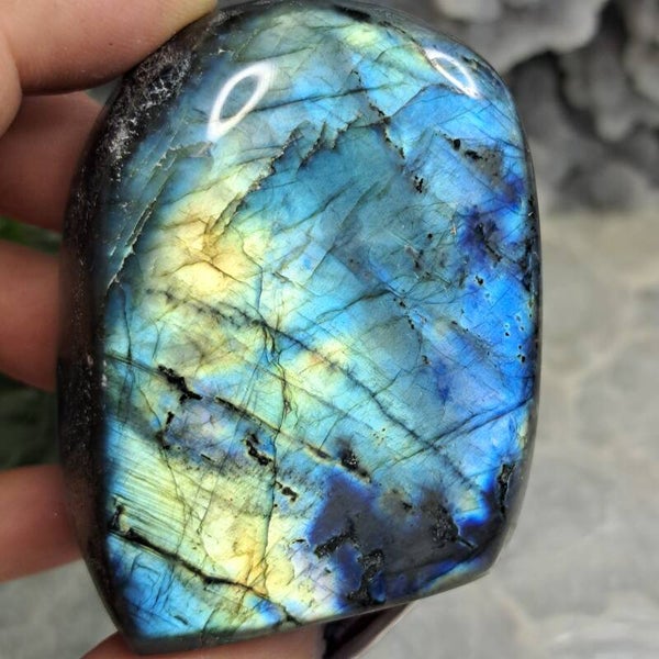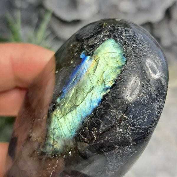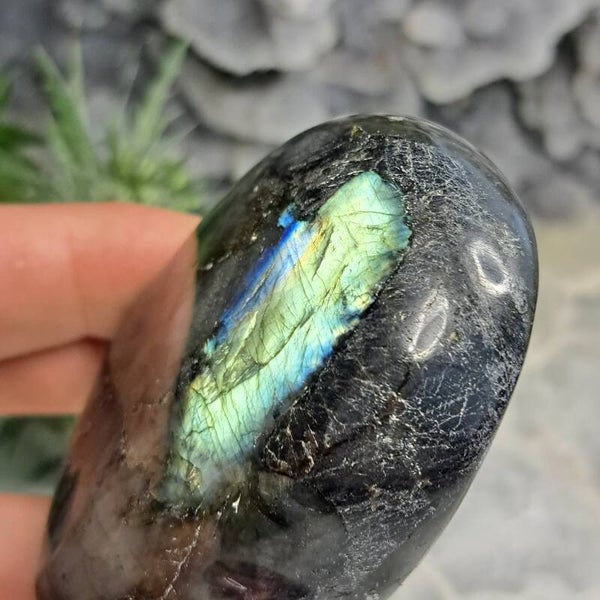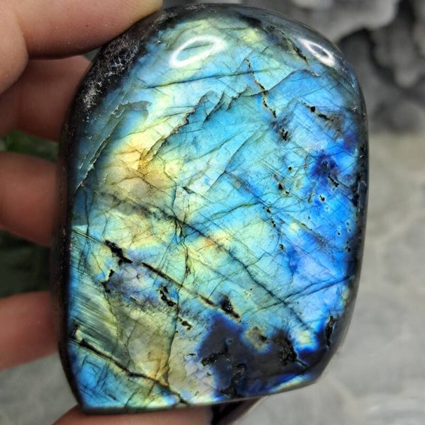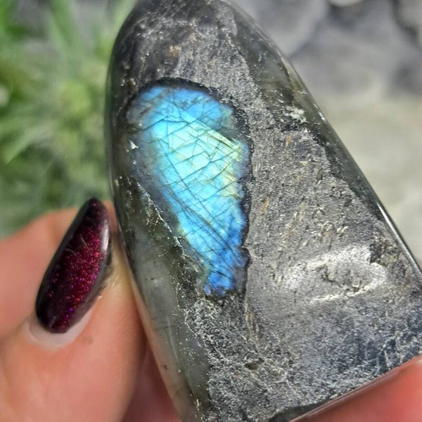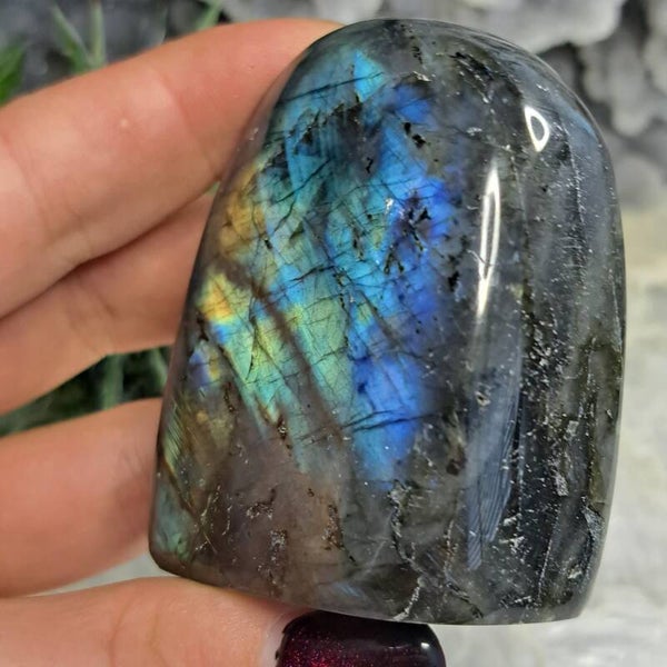 Dit mooie sculptuurtje van dubbelzijdige flashy labradoriet heeft prachtige meerkleur en is 208 gram en 6,5 cm groot.