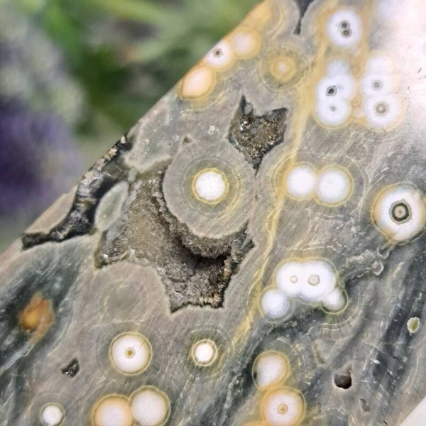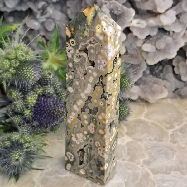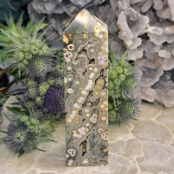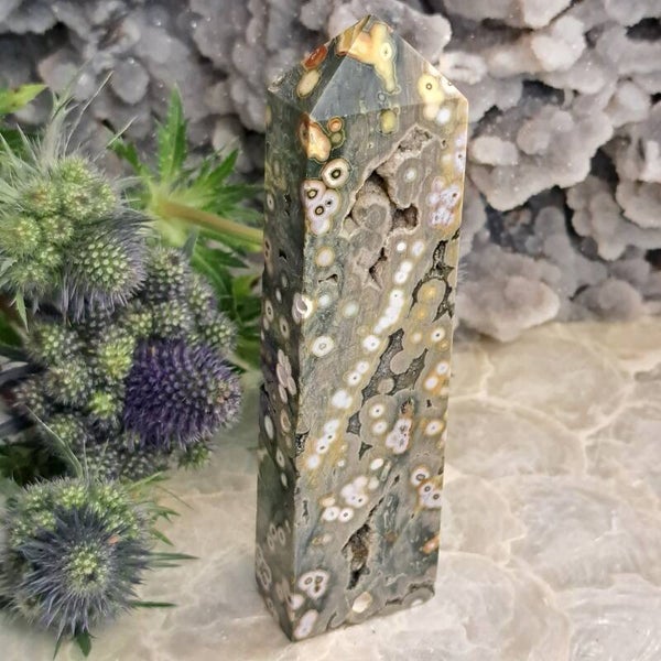 Deze mooie geslepen punt van oceaanjaspis met prachtig patroon, een aantal drusy openingen en vol "orbs" combinatie is 13,5 centimeter groot en weegt 280 gram.
