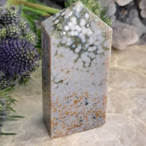Deze mooie geslepen punt van oceaanjaspis met prachtig patroon in groen, grijs, wit en oker combinatie is 8,5 centimeter groot en weegt 143 gram.