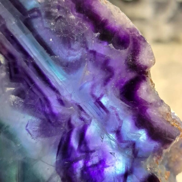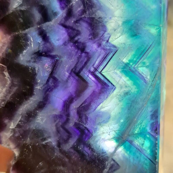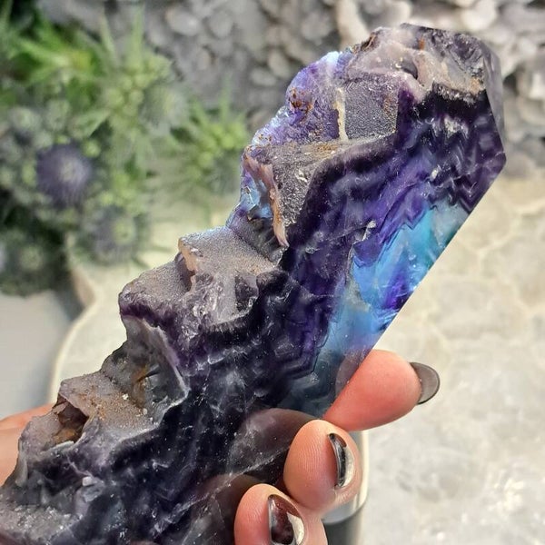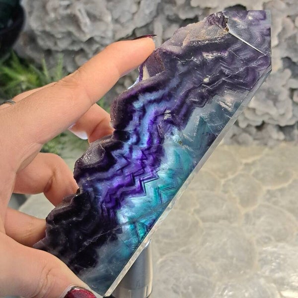Deze gave grote punt van regenboog fluoriet heeft een ruwe voorzijde, heeft prachtige heldere kleuren, is 390 gram en 15,8 cm groot. (Schijnt Fel Blauw onder UV!)