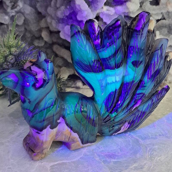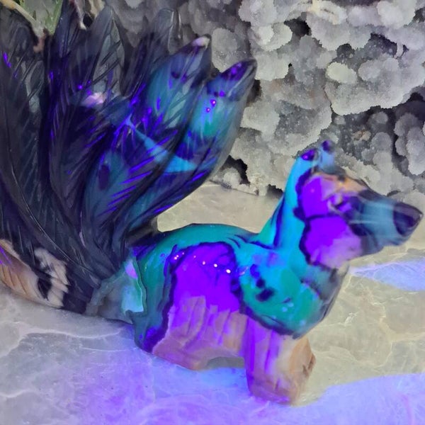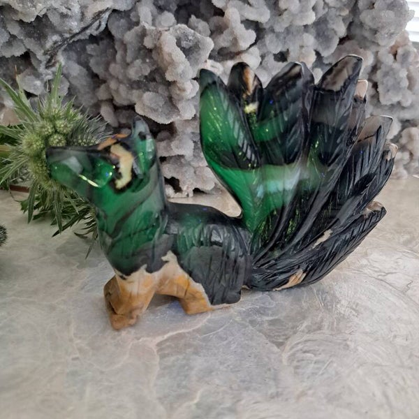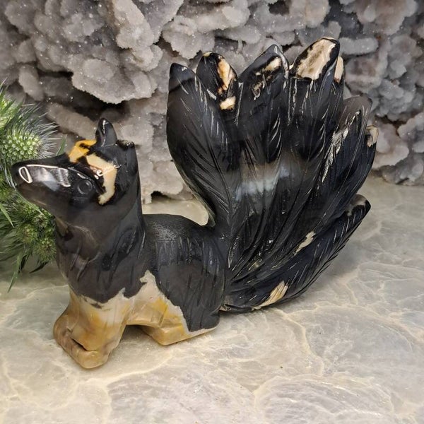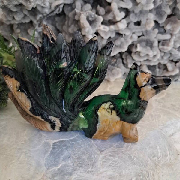 Dit prachtige sculptuur in de vorm van een 9 tail fox is met de hand geslepen en is 604 gram en 16 cm groot.