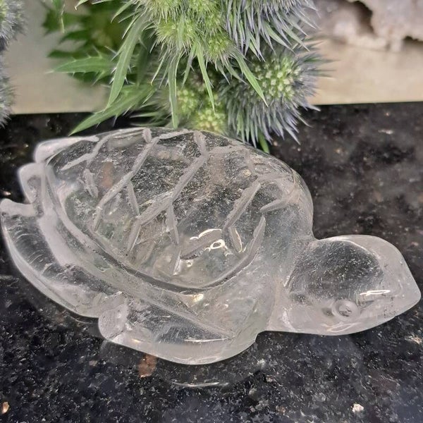 Deze prachtige heldere Carving in de vorm van een schildpad staat symbool voor een lang leven, stabiliteit, wijsheid, bescherming en geduld. Ze is 112 gram en 8,8 cm groot. (Met de hand geslepen!)