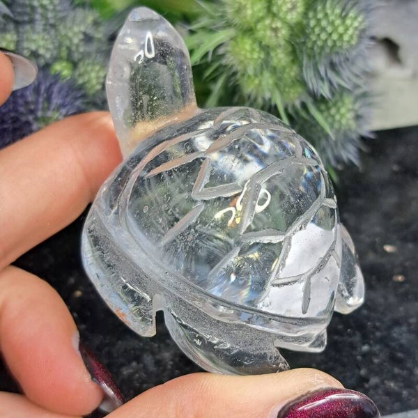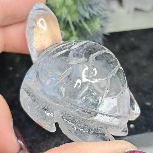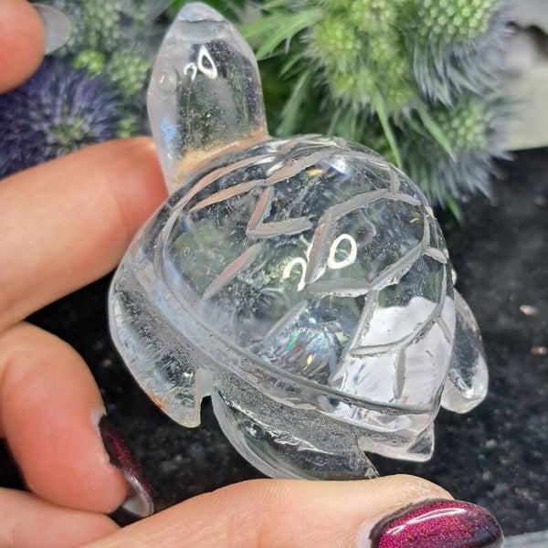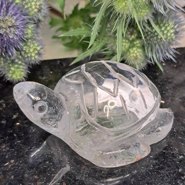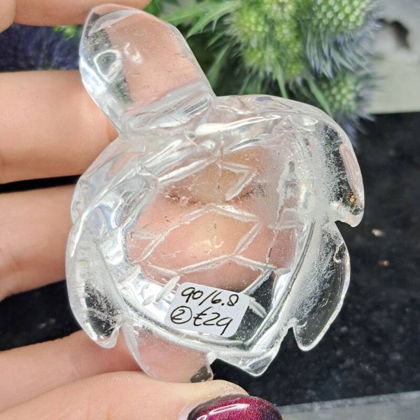 Deze prachtige heldere Carving in de vorm van een schildpad staat symbool voor een lang leven, stabiliteit, wijsheid, bescherming en geduld. Ze is 90 gram en 6,8 cm groot. (Met de hand geslepen!)