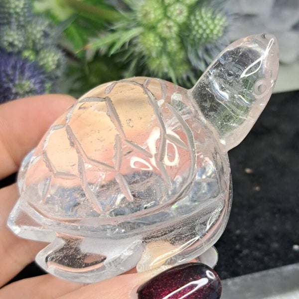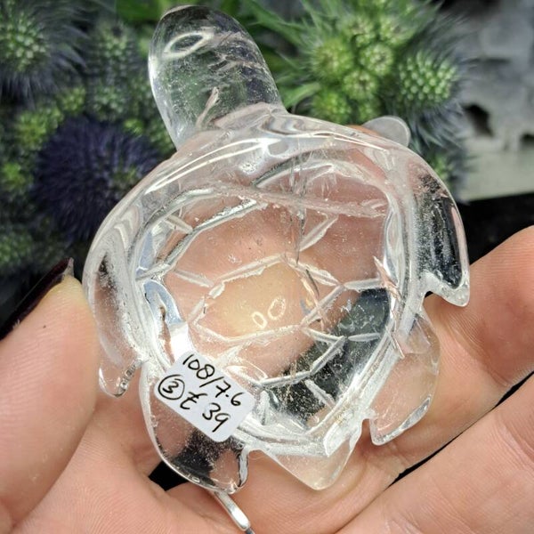 Deze prachtige heldere Carving in de vorm van een schildpad staat symbool voor een lang leven, stabiliteit, wijsheid, bescherming en geduld. Ze is 108 gram en 7,6 cm groot. (Met de hand geslepen!)