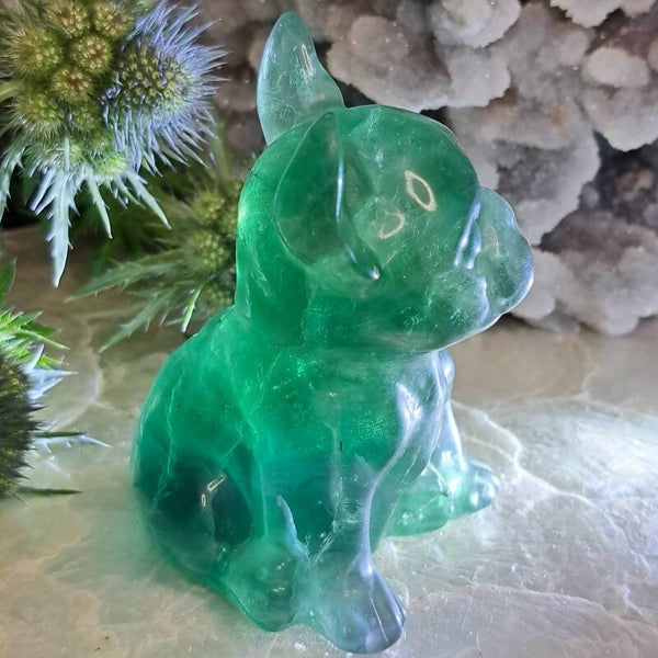 Deze prachtige groen/ blauwe fluoriet Carving in de vorm van een bulldog is 369 gram en 9 cm groot. (Blauw Reactief onder UV!)