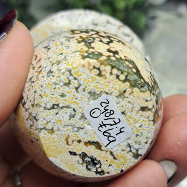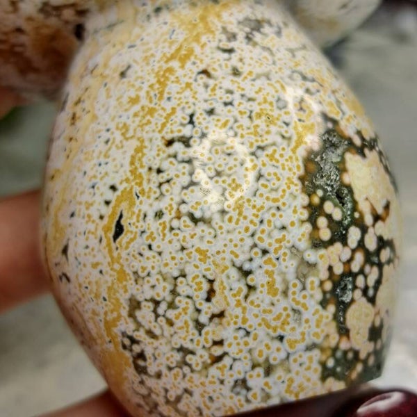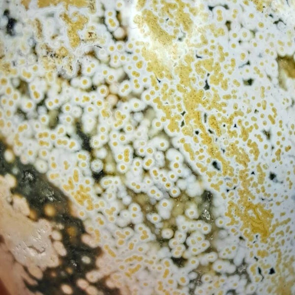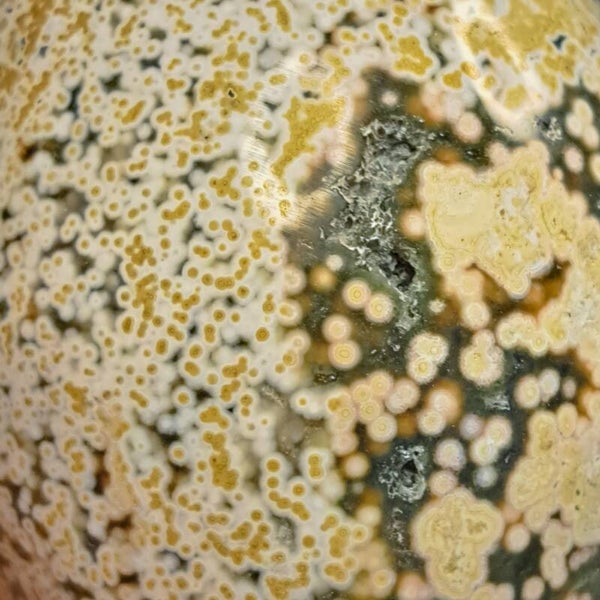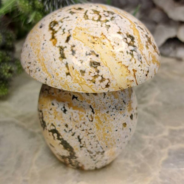 Deze mooie geslepen Paddenstoel of Mushroom vol prachtige "Orbs" (orbiculaire groei) in pastelkleuren is 7,4 centimeter groot en weegt 248 gram.