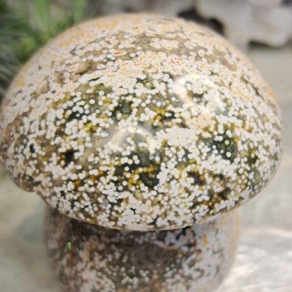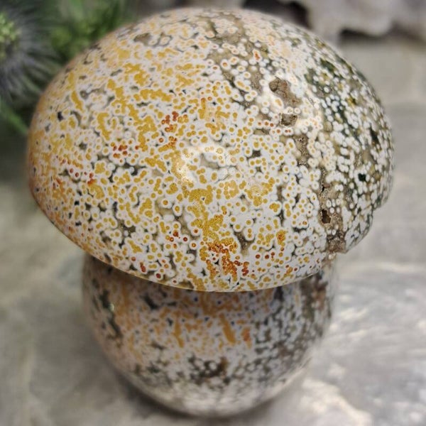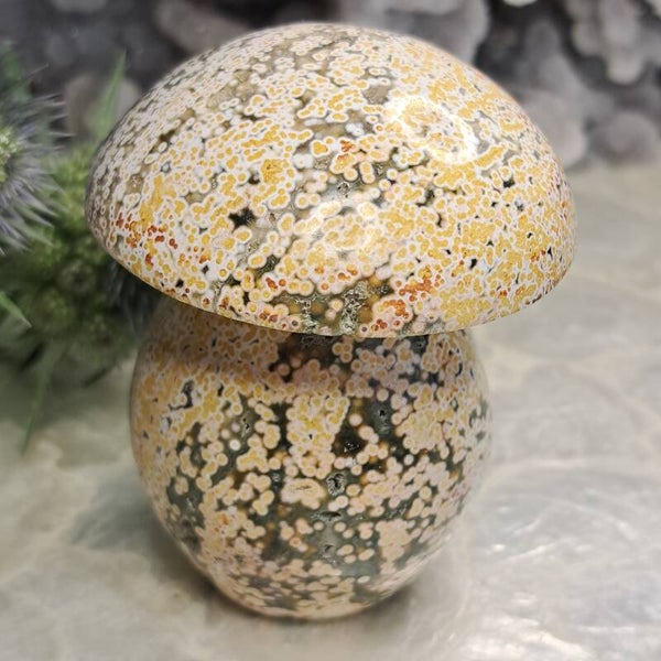 Deze mooie geslepen Paddenstoel of Mushroom vol prachtige "Orbs" (orbiculaire groei) in pastelkleuren is 7,8 centimeter groot en weegt 280 gram.