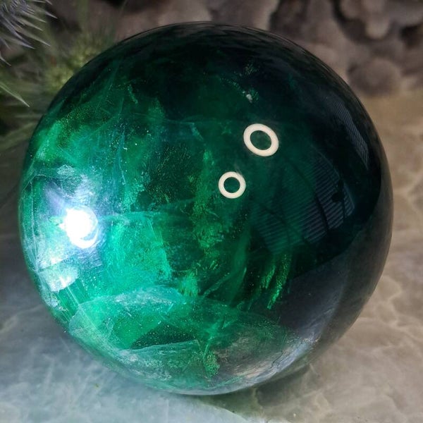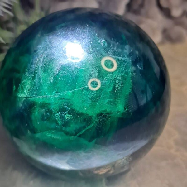 Deze Fluoriet bol van hoge kwalitiet diepgroen/blauwe Fluoriet straalt fel blauw onder UV en is 600 gram en 7,2 cm groot.