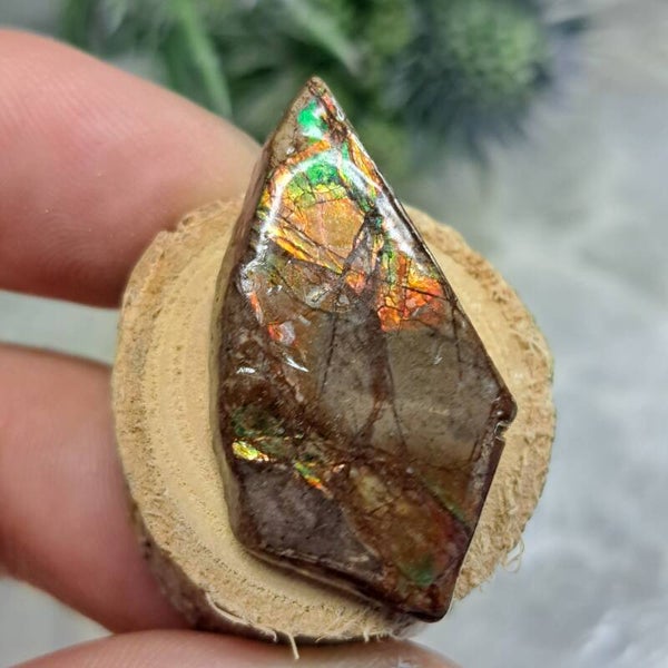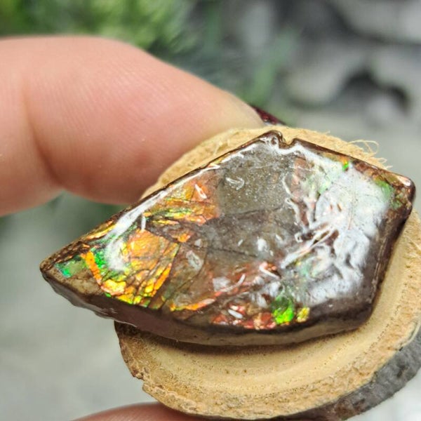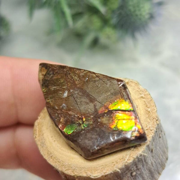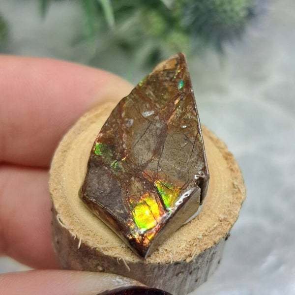 Deze ammoliet uit Canada in ongeveer 2,5 cm groot (Voetje niet meegerekend!)