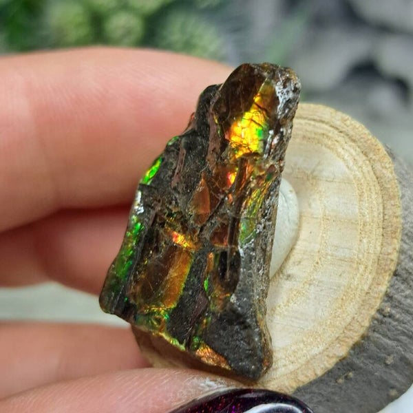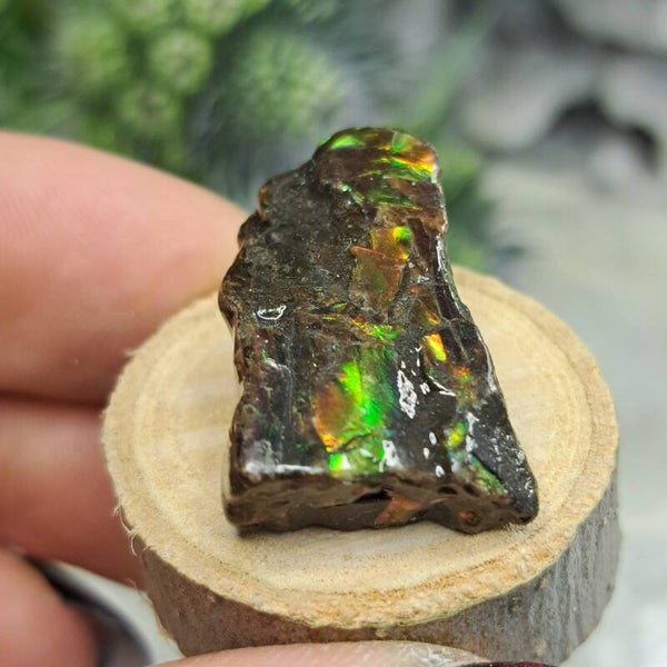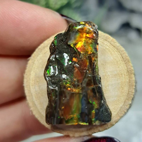 Deze ammoliet uit Canada in ongeveer 2,5 cm groot (Voetje niet meegerekend!)