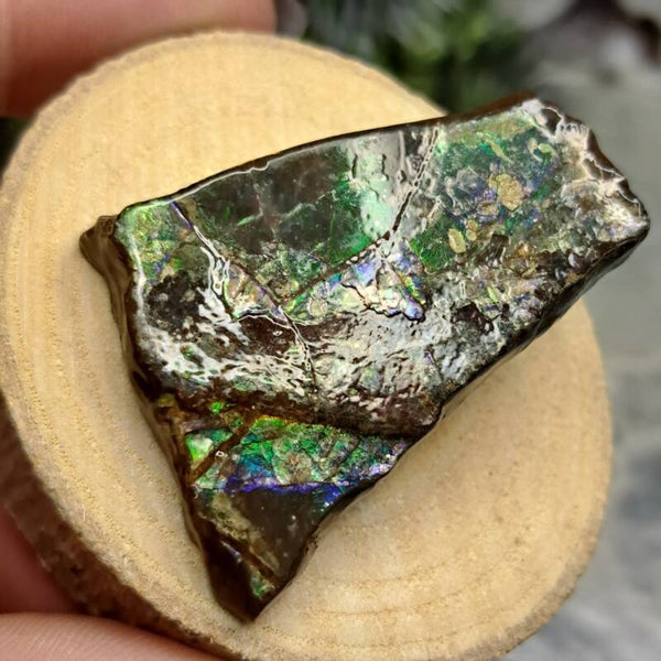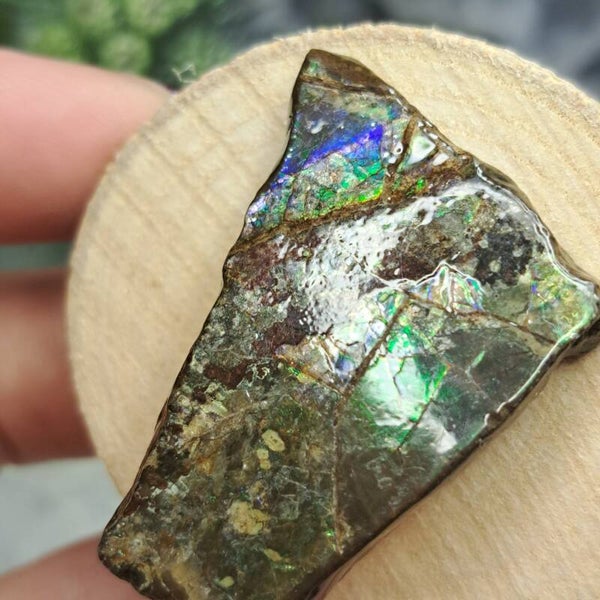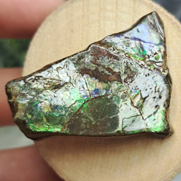 Deze ammoliet uit Canada in ongeveer 5 cm groot (Voetje niet meegerekend!)