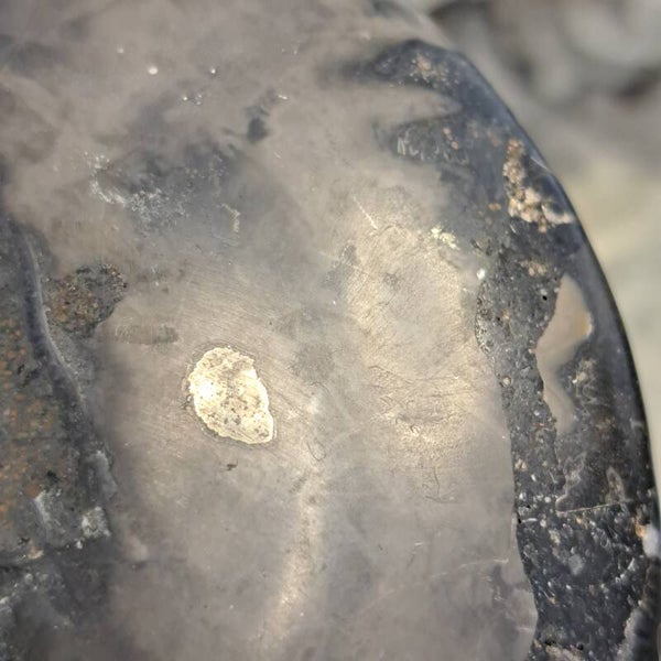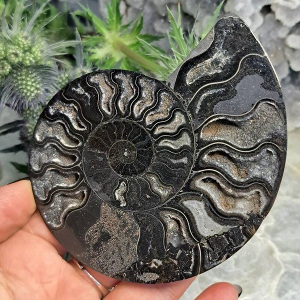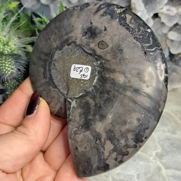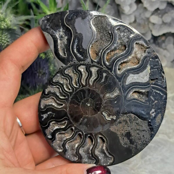 Deze prachtige zwarte ammoniet heeft wat kwartskristalletjes en is 10,5 cm groot. (Het is de helft van een paartje, de andere helft is de nummer 2).