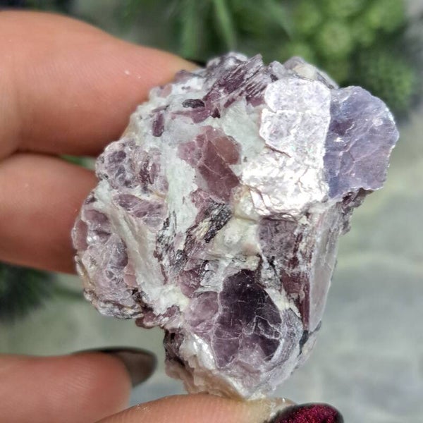 Het is een potassium lithium aluminium silicaat en groeit vaak samen met roze toermalijn. Deze vorm van lepidoliet met shimmer effect noemen ze ook Gem Lepidoliet of Paarse Mica.