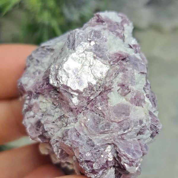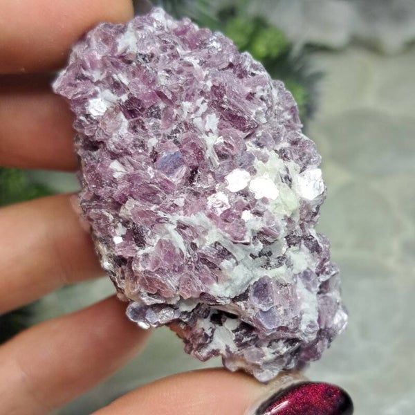Het is een potassium lithium aluminium silicaat en groeit vaak samen met roze toermalijn. Deze vorm van lepidoliet met shimmer effect noemen ze ook Gem Lepidoliet of Paarse Mica.