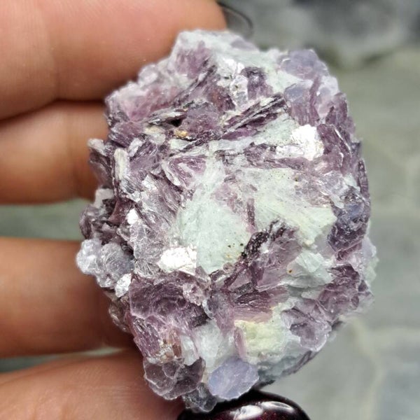 Het is een potassium lithium aluminium silicaat en groeit vaak samen met roze toermalijn. Deze vorm van lepidoliet met shimmer effect noemen ze ook Gem Lepidoliet of Paarse Mica.