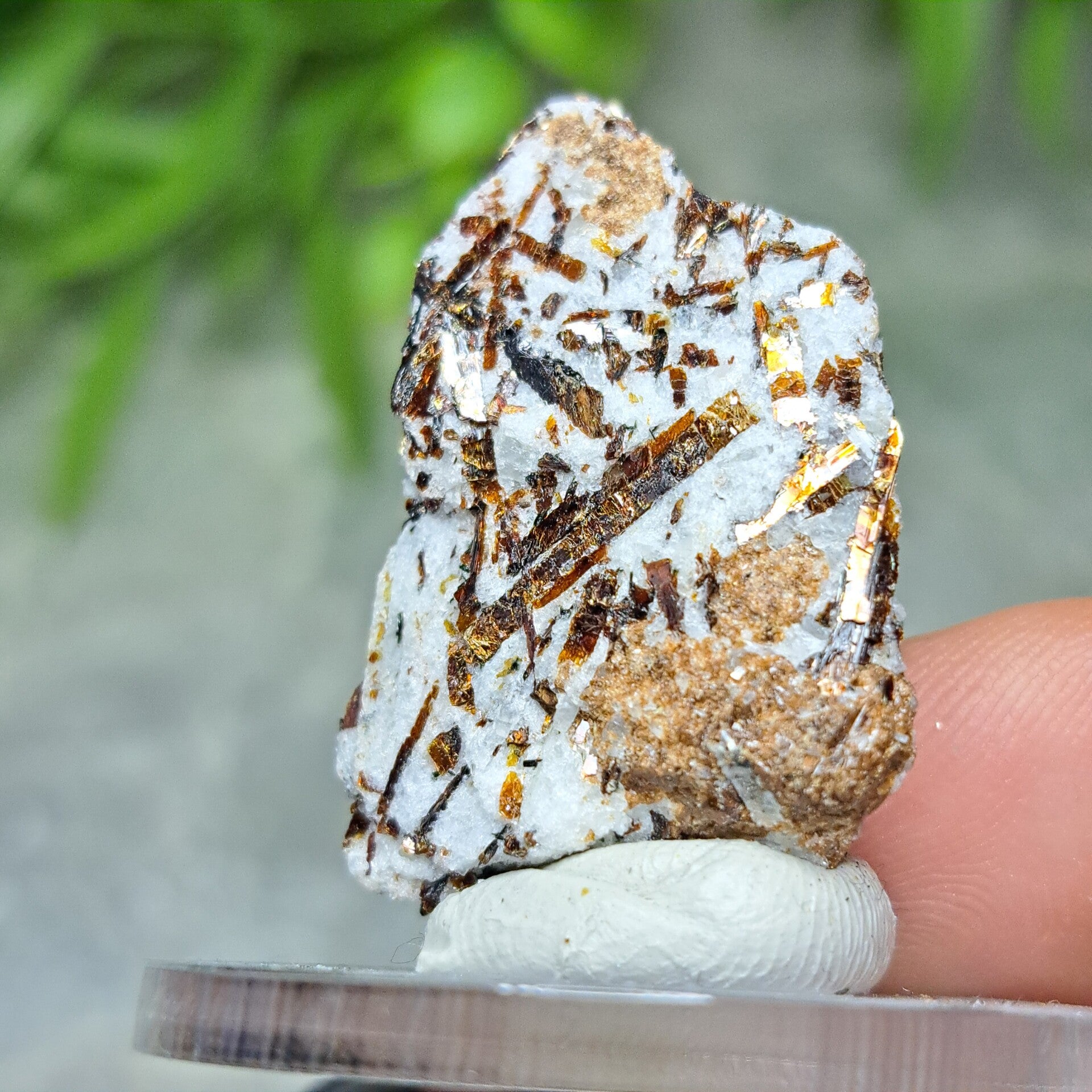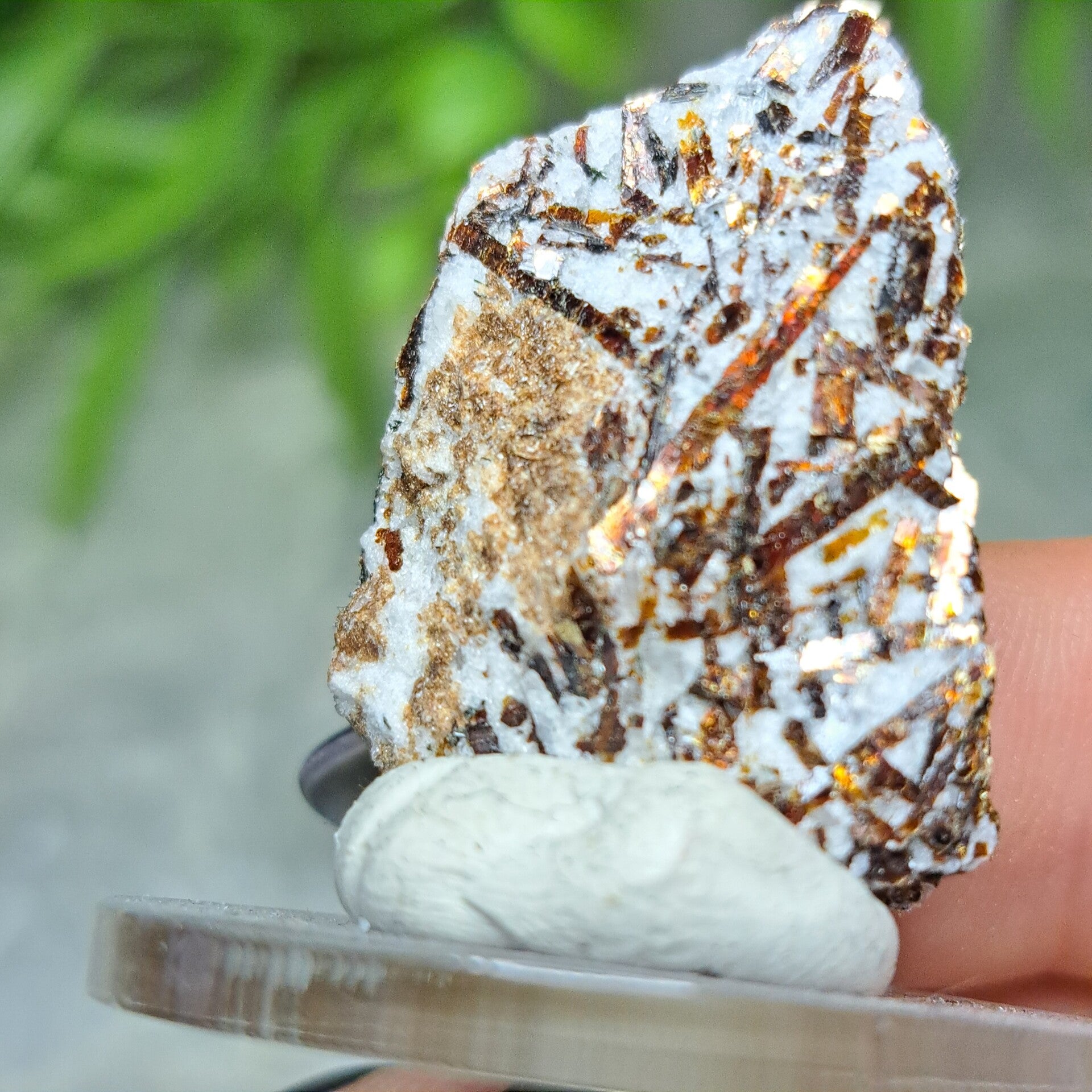 Deze gave ruwe astrofylliet komt uit Kola Peninsula en is ongeveer 3 cm groot en staat met kneedgum op een kunststof plaatje.