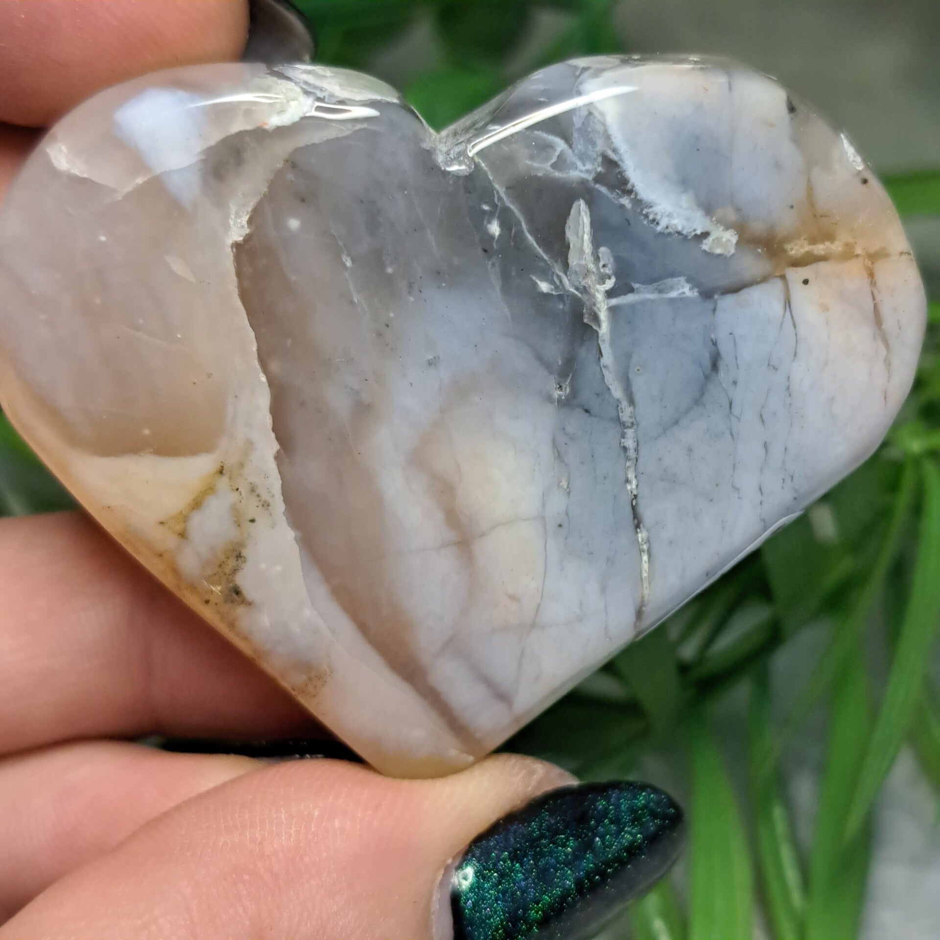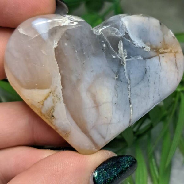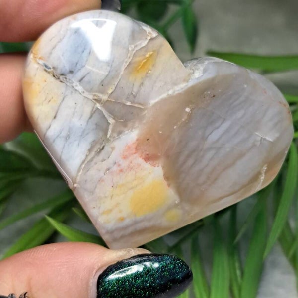 Dit mooie hart van oceaanjaspis met prachtig patroon in roze, paarse en groene combinatie is 5,5 centimeter groot en weegt 58 gram.