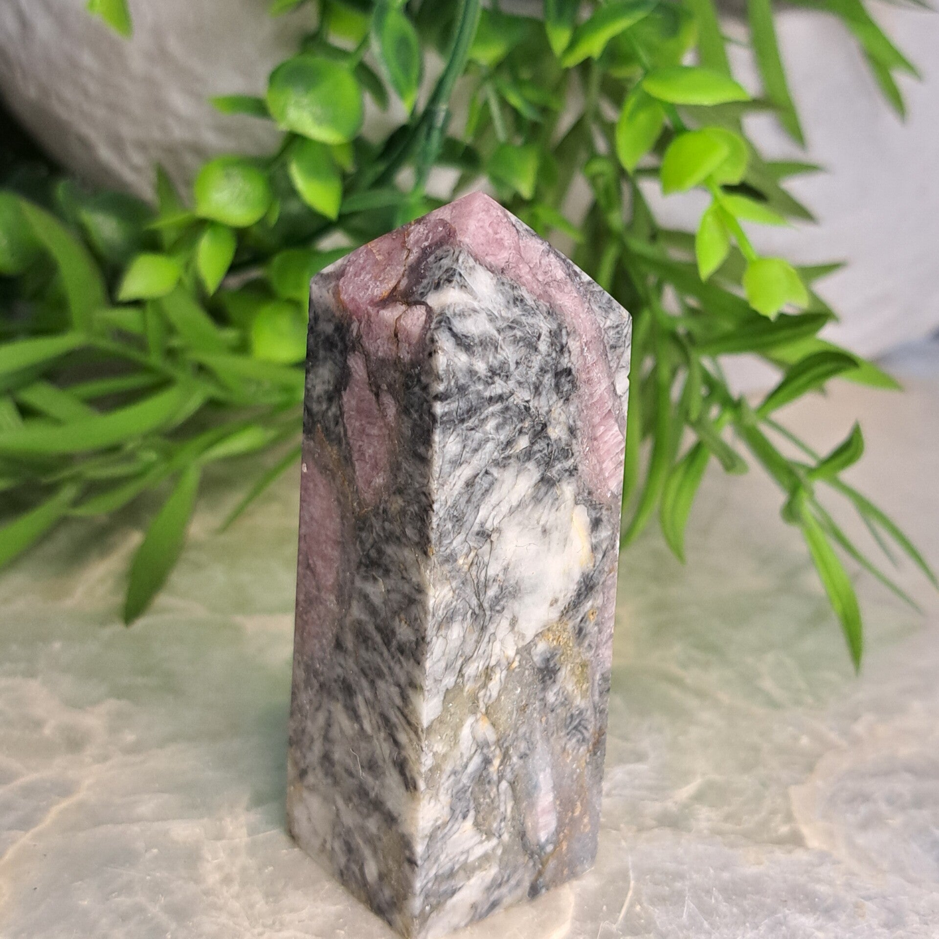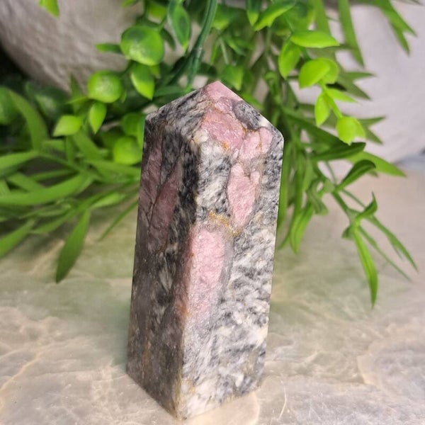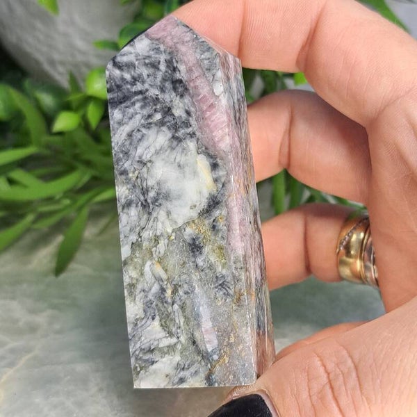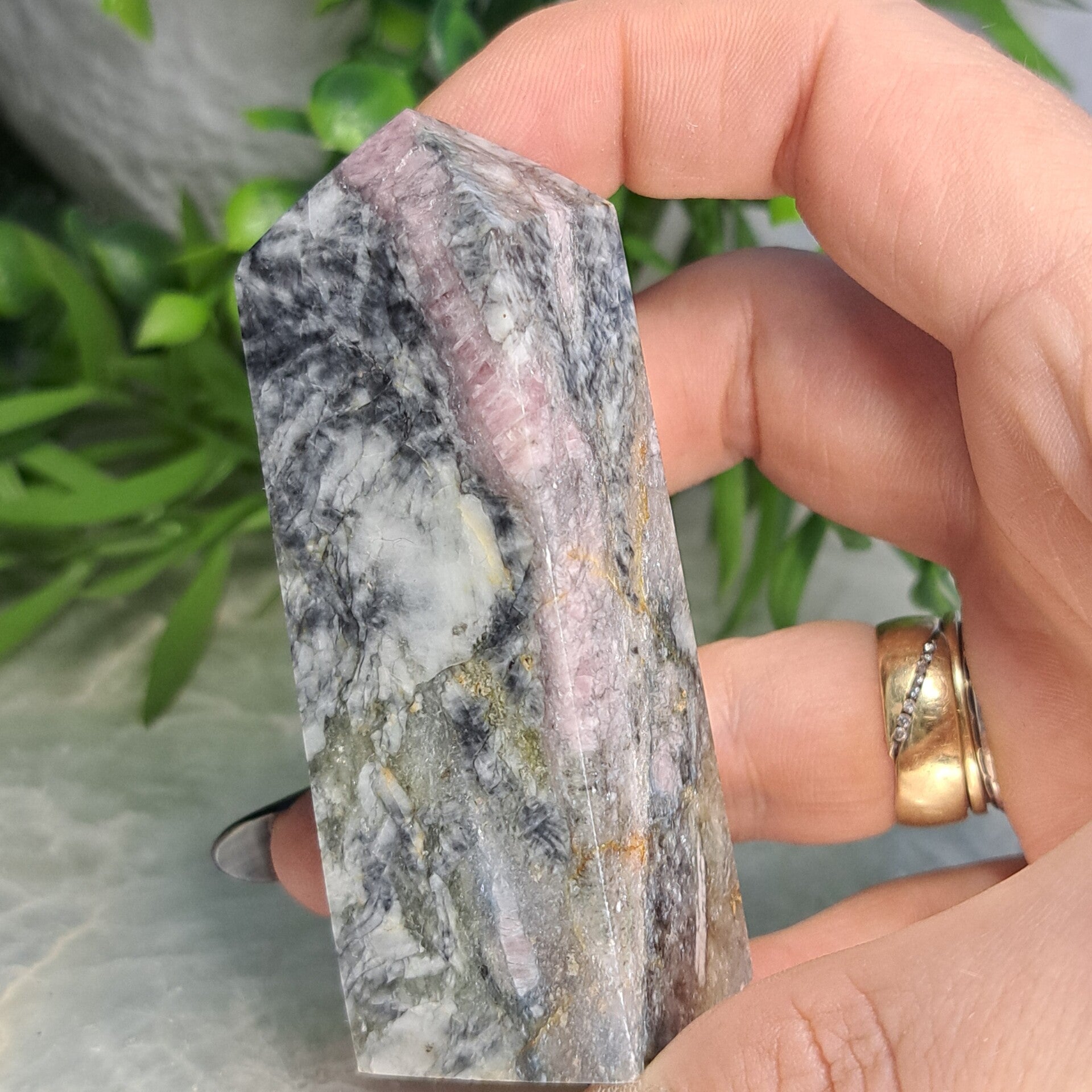 Deze mooie punt van roze toermalijn in grijze matrix is 139 gram en 8cm groot.