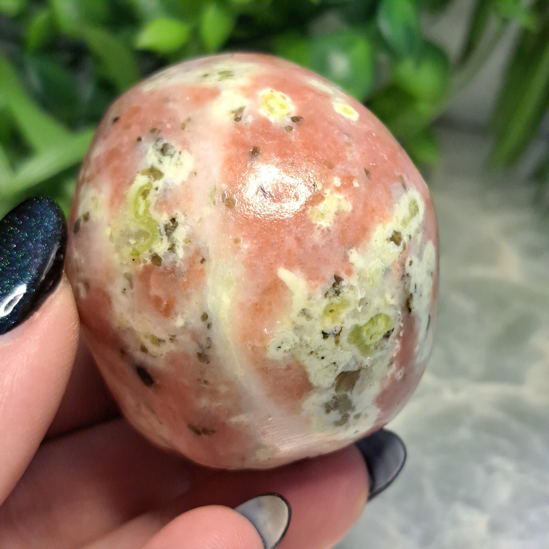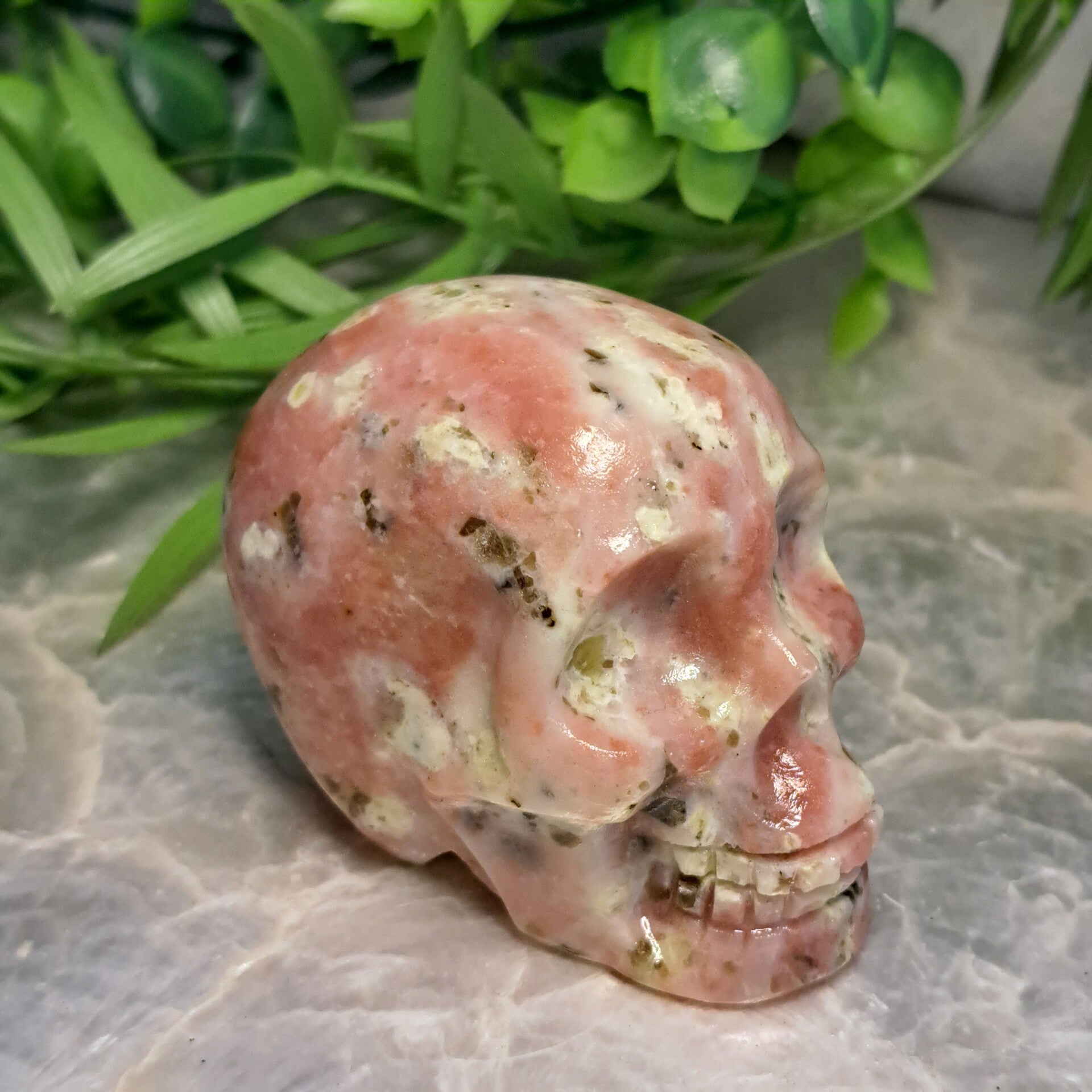 Deze gave Roze Aventurijn skull met groene insluitingen van serpentijn is 6,5 cm groot en weegt 193 gram.