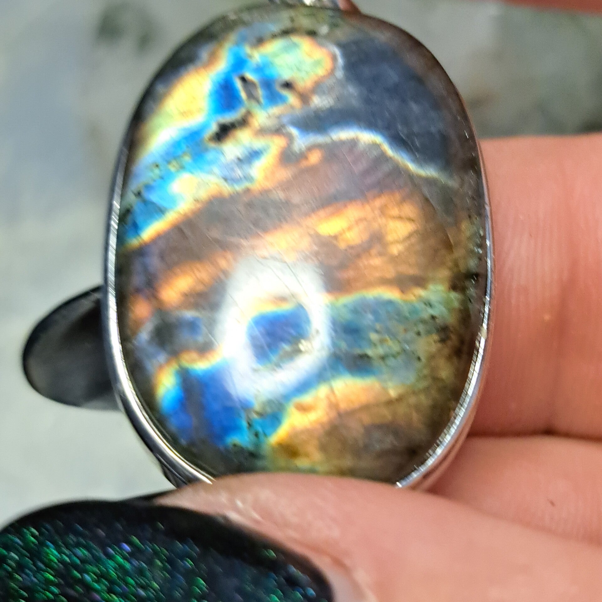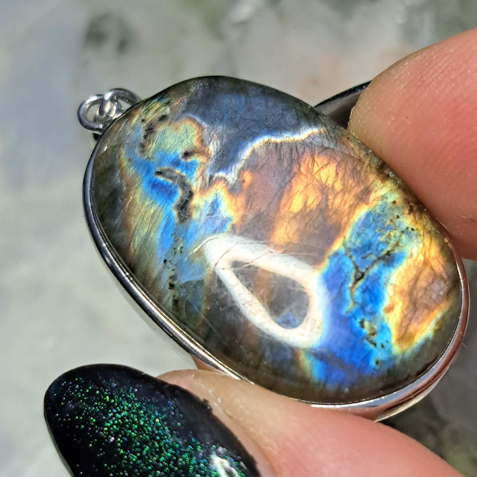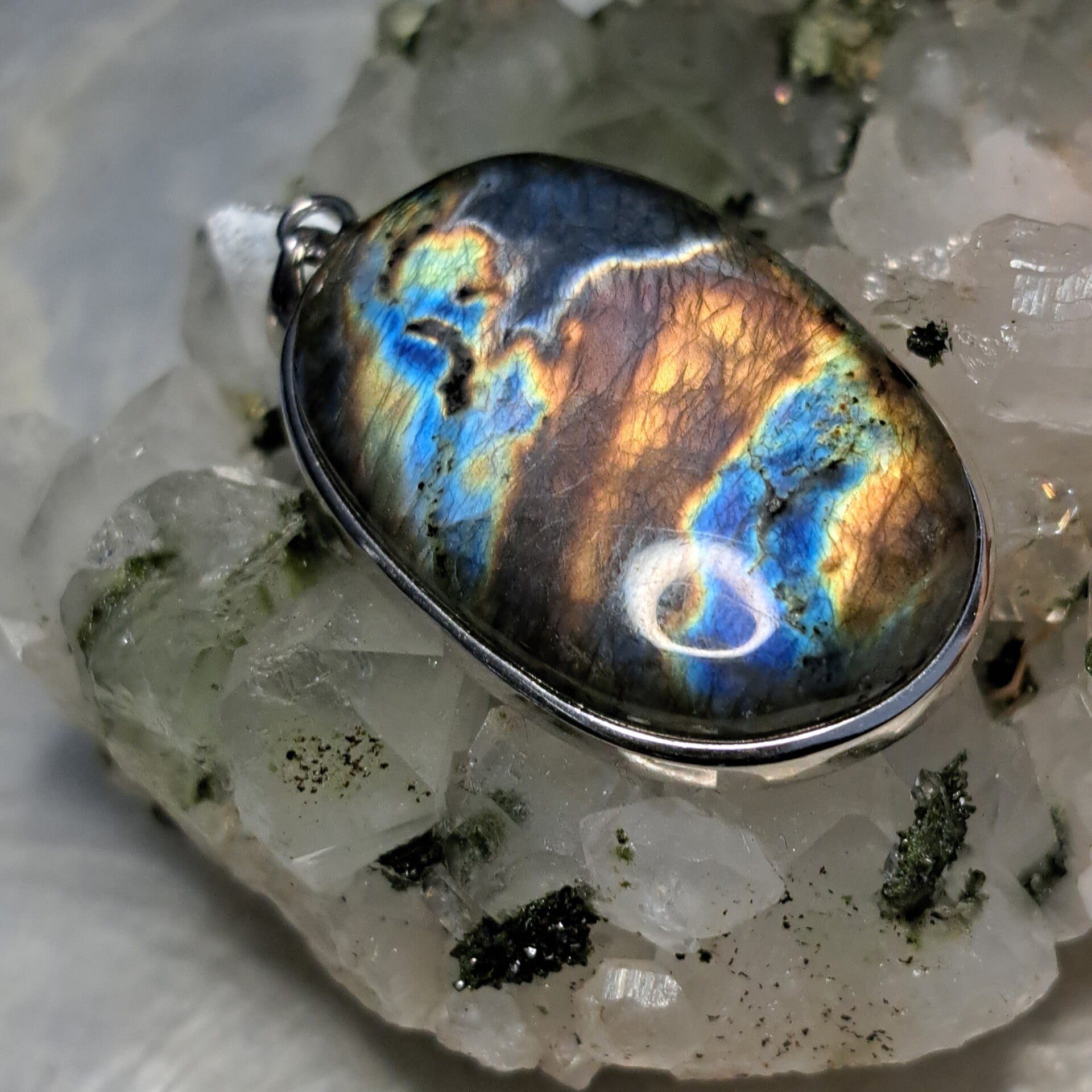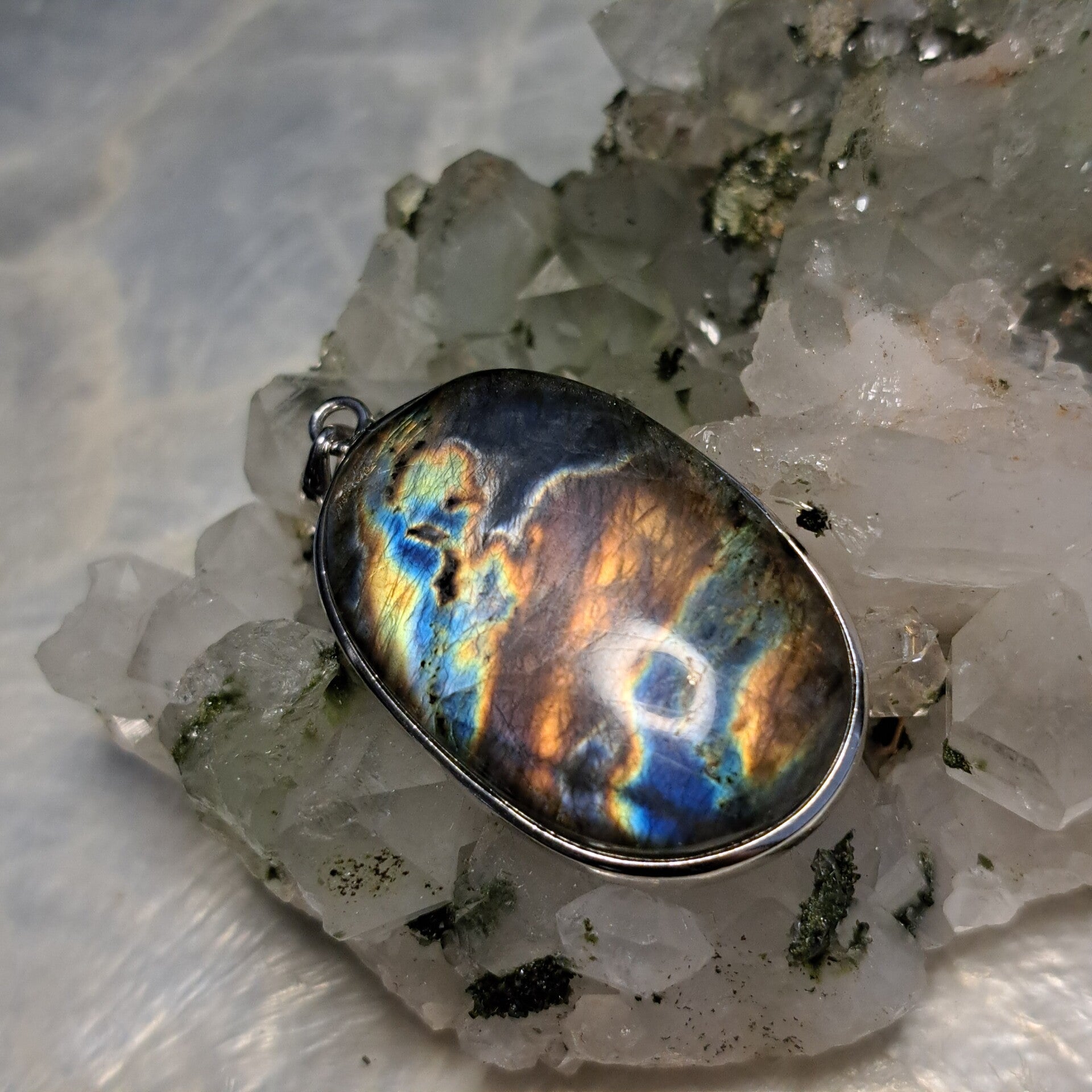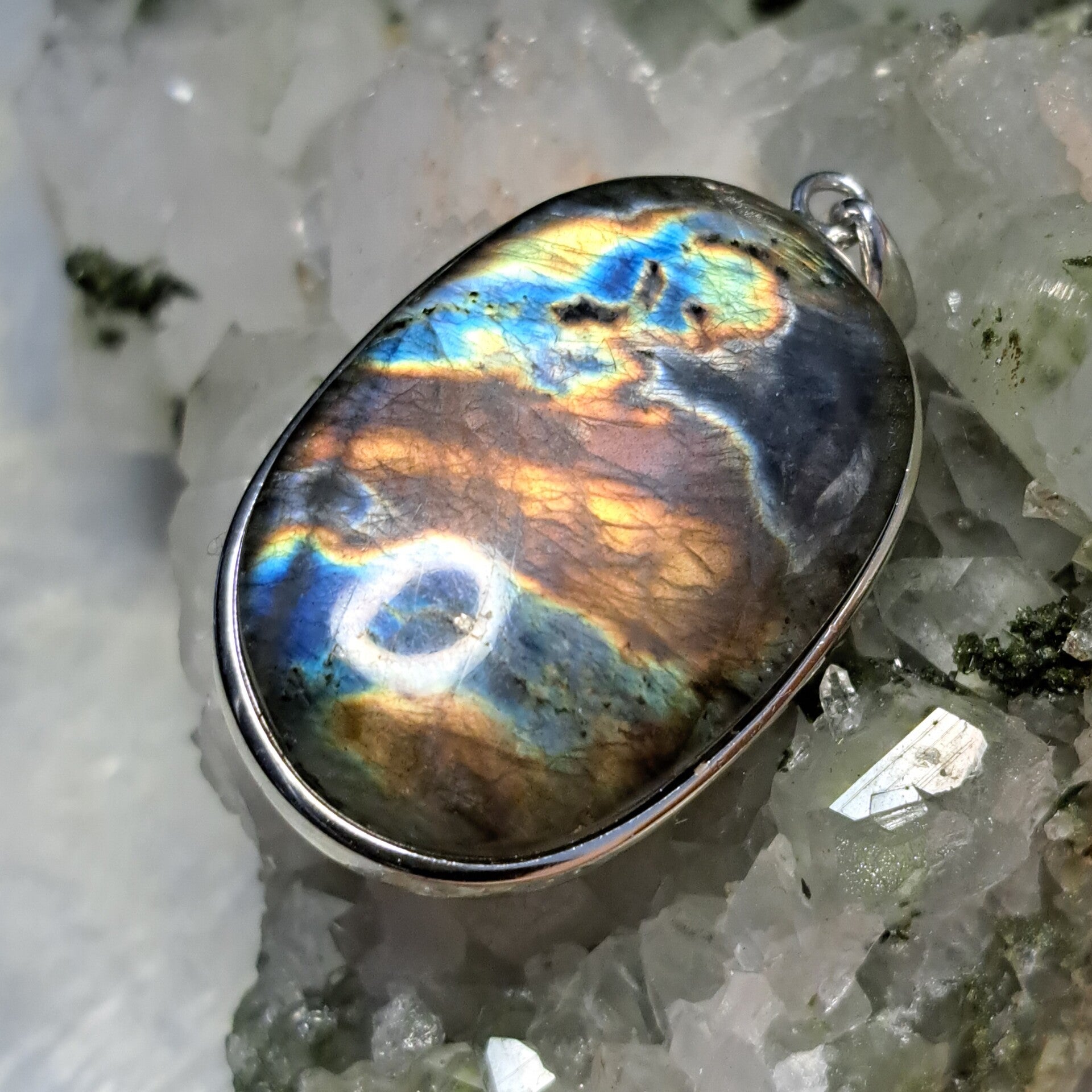 Mooie hanger van meerkleurige Flashy labradoriet in S925 zilver.