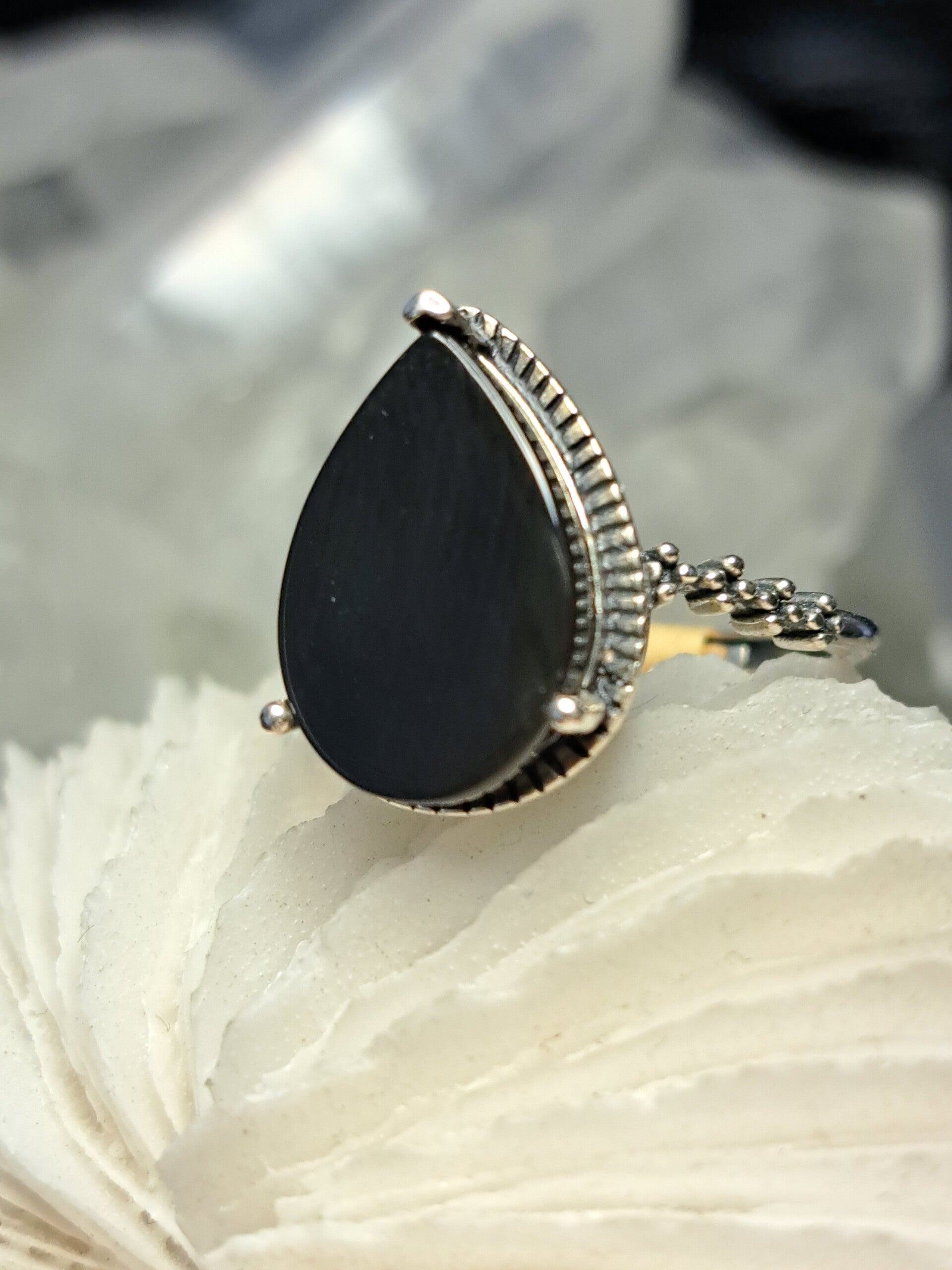 Deze ring met steen van Obsdiaan is van S925 zilver, is verstelbaar en draagbaar van maat 17 tot maat 18,5.