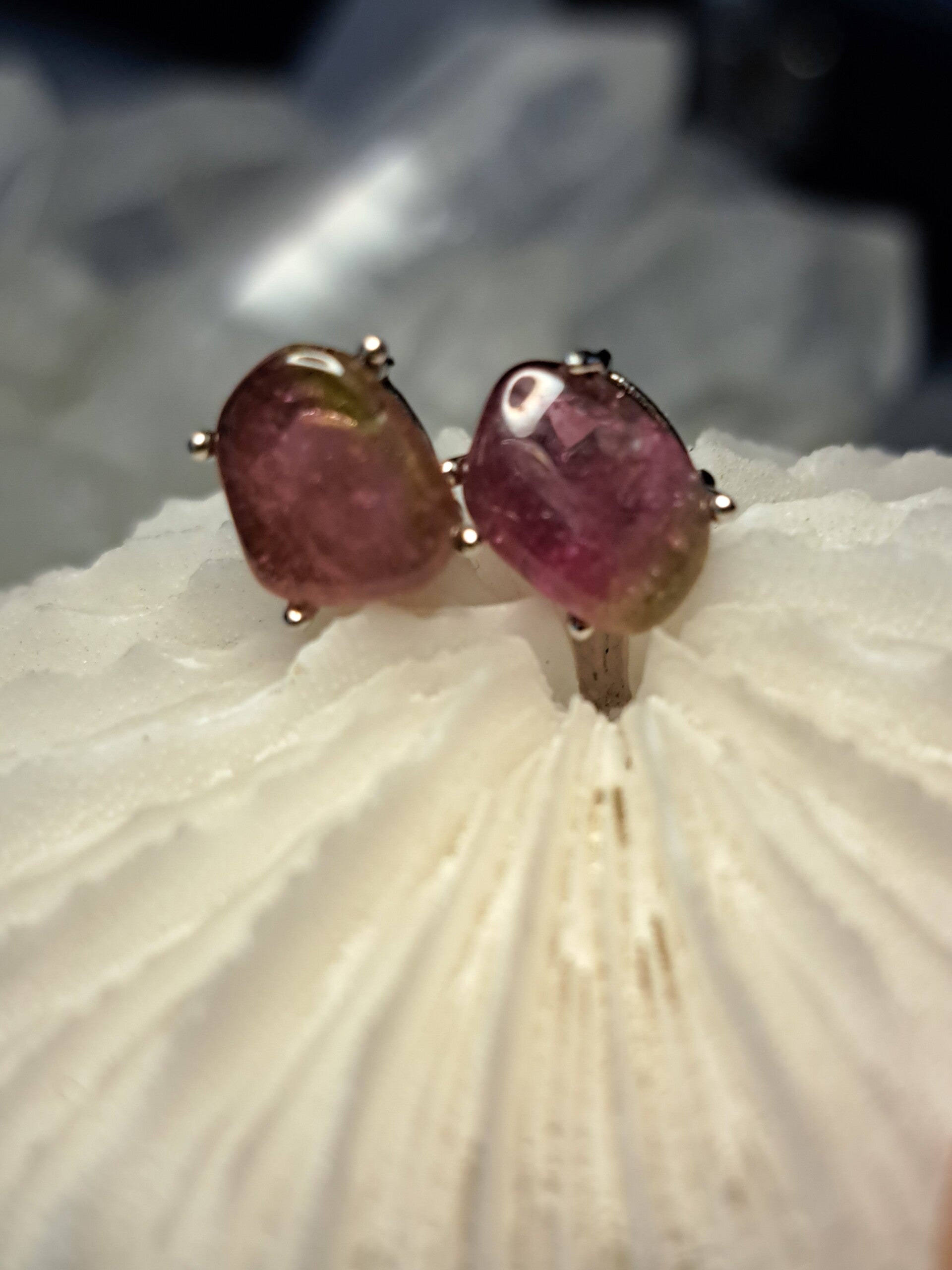 Deze mooie toermalijn knopjes van S925 zilver hebben de zogenoemde watermeloen kleur, dat wil zeggen roze toermalijn met een groen toermalijn randje. Ze zijn bijna 1 cm groot.