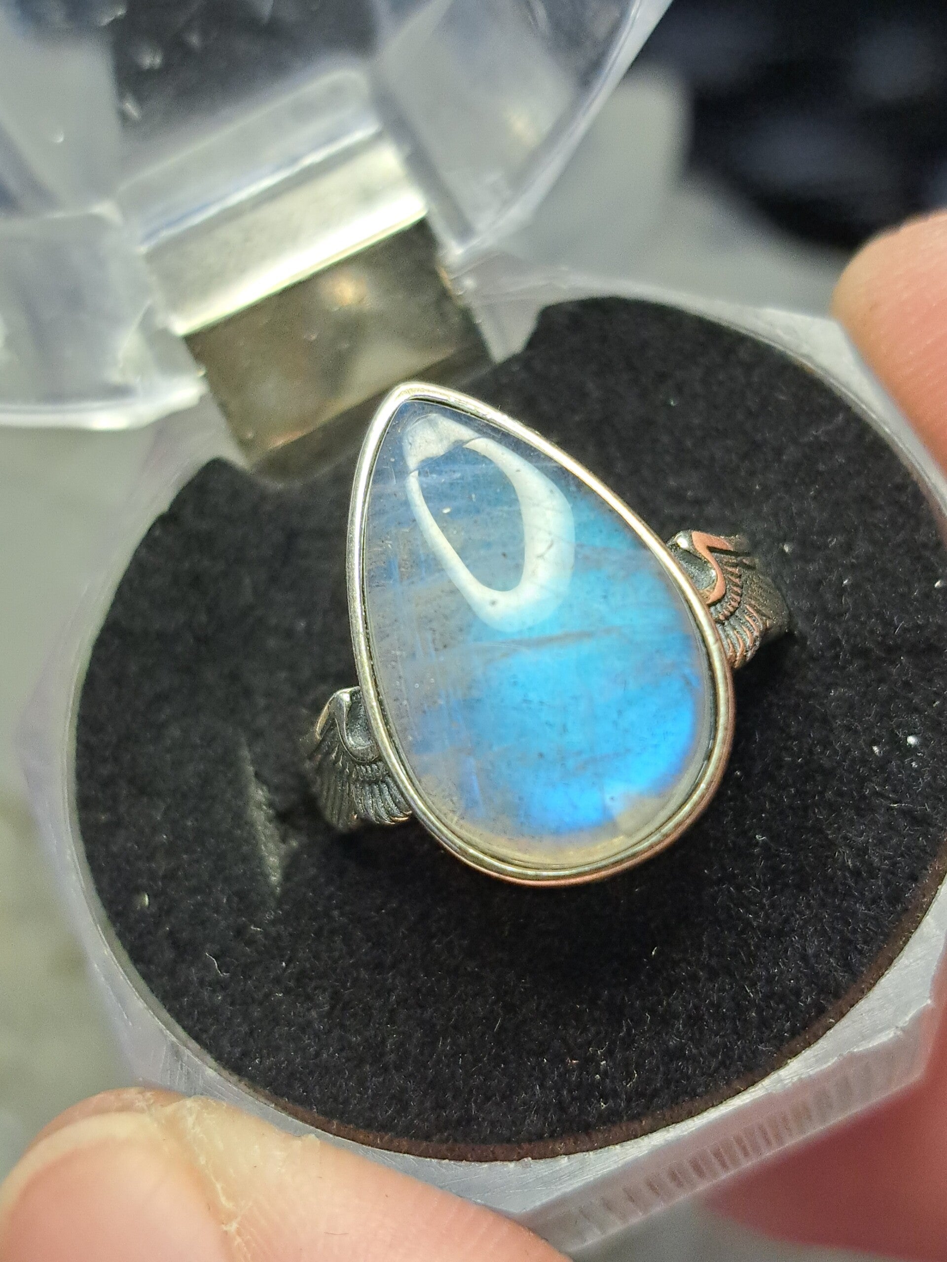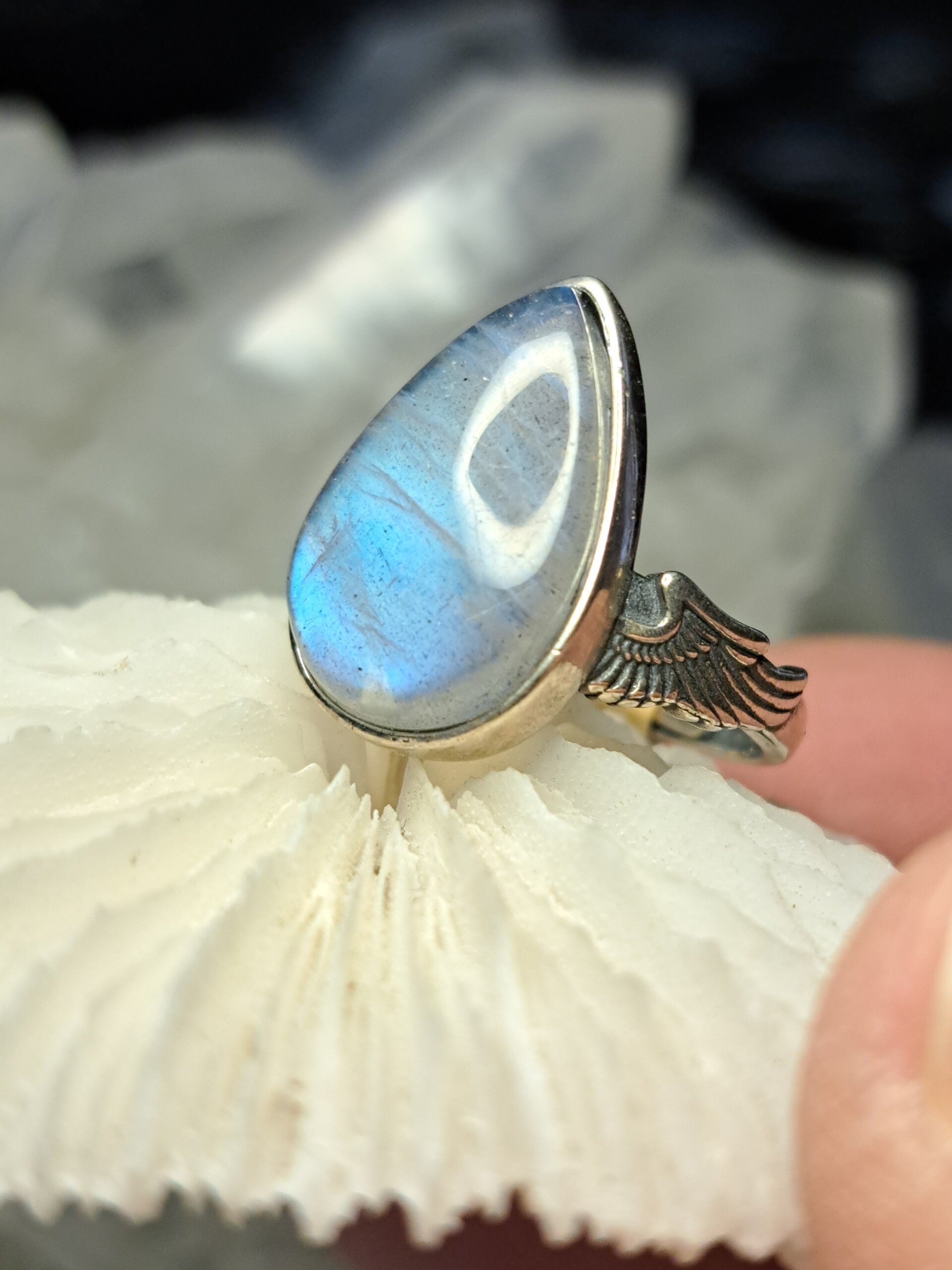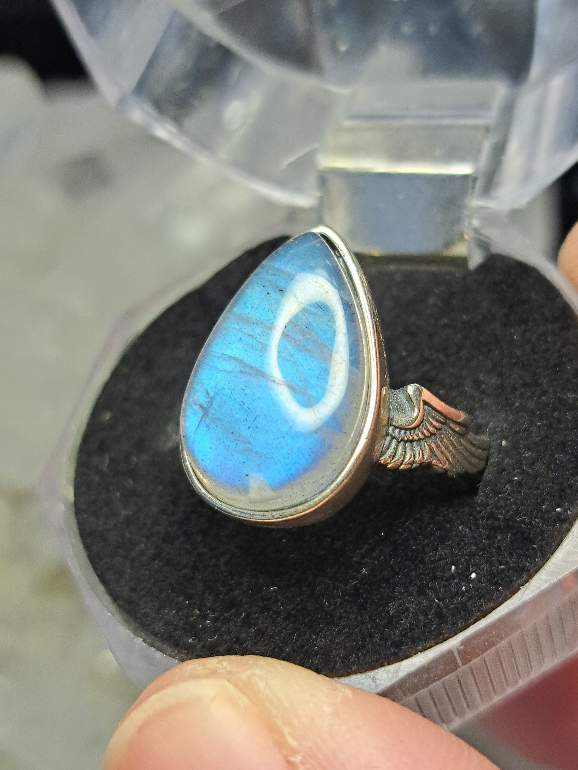 Deze mooie ring met vleugels is van S925 zilver en de steen is van Labradoriet met gave blauwe flash.