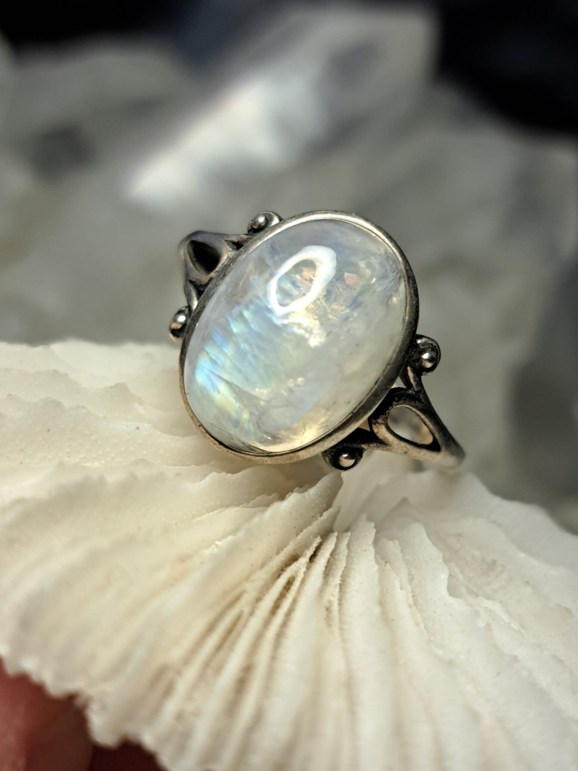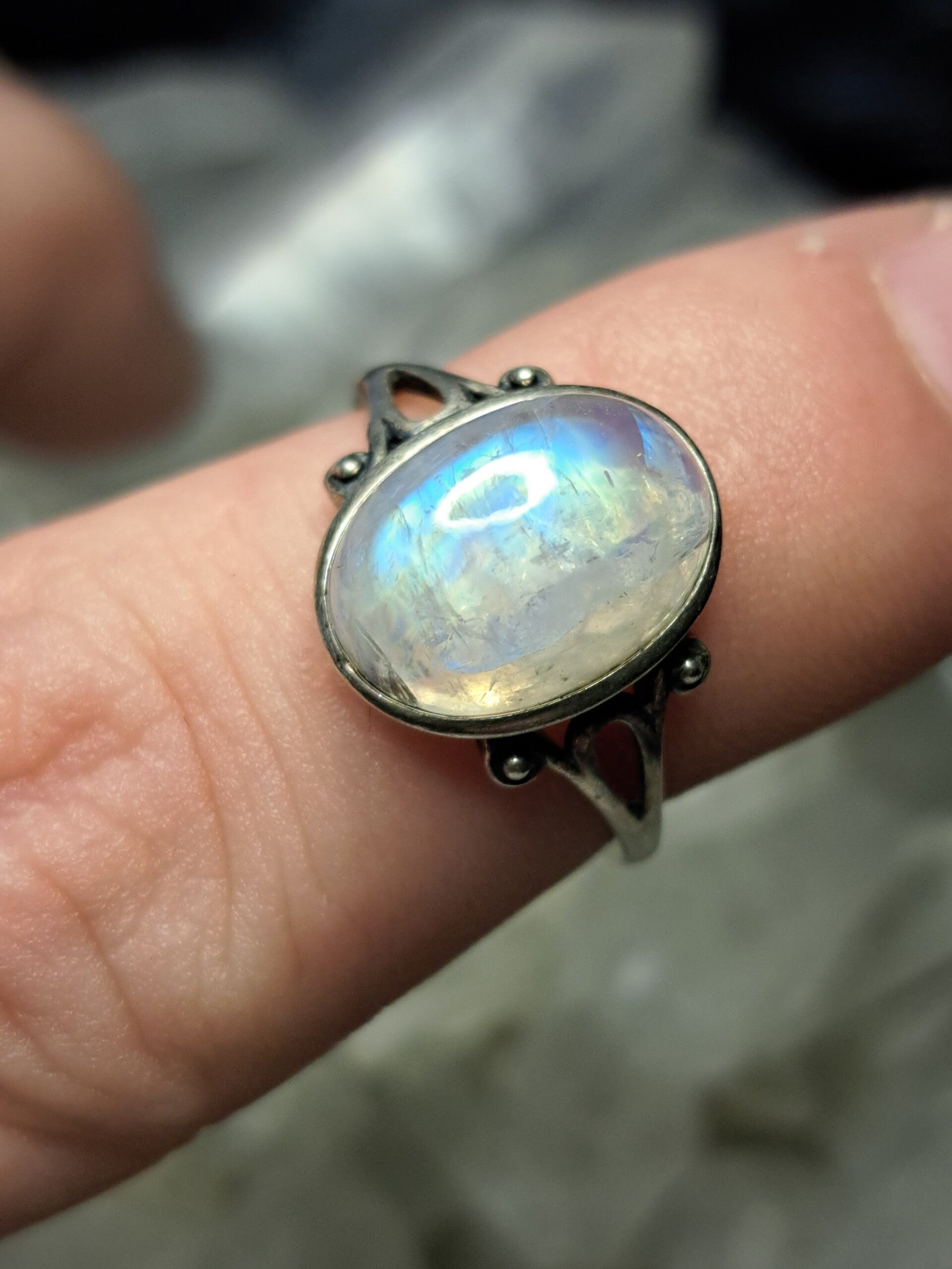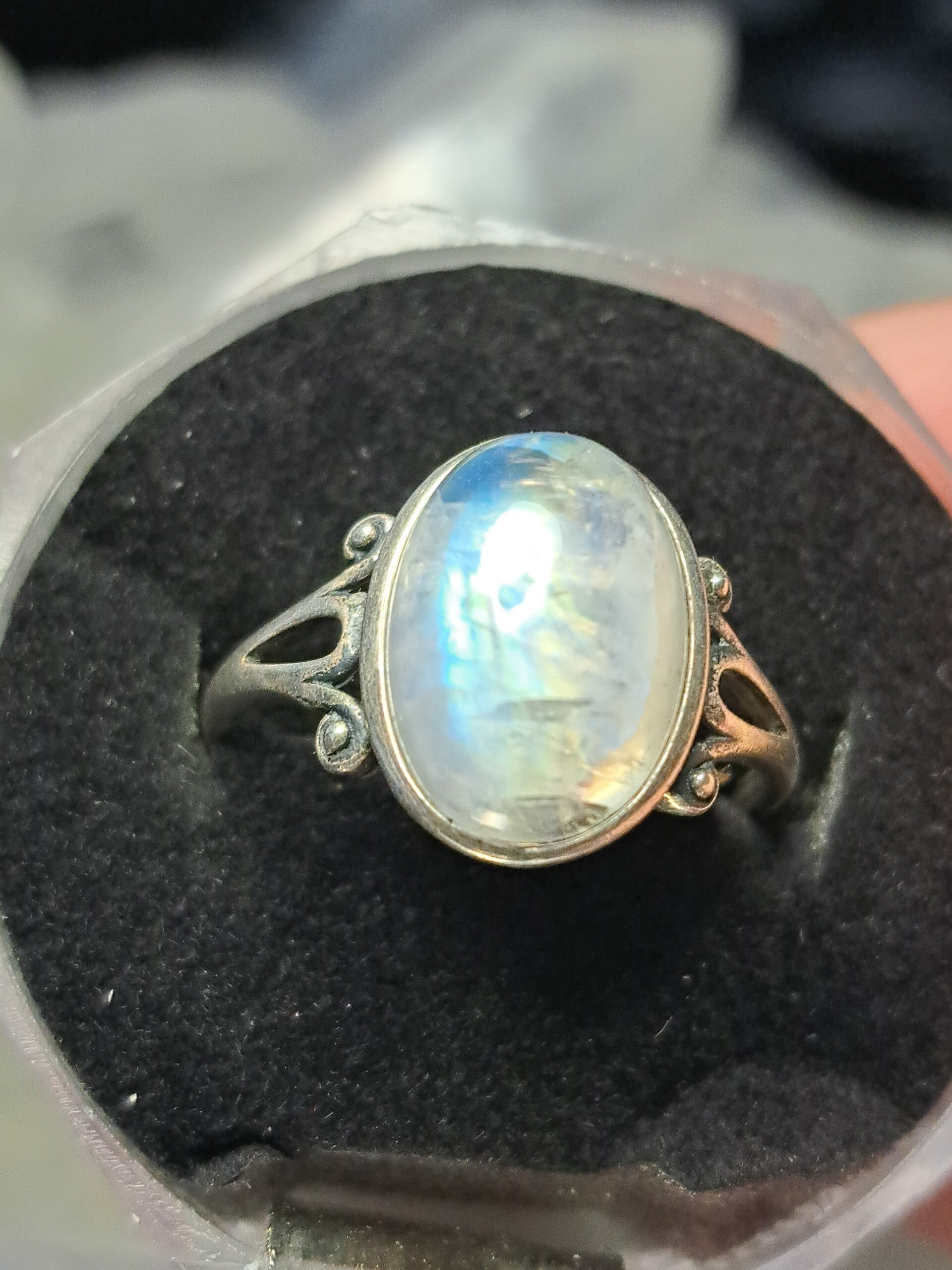 Deze gave ring van S925 zilver heeft een maansteen met regenboogkleurige flash en is verstelbaar. Draagbaar van maat 17 tot maat 18.