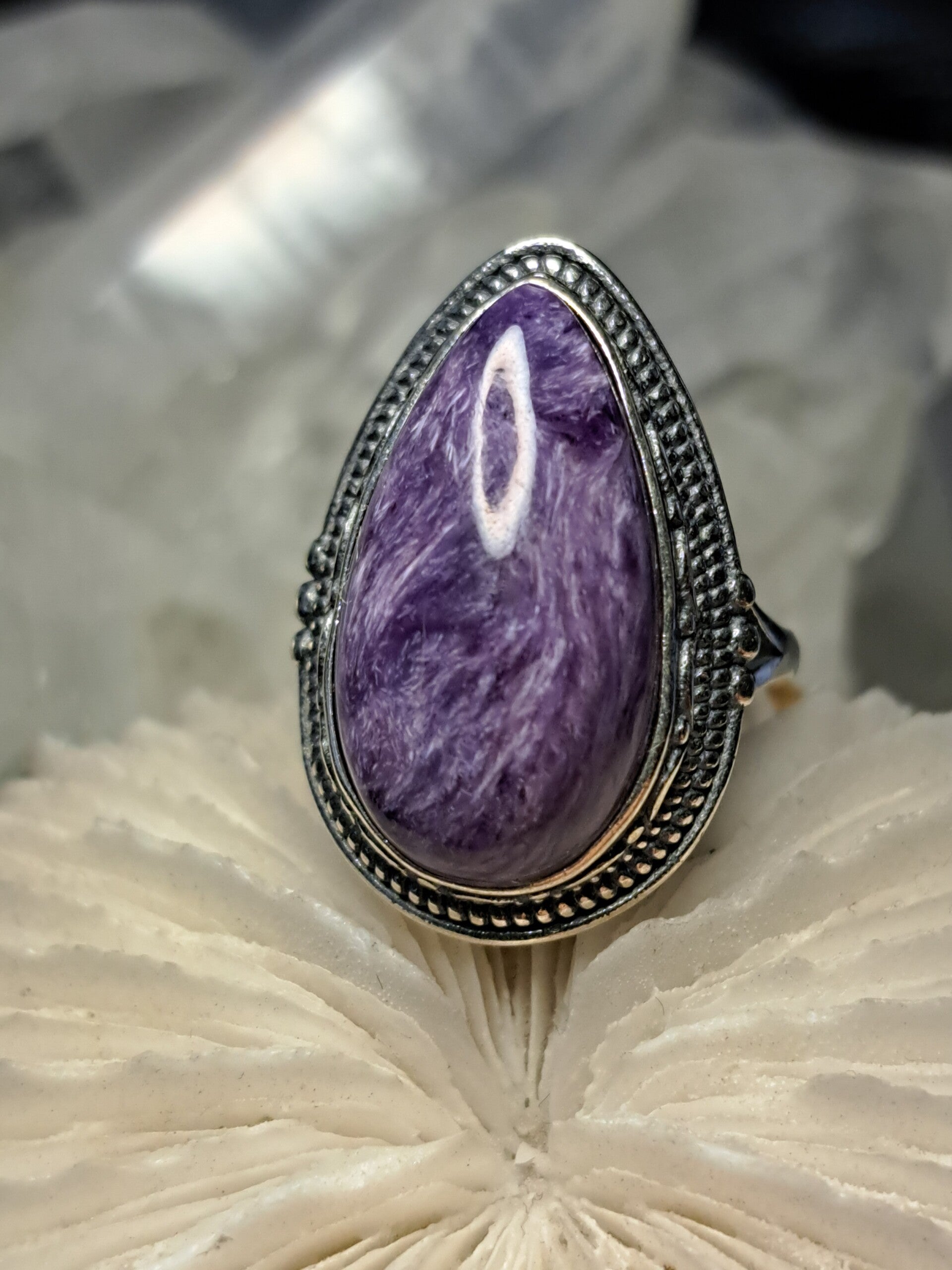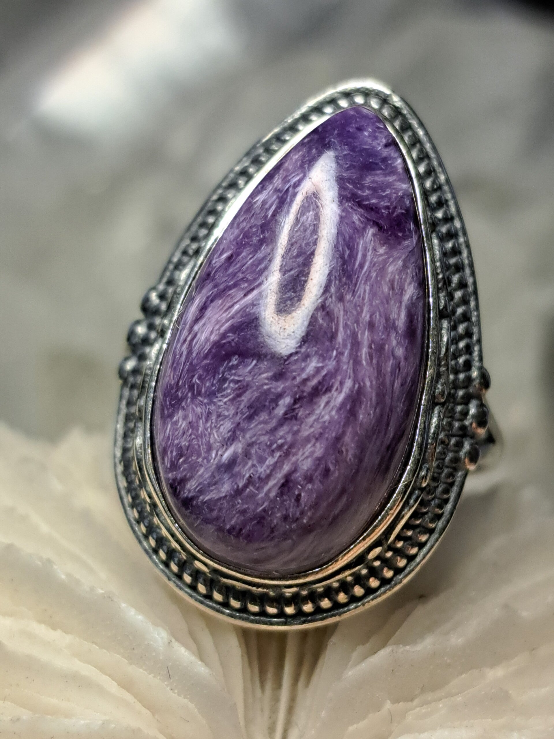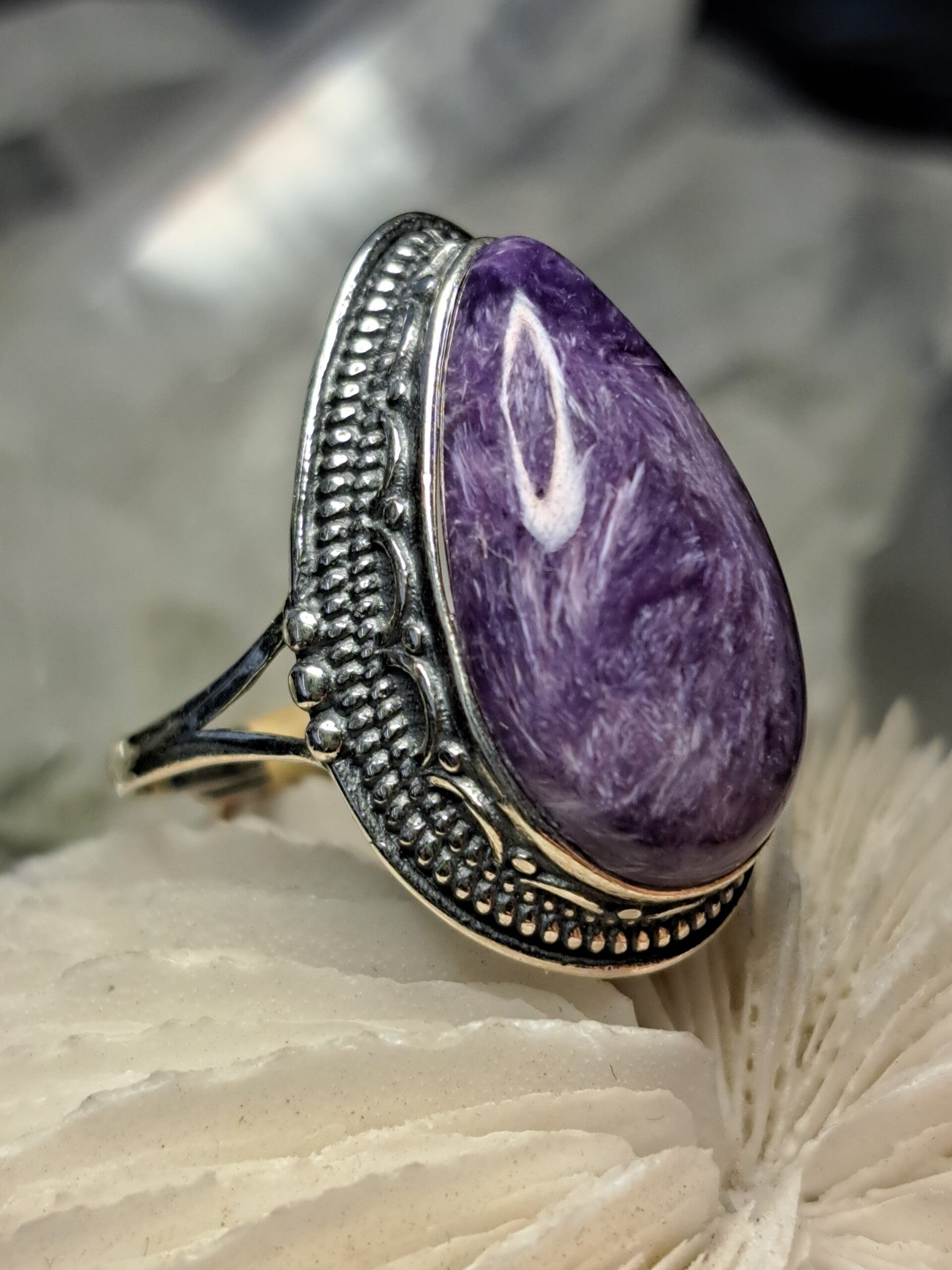 Charoiet staat symbool voor ontdekking van je spirituele zielspad. Het is een combinatie van verschillende mineralen en is een gehydrateerd kalium- calcium sillicaat. Charoiet is een vezelig mineraal en de kleur kan variëren van licht- tot donkerviolet, soms blauwviolet, met gouden, lichtbruine, donkergroene, grijze of zwarte insluitsels.