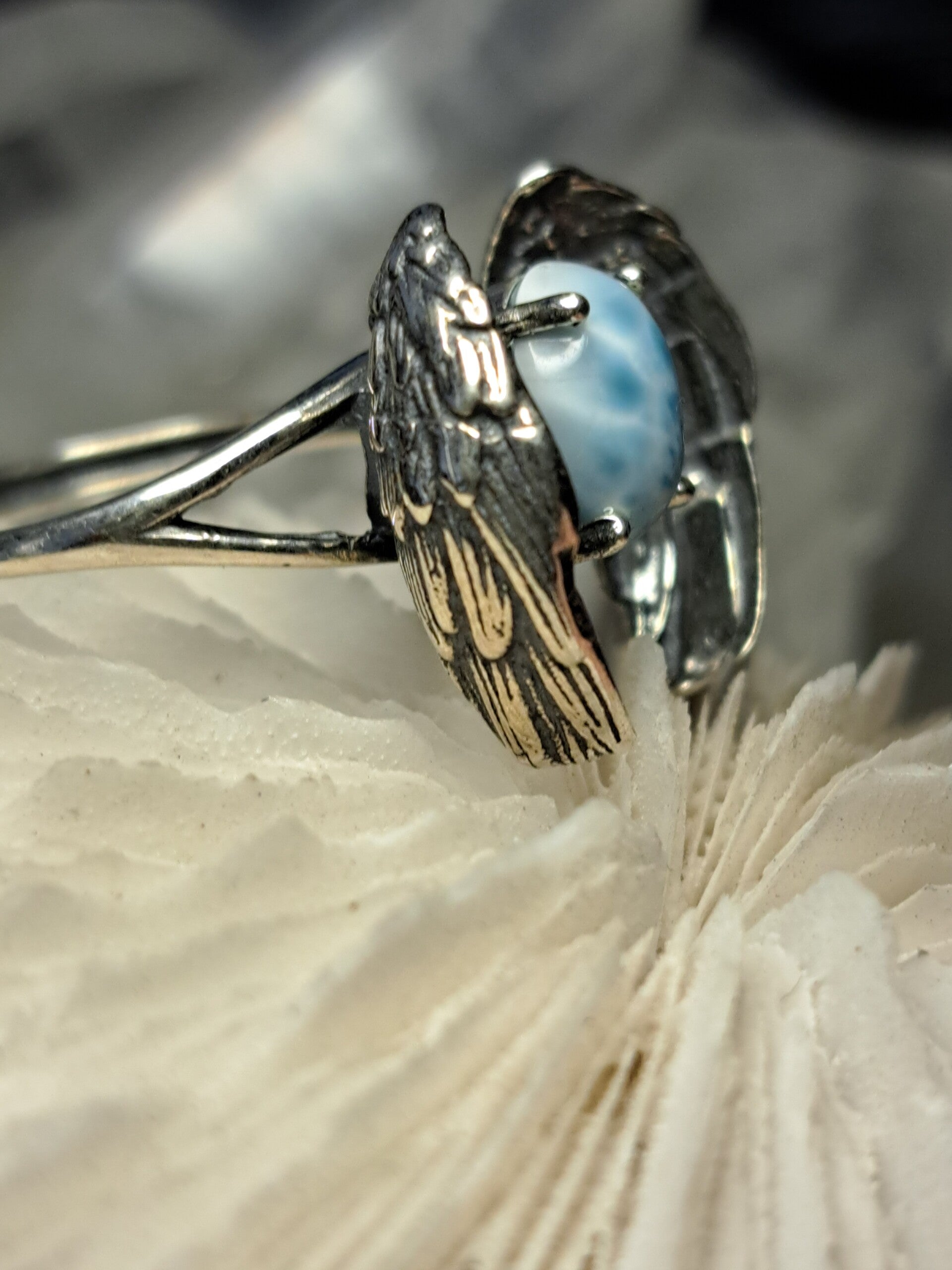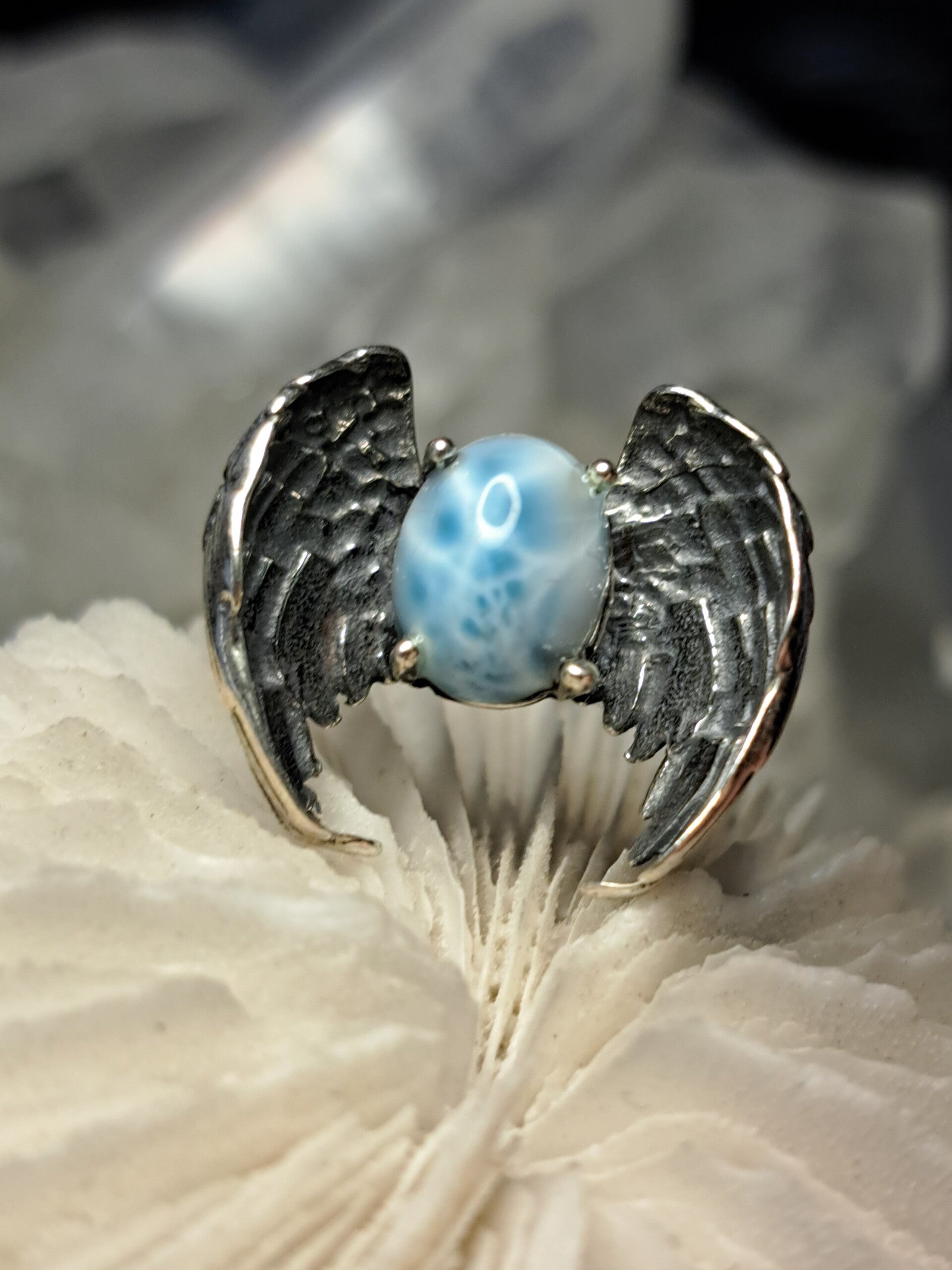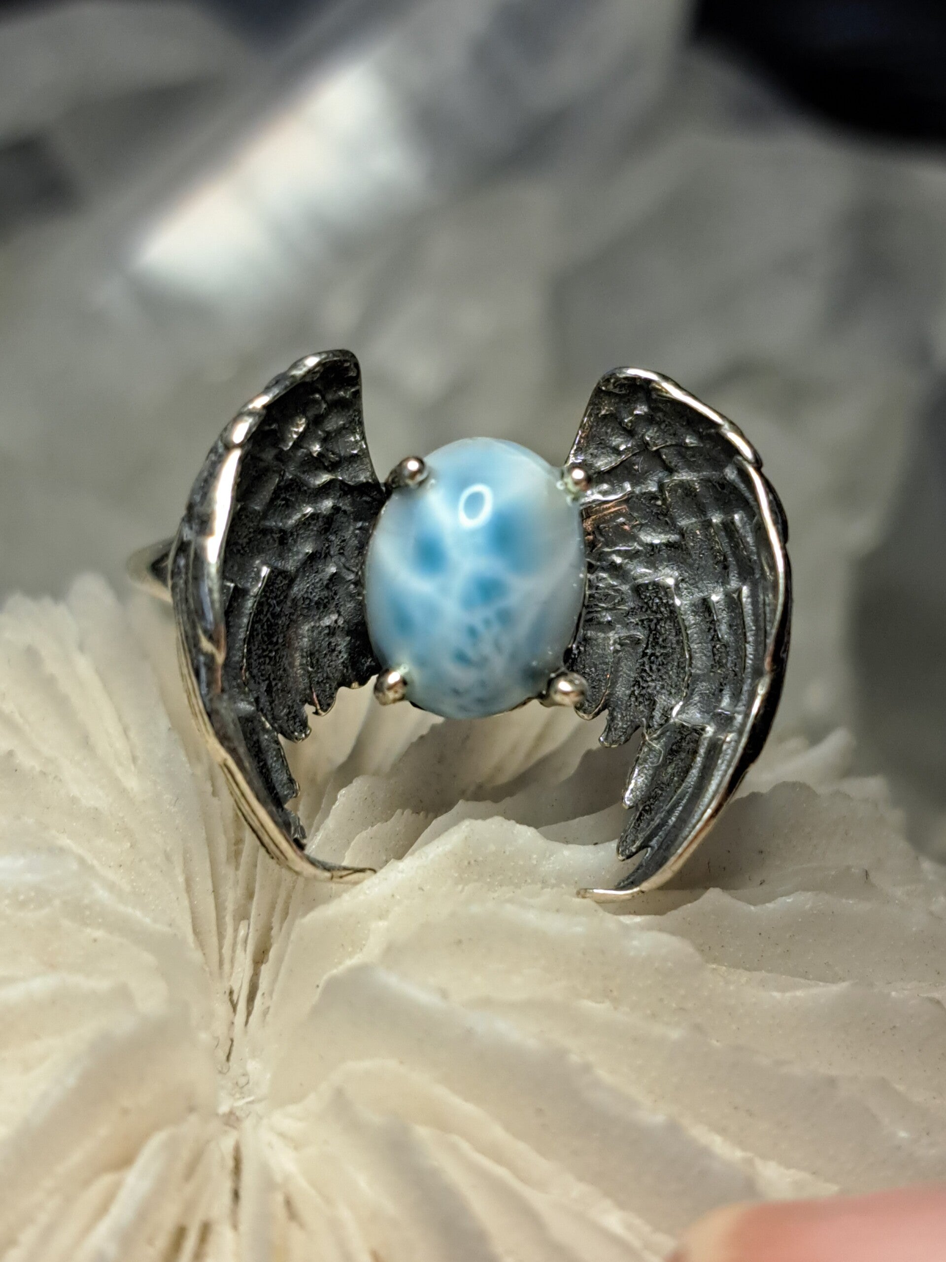 Deze prachtige ring van S925 zilver heeft een paar vleugels die een bolletje van larimar dragen. Verstelbaar en draagbaar van maat 17 tot maat 18,5.