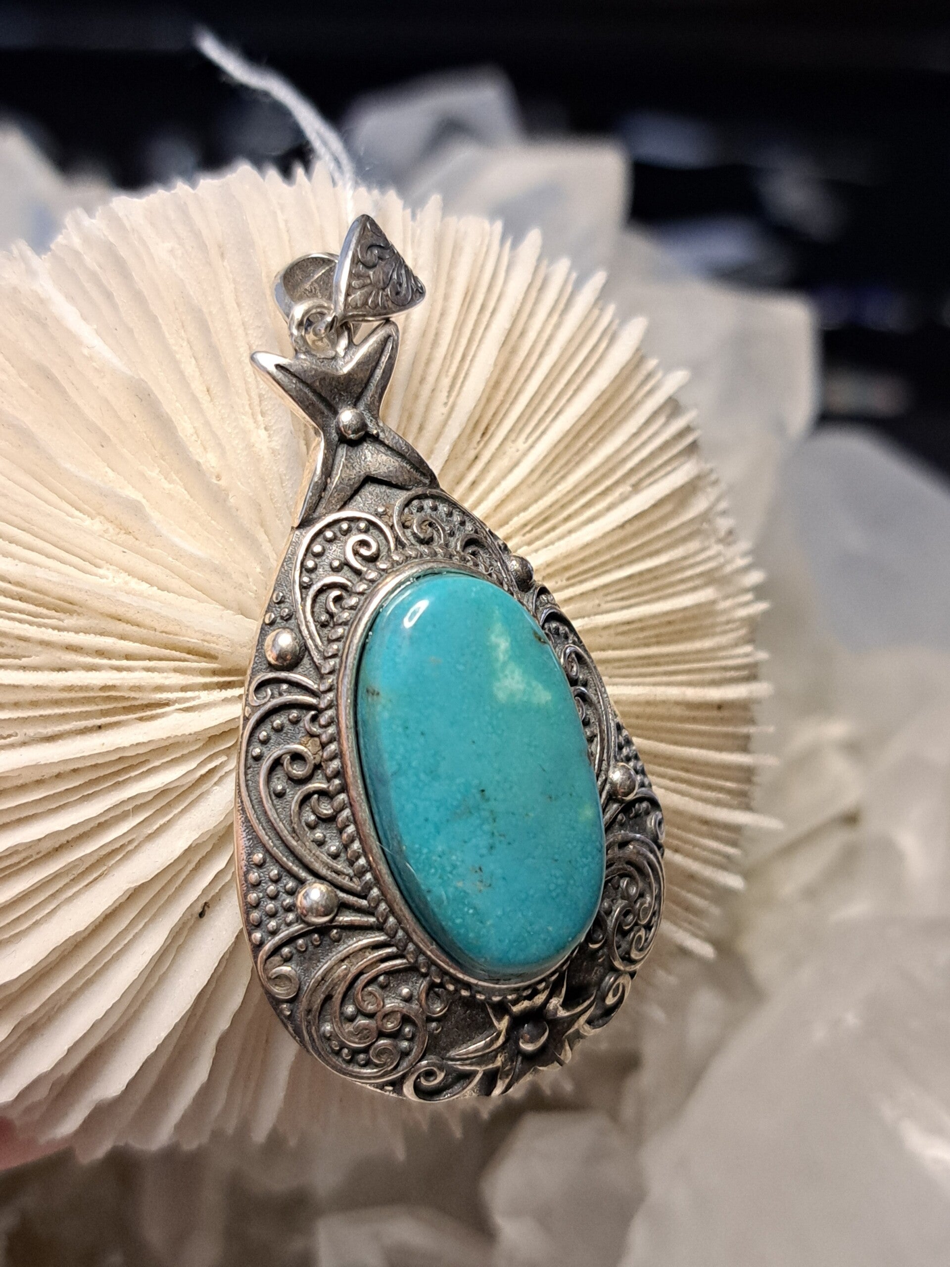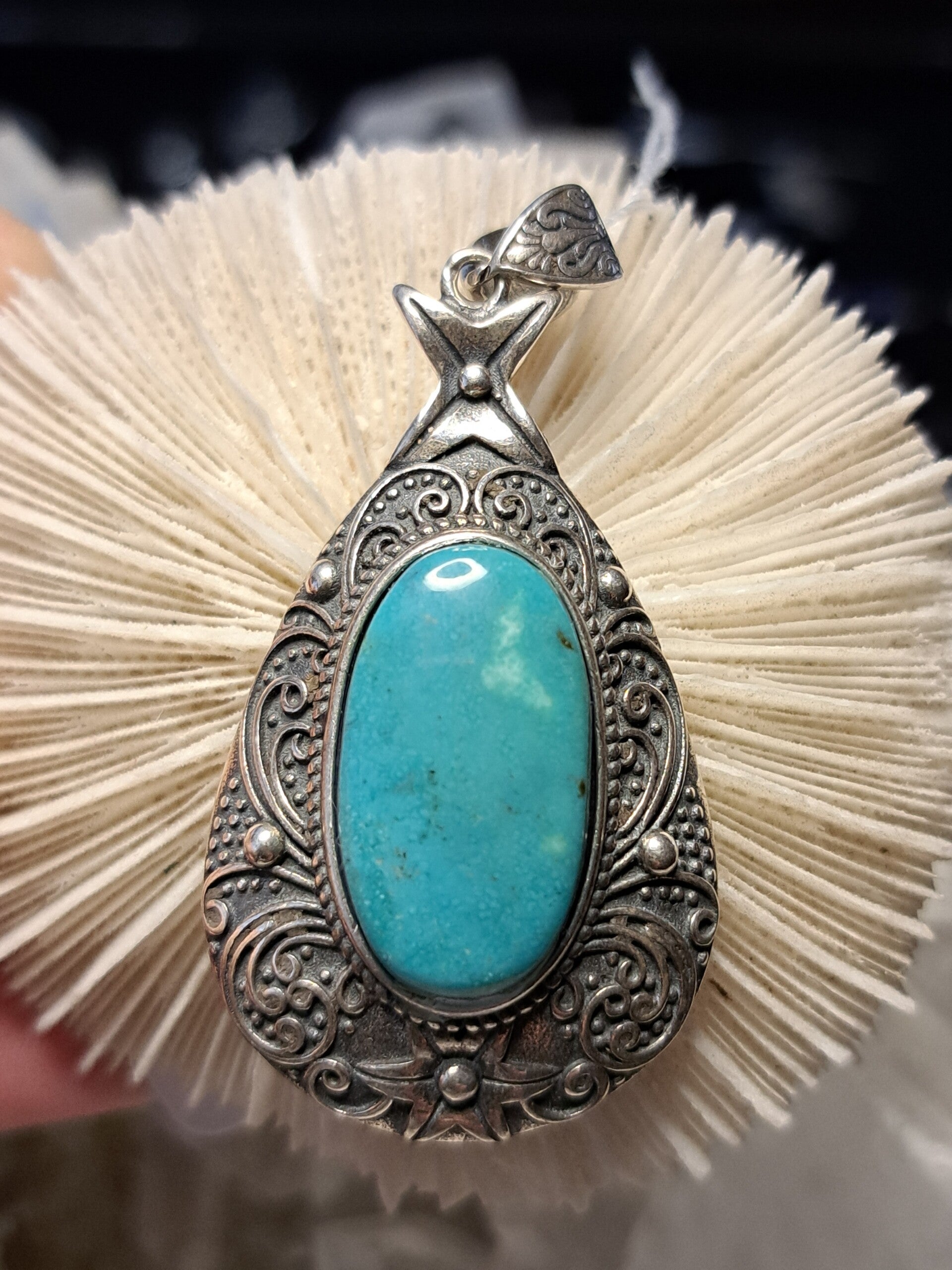Deze mooie hanger is van 925 zilver en deze turkoois komt uit Hubei China. De hanger is totaal 5cm groot.