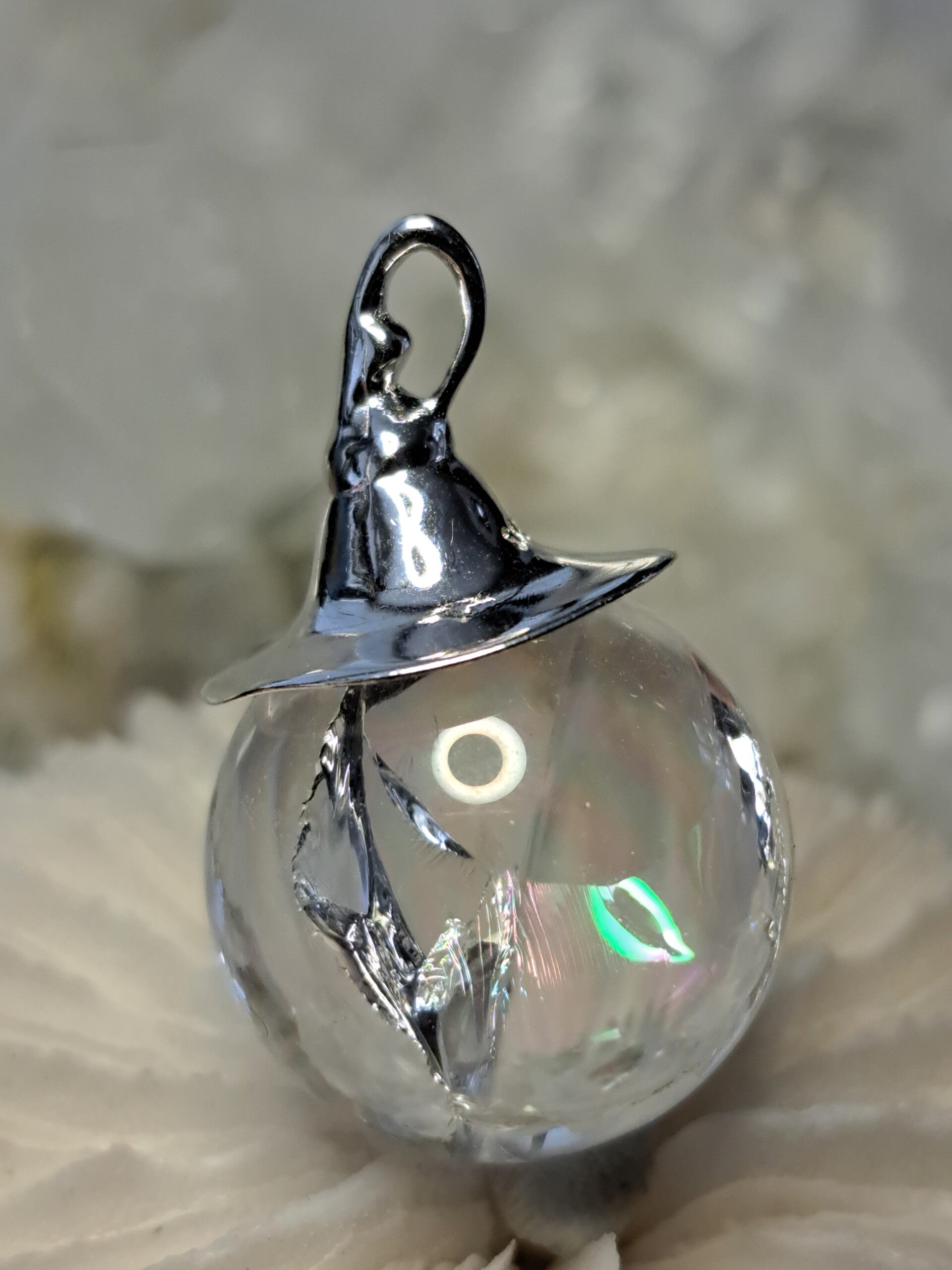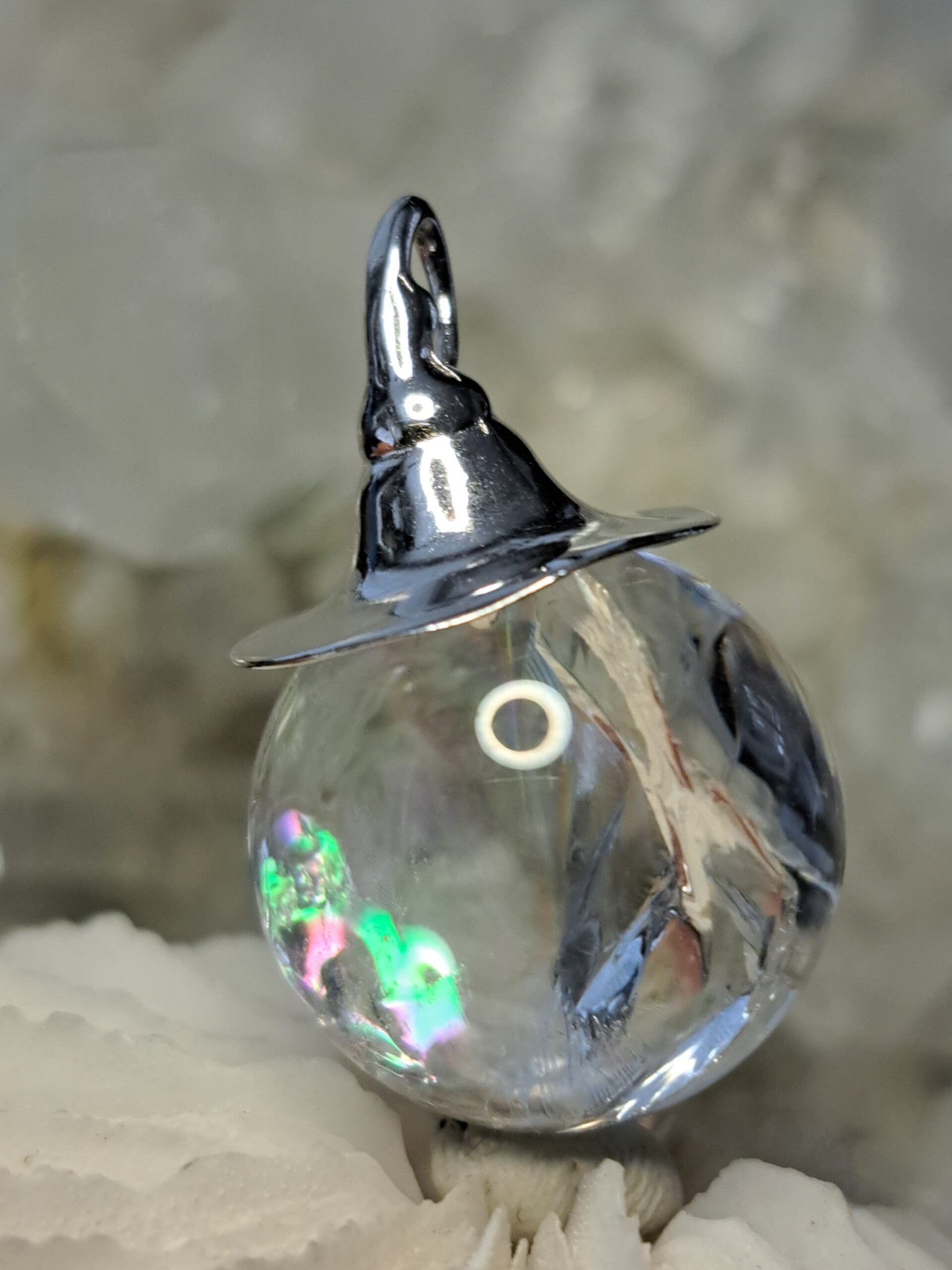 Deze mooie hanger met een kwarts bolletje met interne regenboogprima´s is 2,9 cm groot en heeft een S925 zilveren hoedje.
