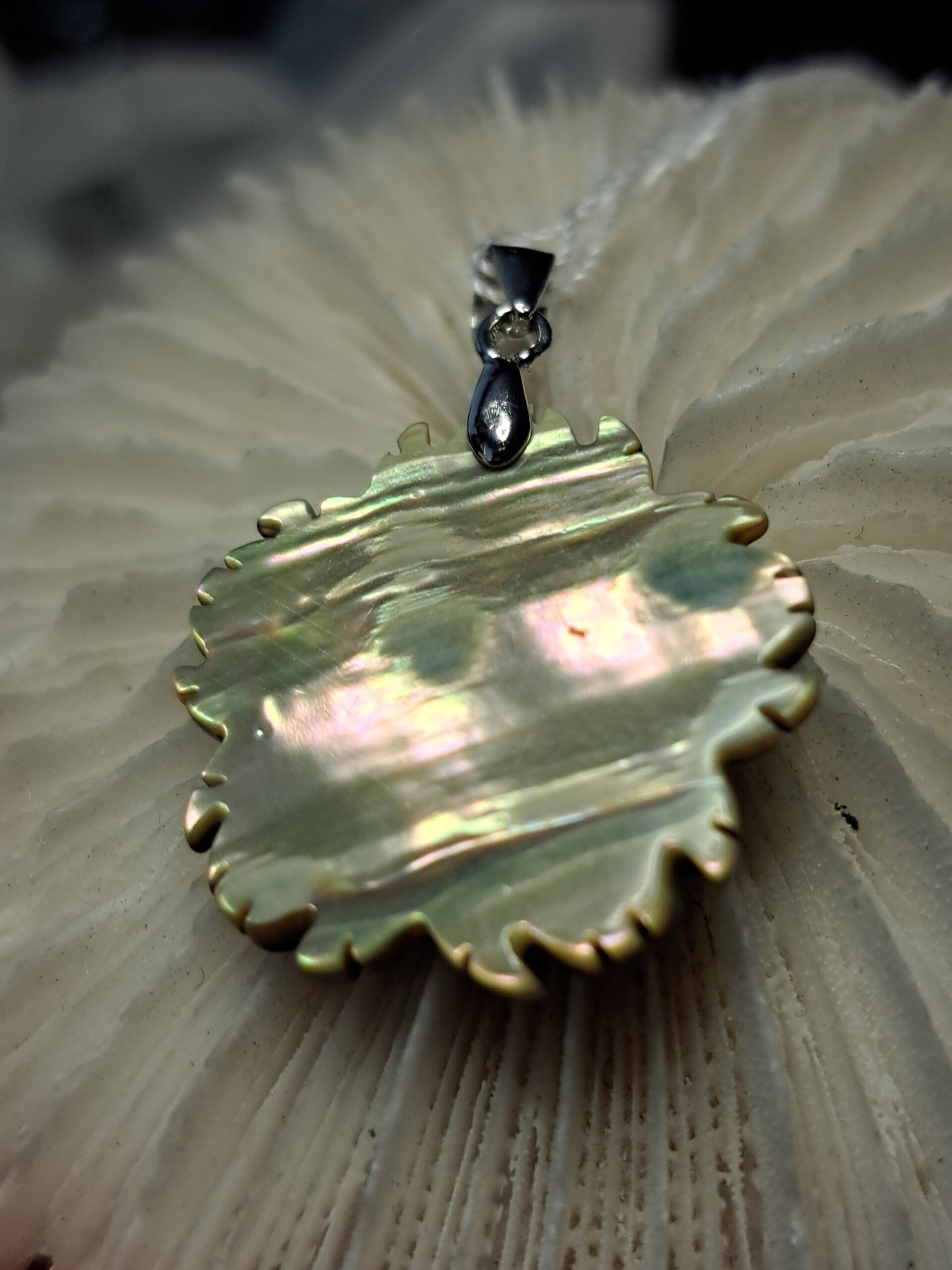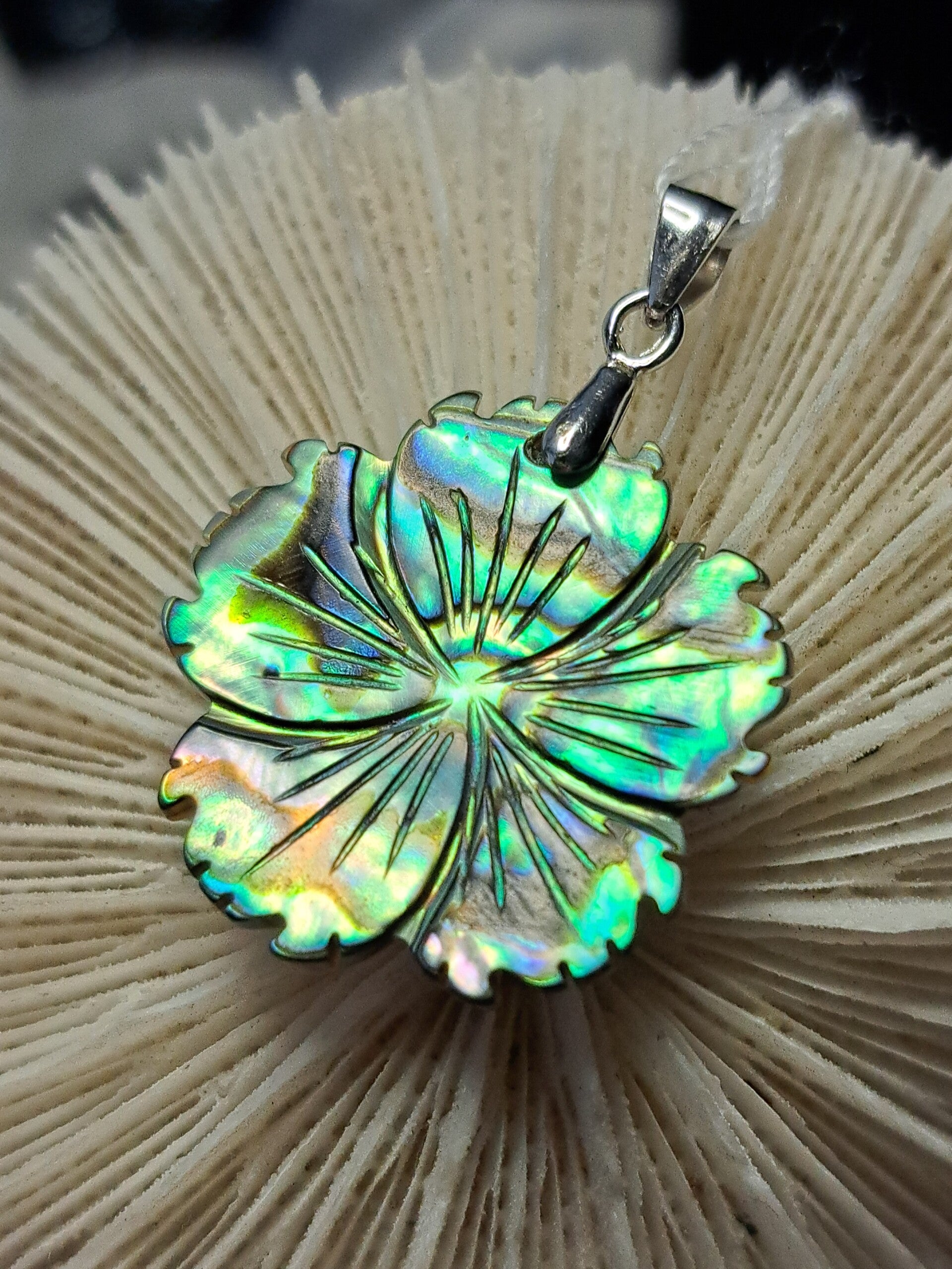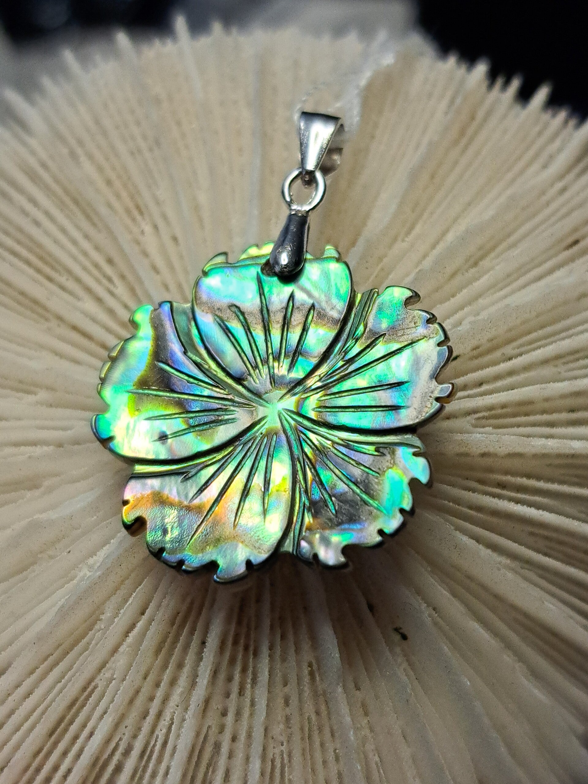 Abaloon of Paua genoemd, is het parelmoer van een zeeoor schelp en heeft een schitterend spectrum van kleuren. Varierend van groen, blauw tot zelfs regenboog kleuren en vaak ook nog met prachtige patronen..