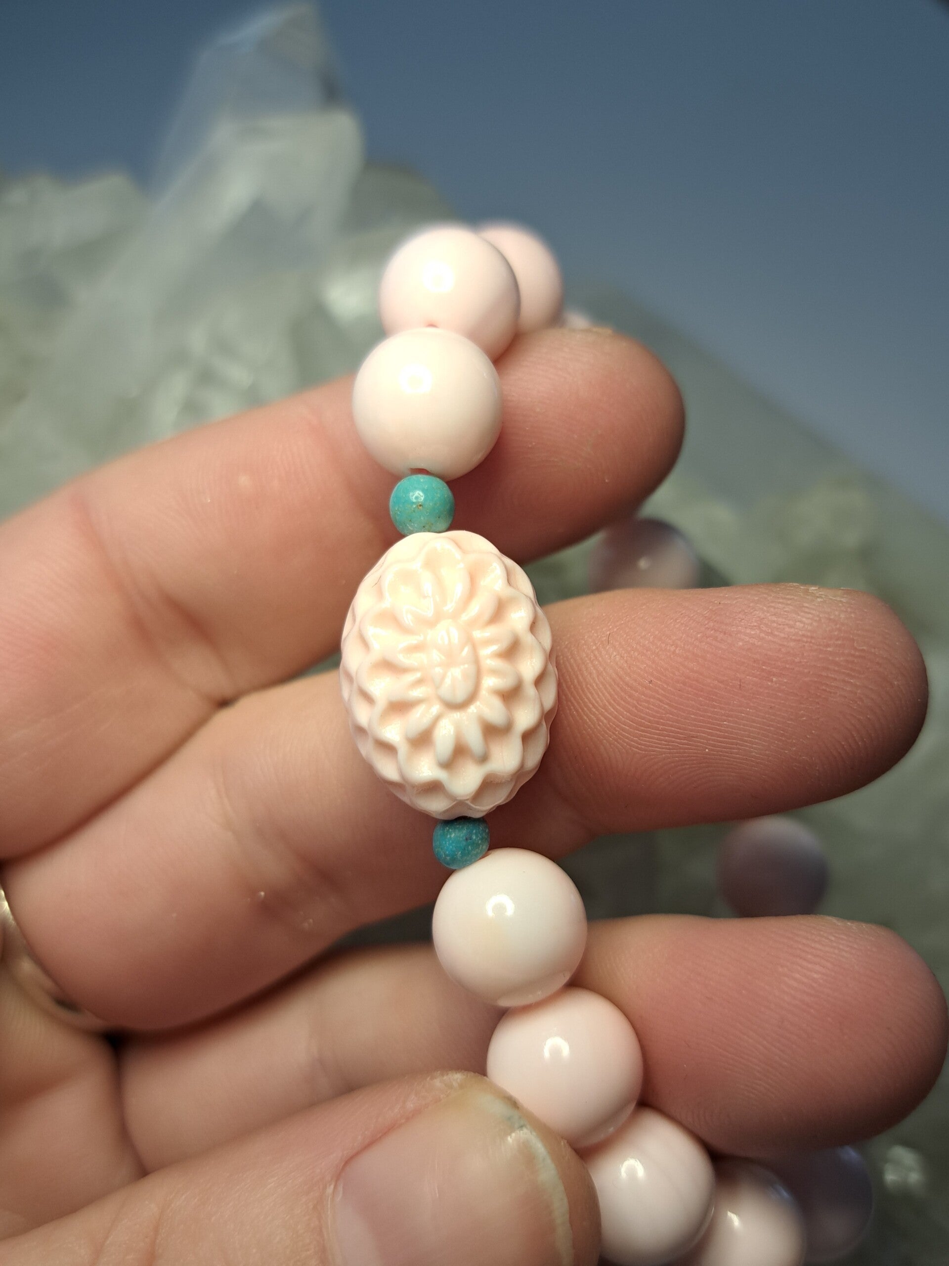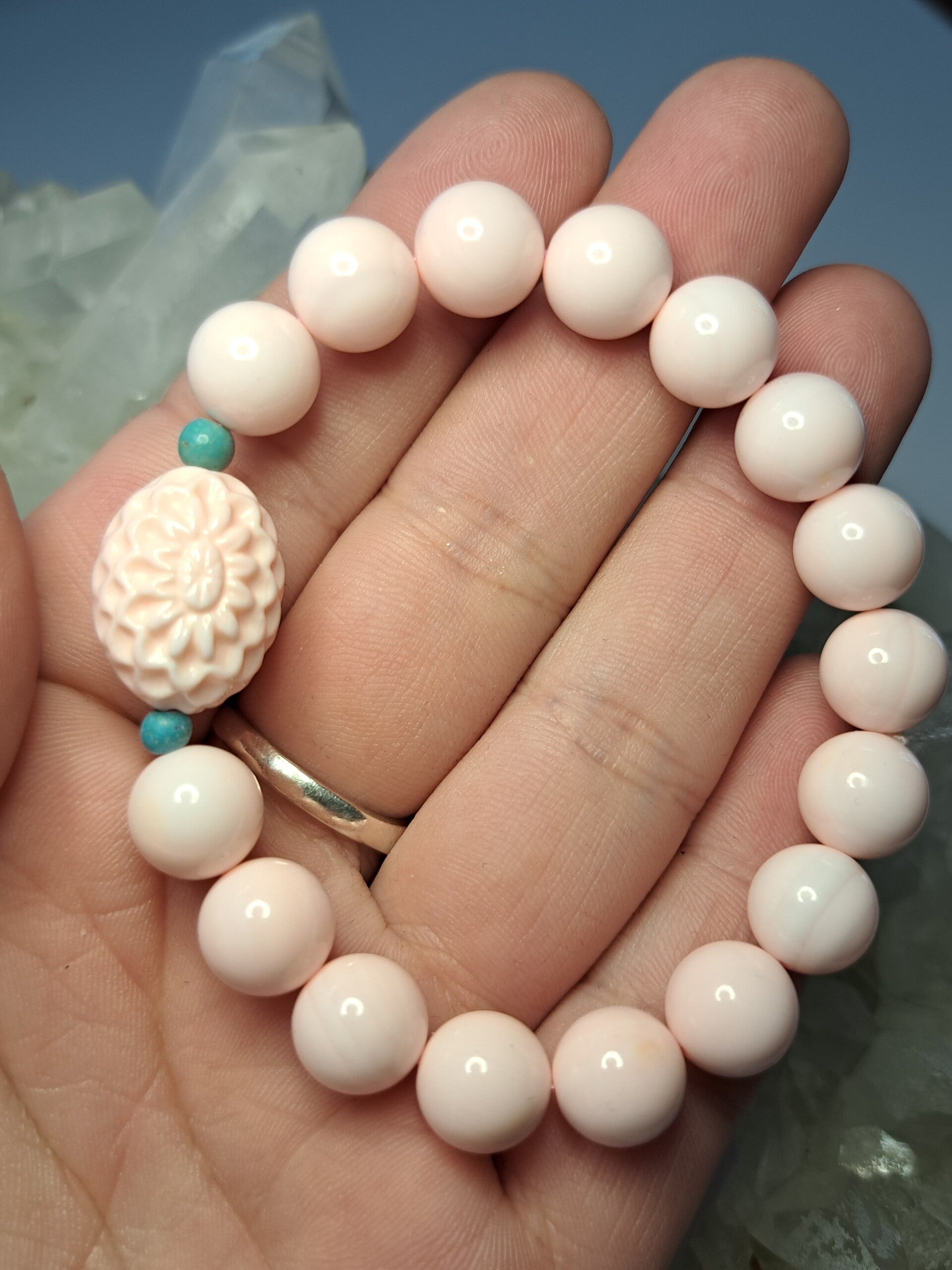 Deze gave elastische kraalarmband heeft kralen van 10mm en een grote handgeslepen kraal in bloemmotief in het midden en ingesloten door 2 turkoois kraaltjes.