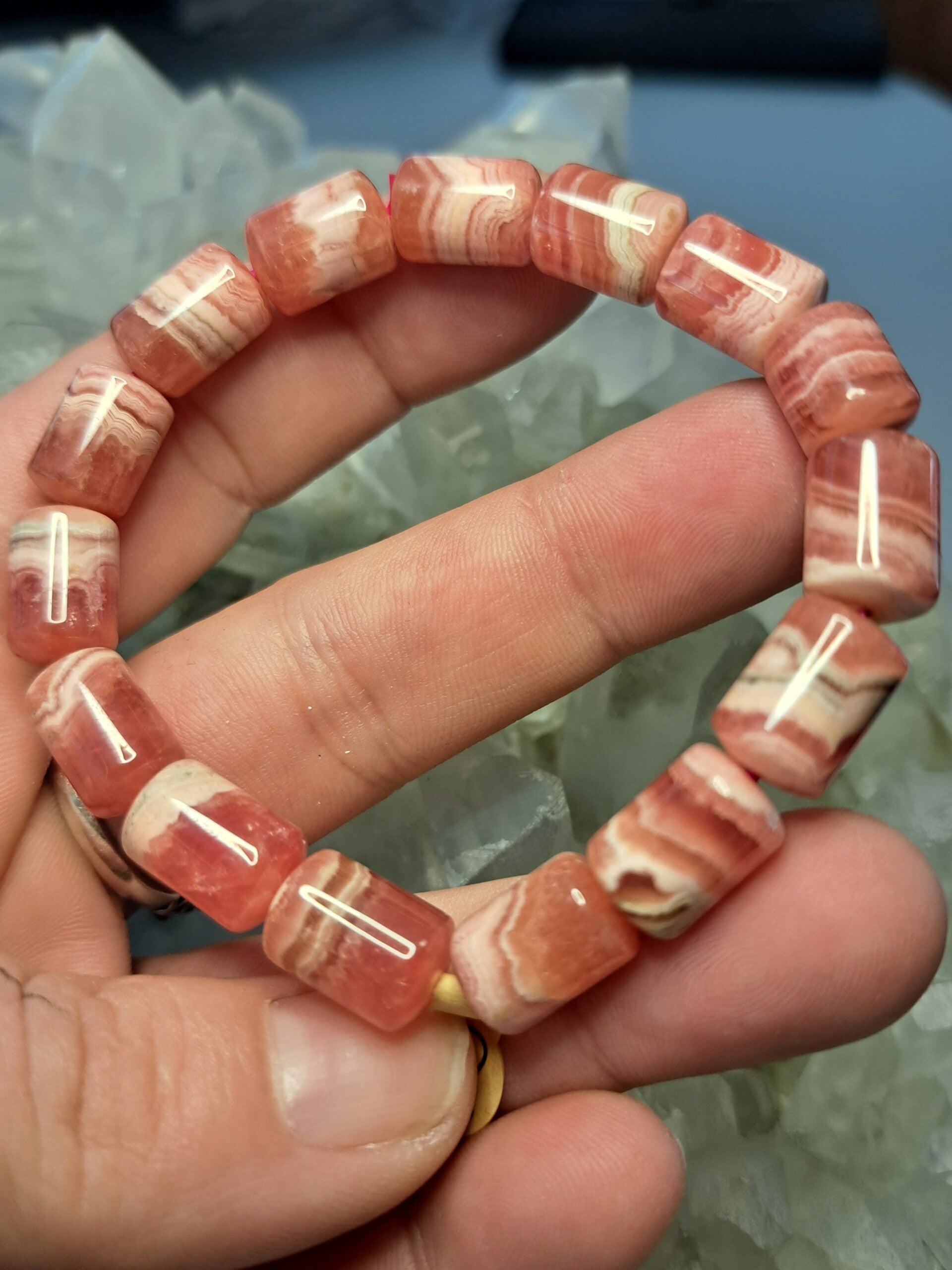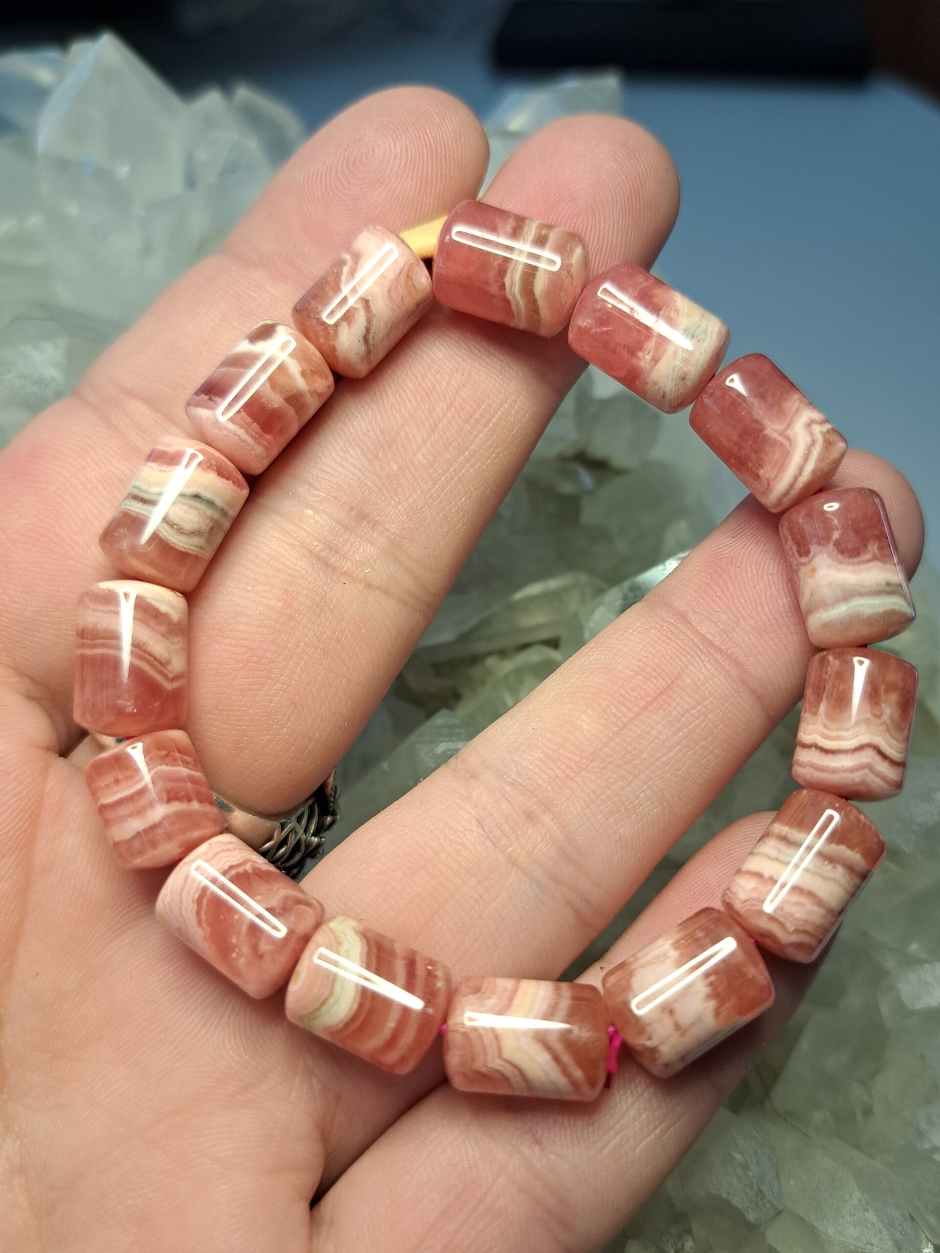 Rhodochrosiet is een mangaan carbonaat en krijgt de mooie roze kleur door de mangaan en hebben vaak de mooiste lijnenpatronen.