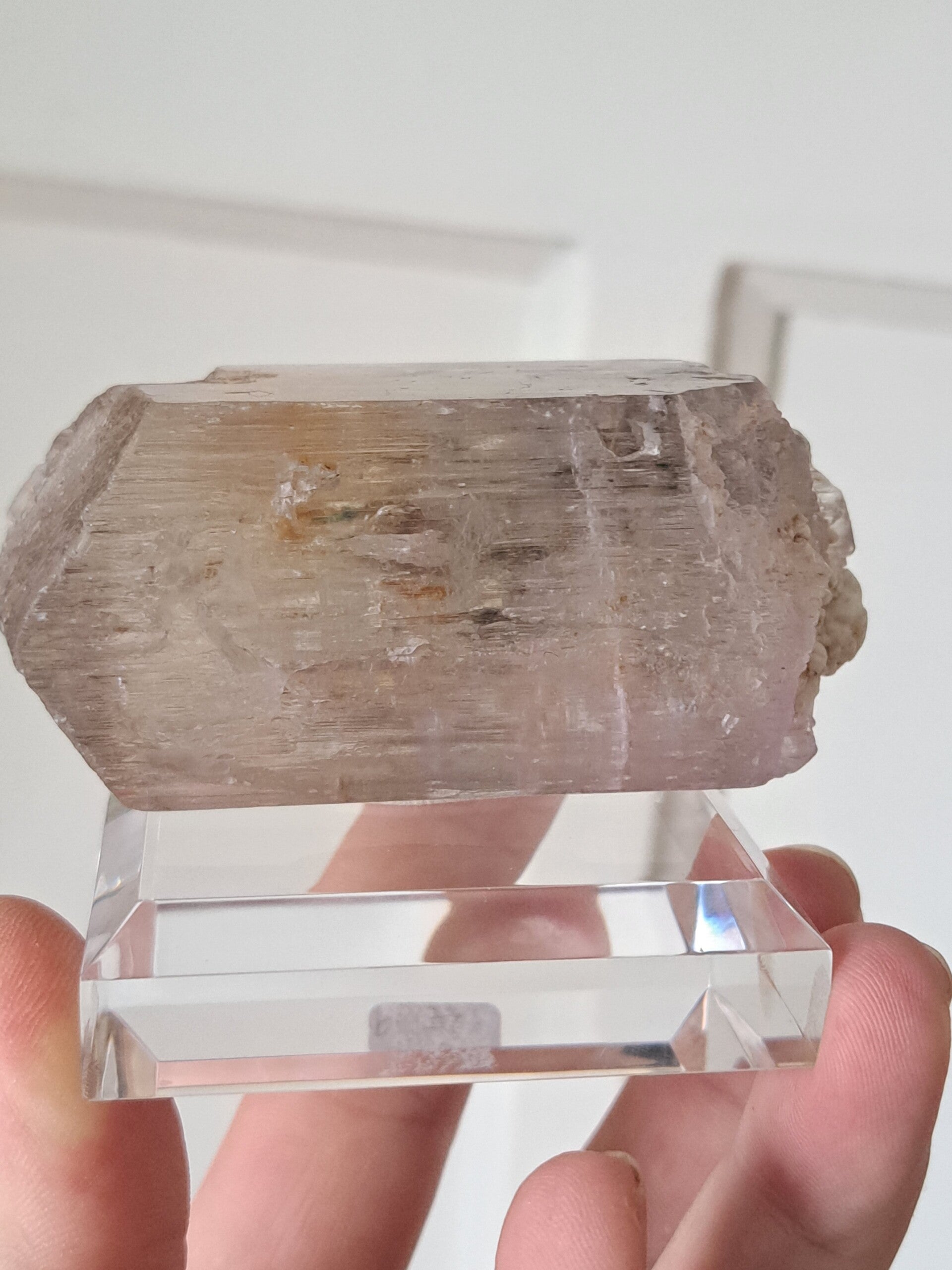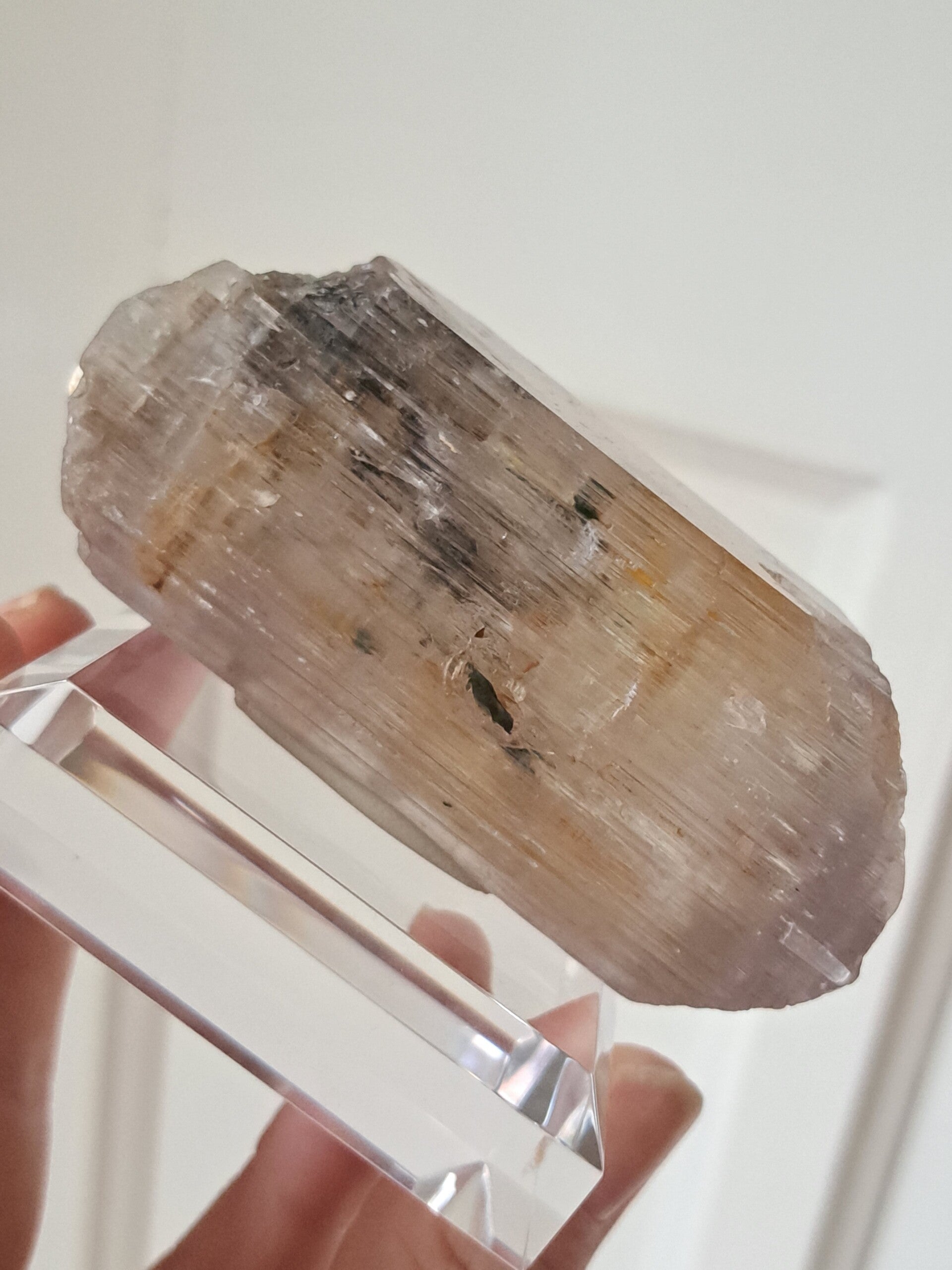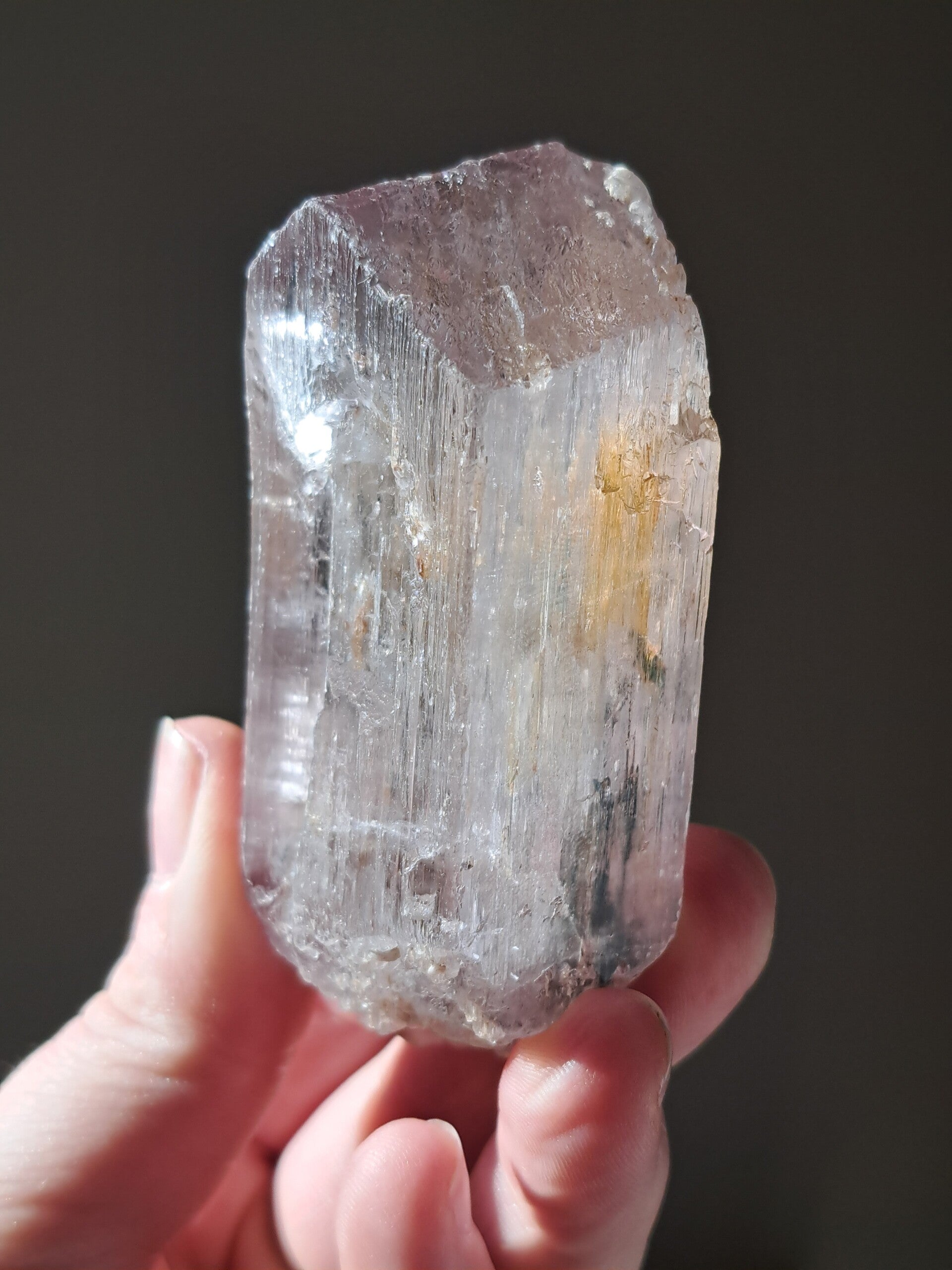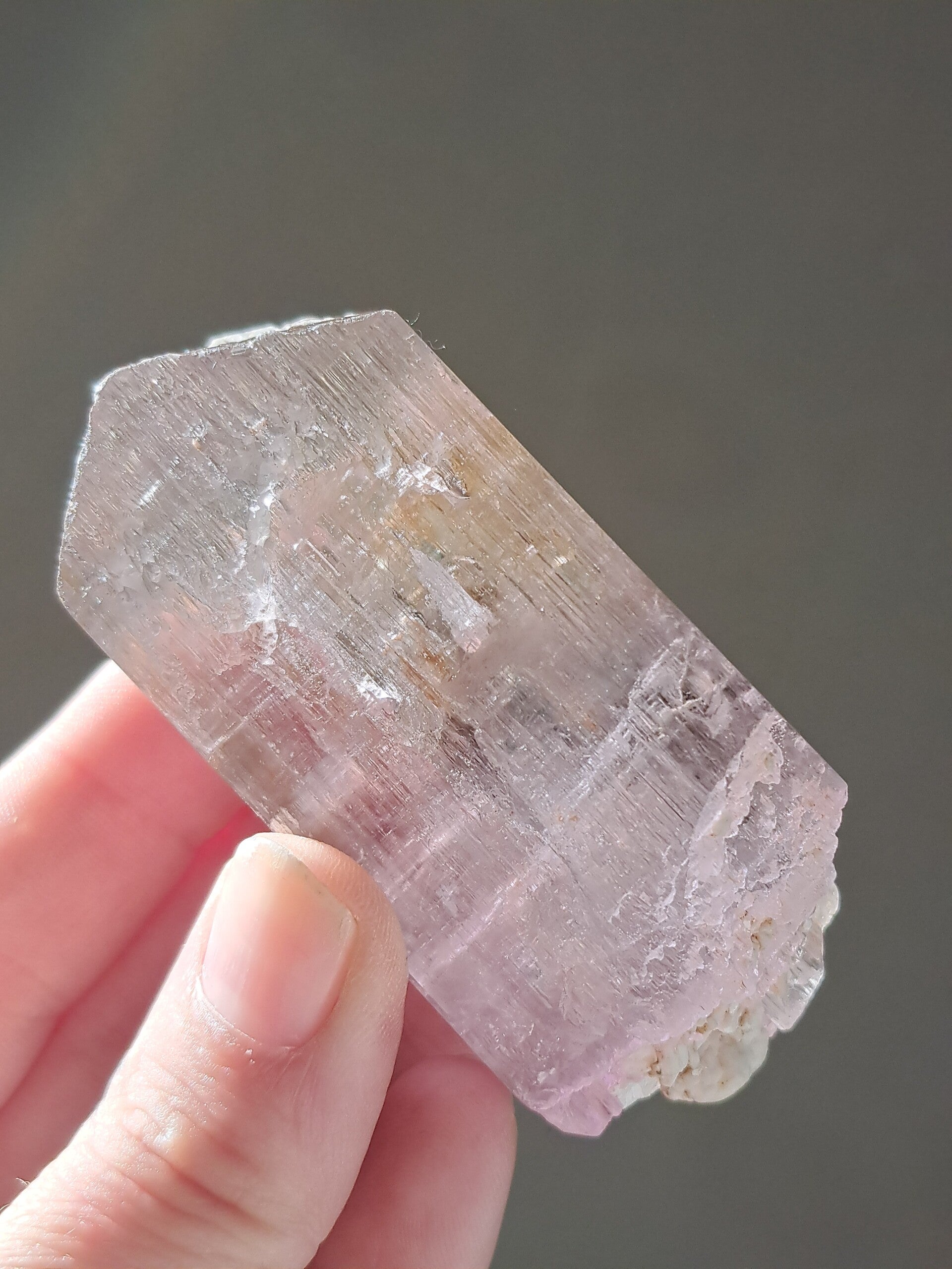 Prachtig, volledig getermineerd stuk meerkleurige Spodumene (Spodumeen/Kunziet), verlopend in kleur van Helder, Roze en Lichtgeel van de ijzerinsluitingen.