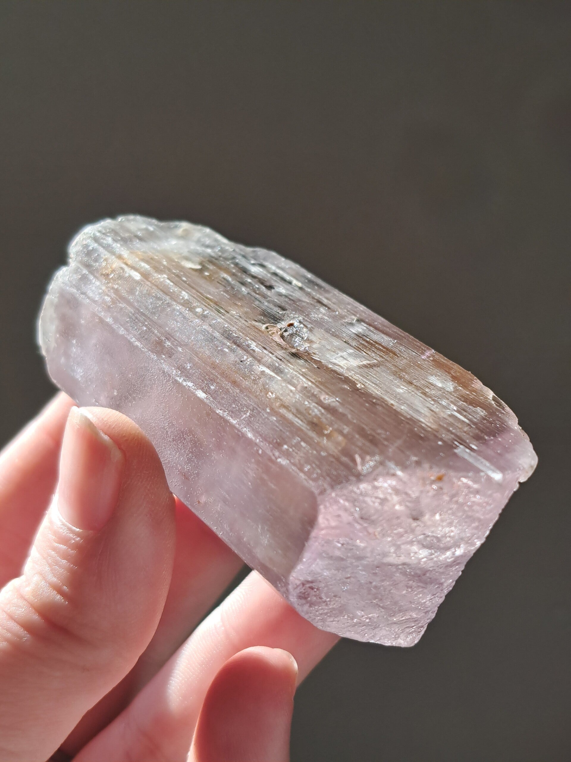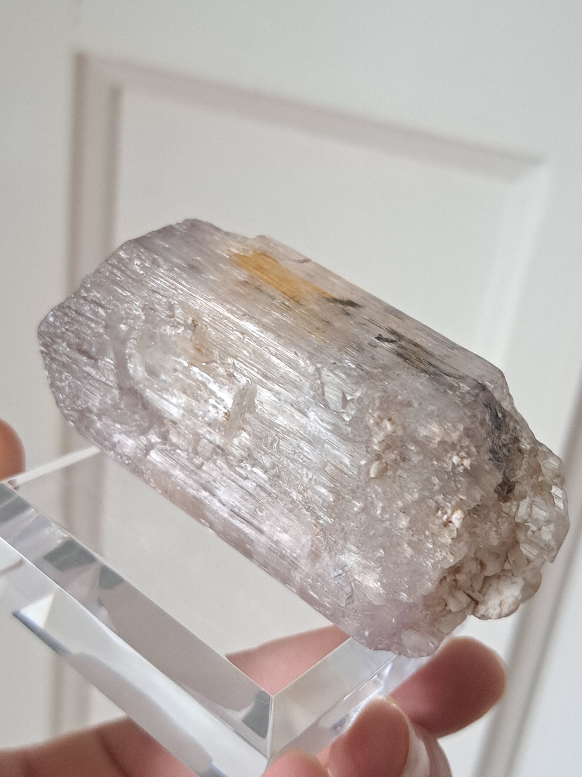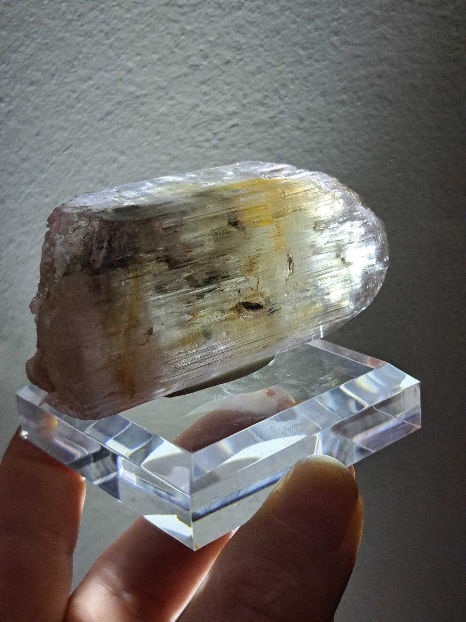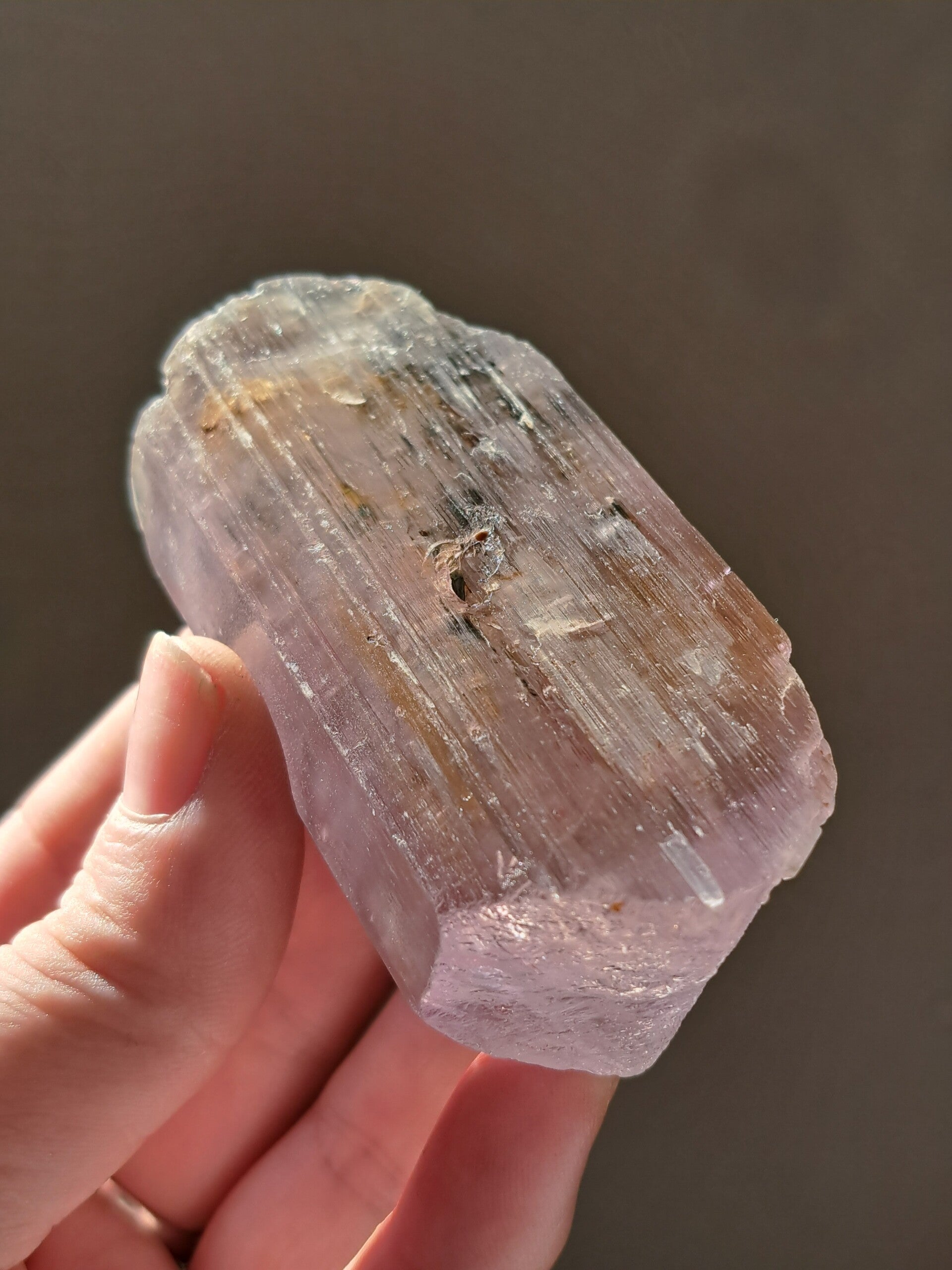 Prachtig, volledig getermineerd stuk meerkleurige Spodumene (Spodumeen/Kunziet), verlopend in kleur van Helder, Roze en Lichtgeel van de ijzerinsluitingen.