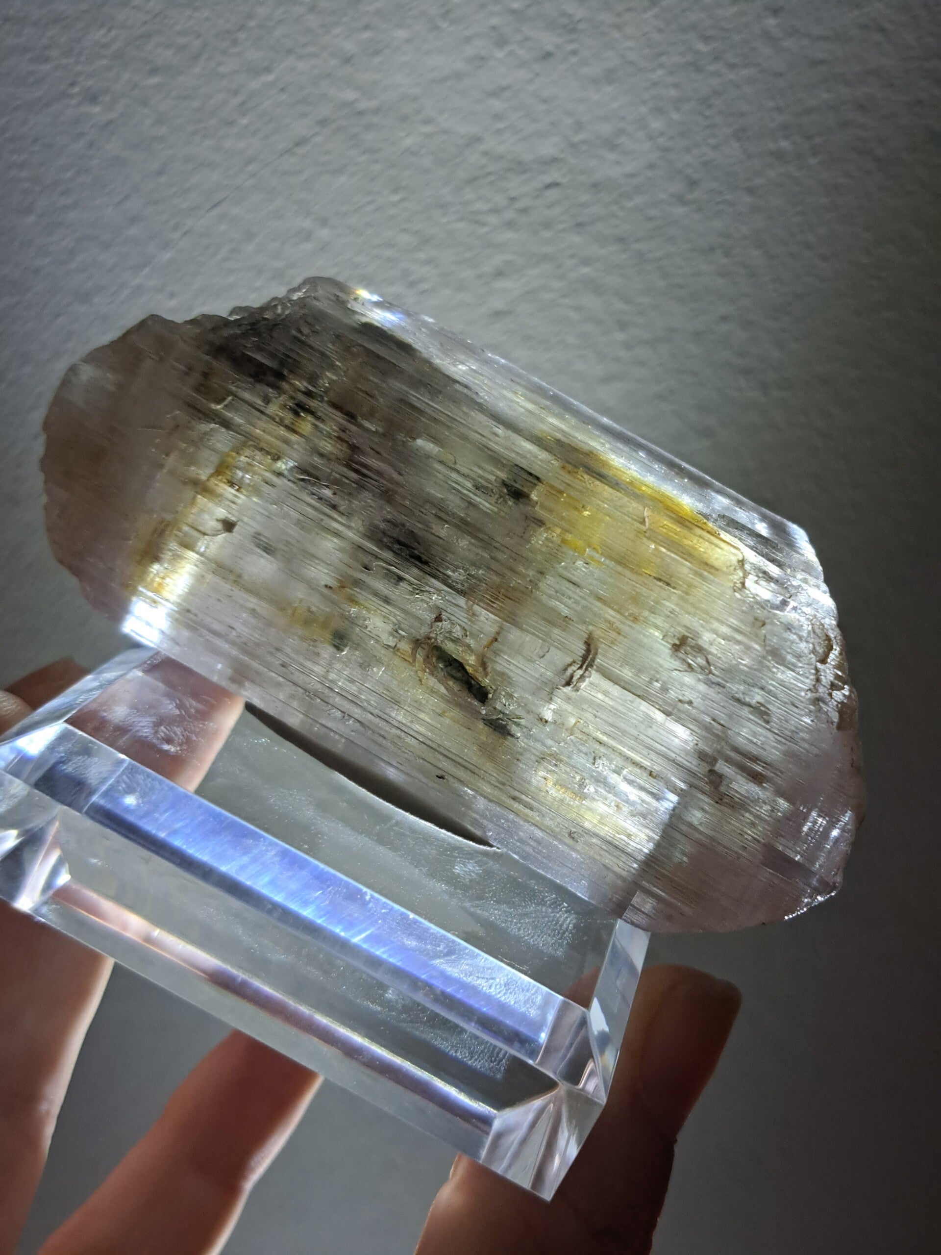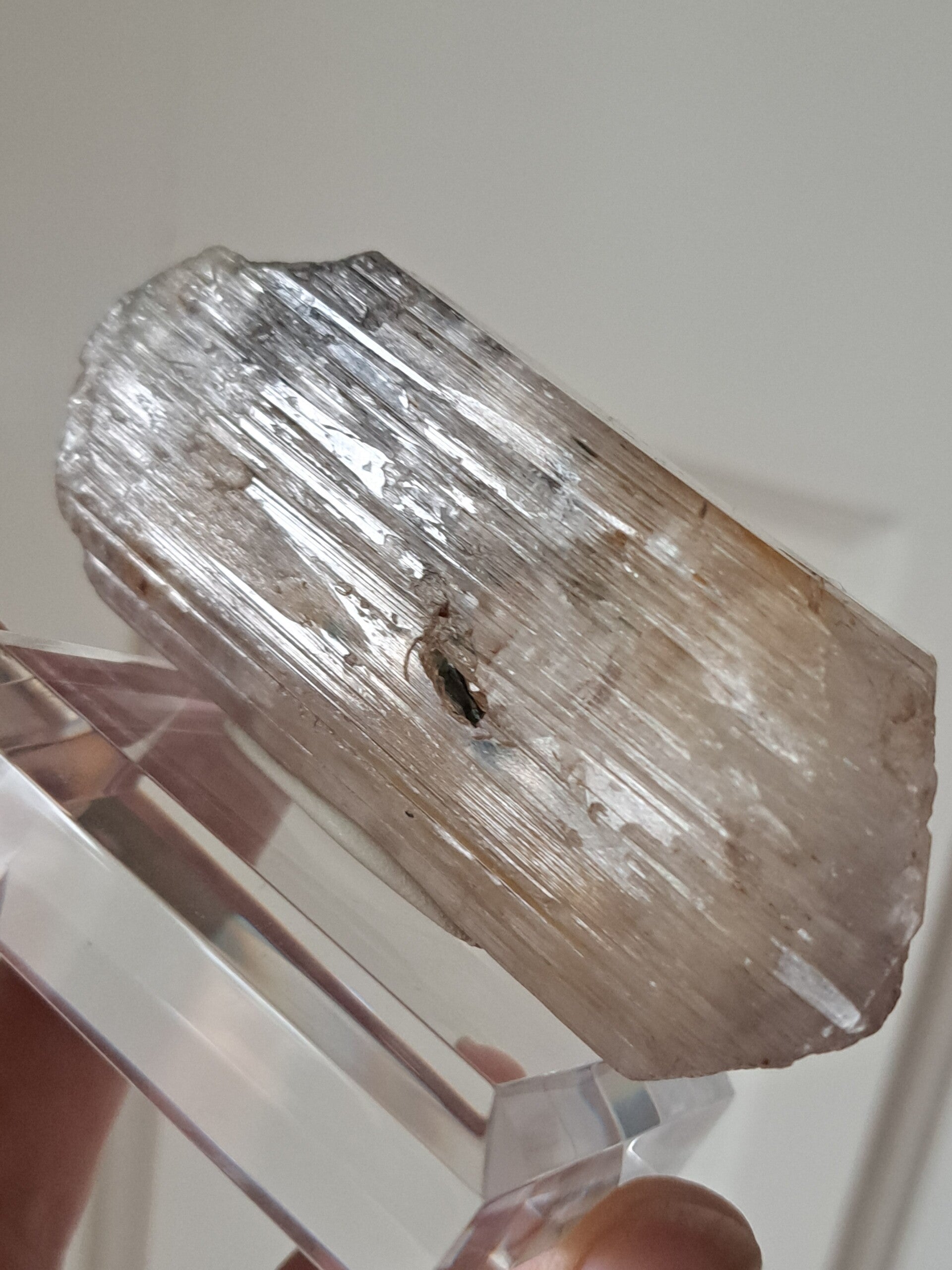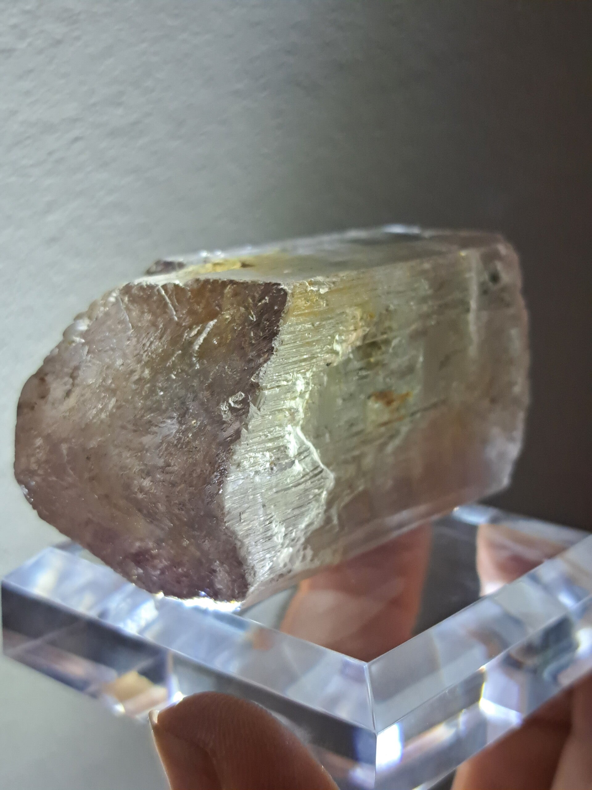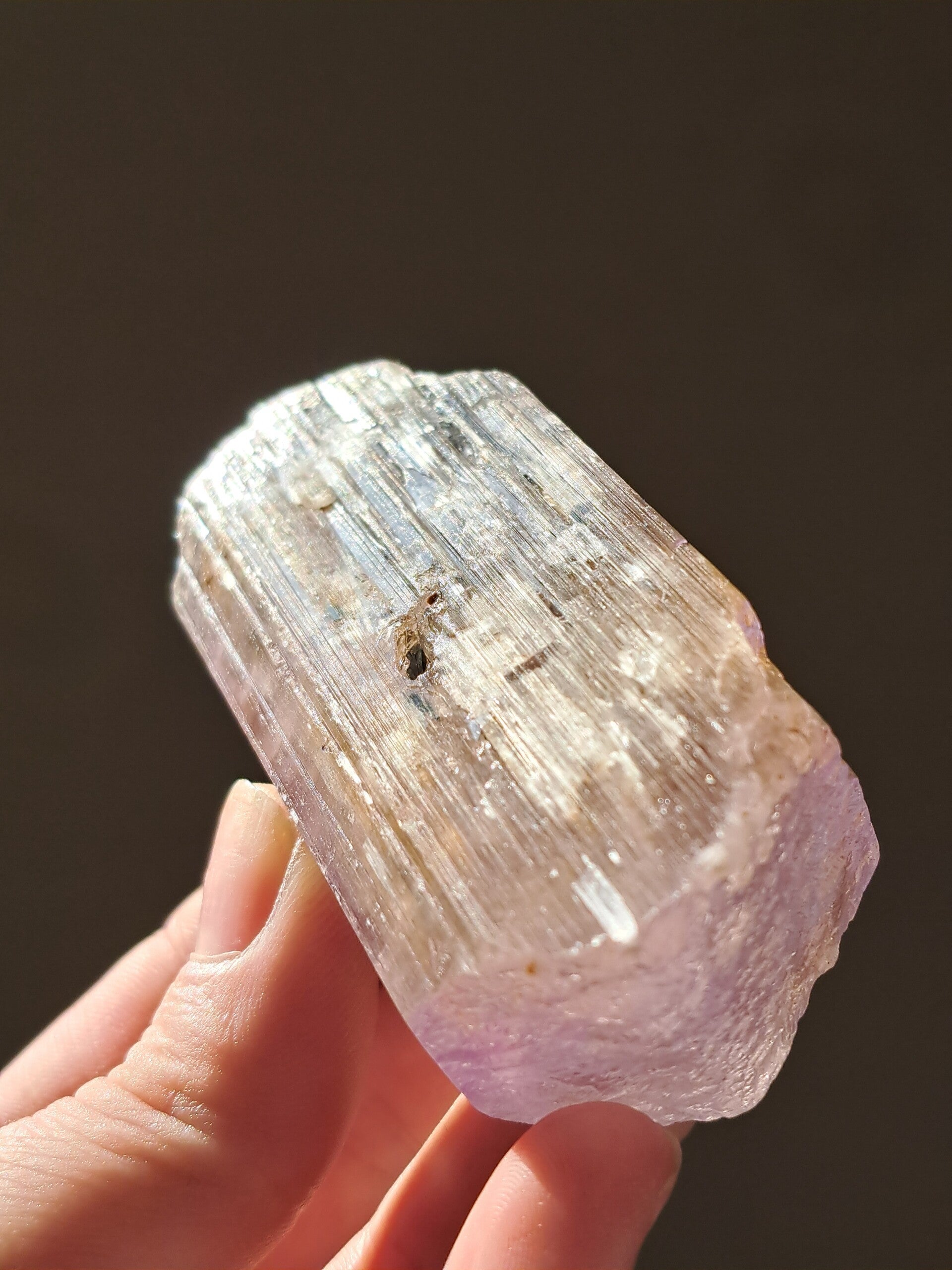 Prachtig, volledig getermineerd stuk meerkleurige Spodumene (Spodumeen/Kunziet), verlopend in kleur van Helder, Roze en Lichtgeel van de ijzerinsluitingen.