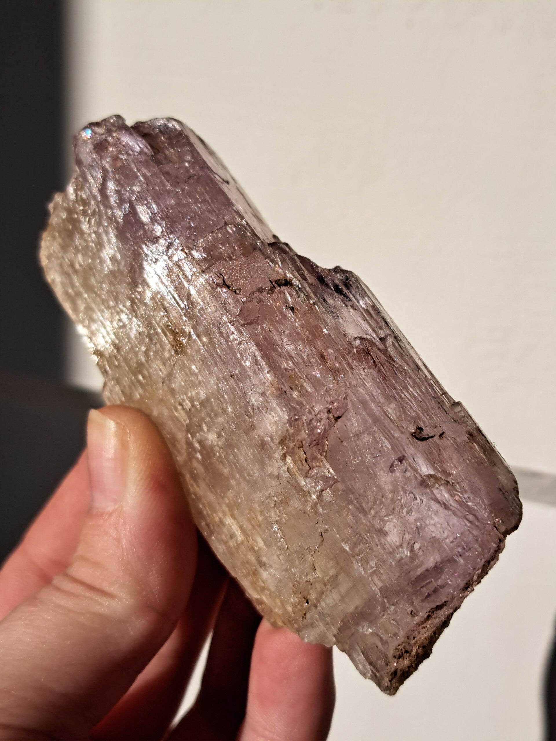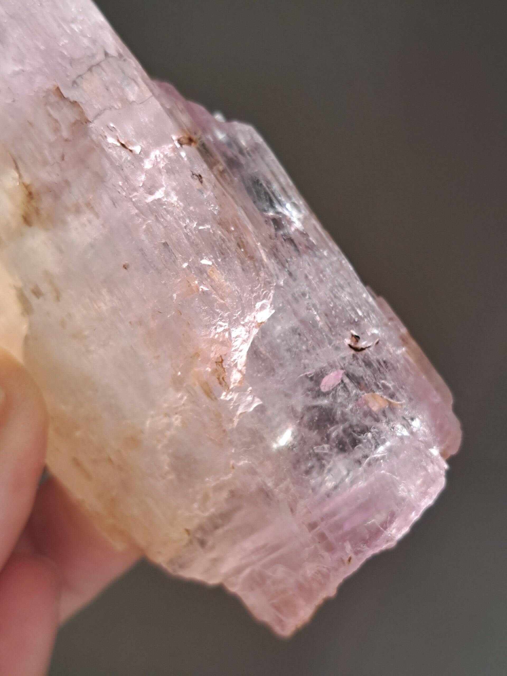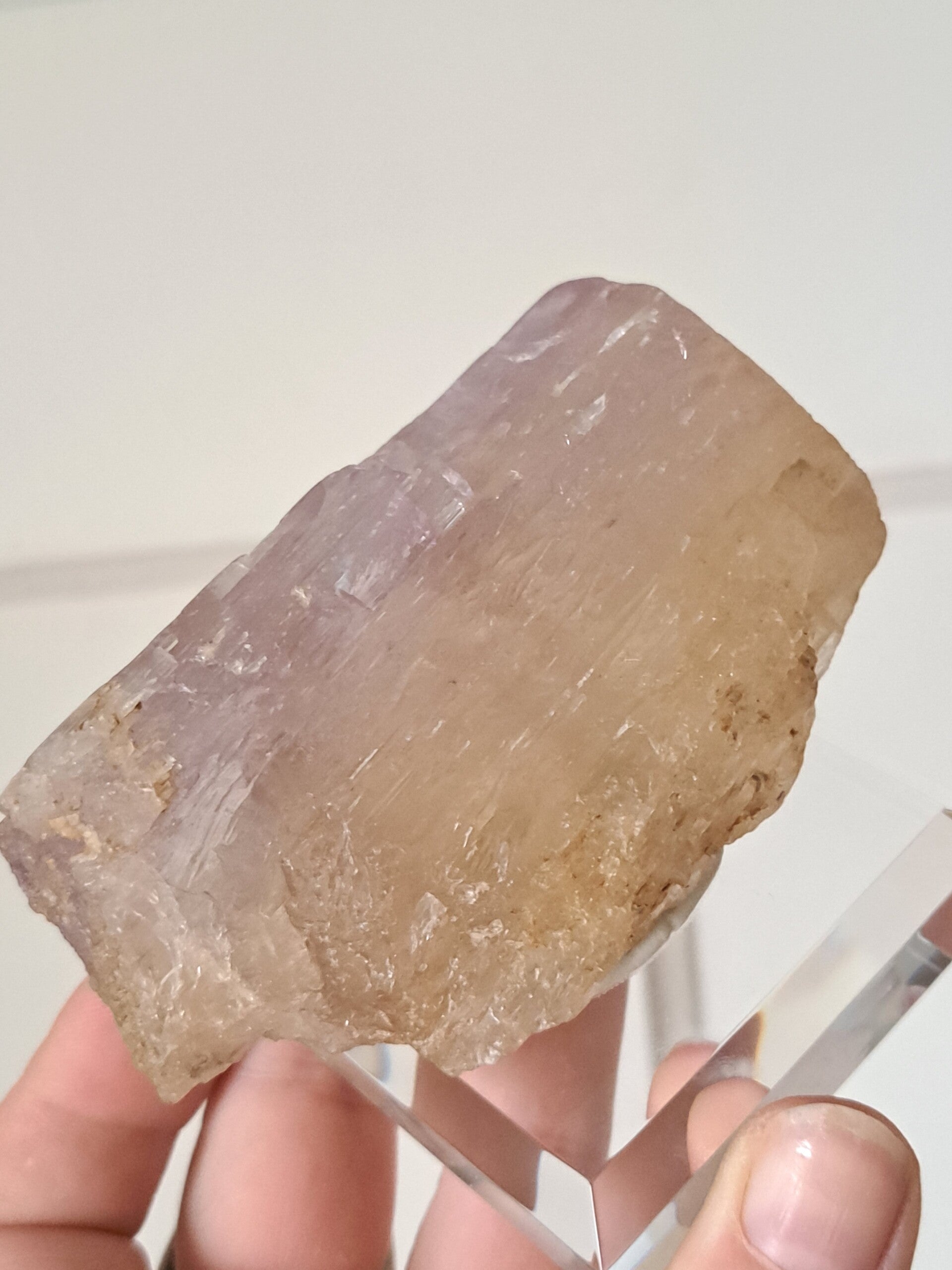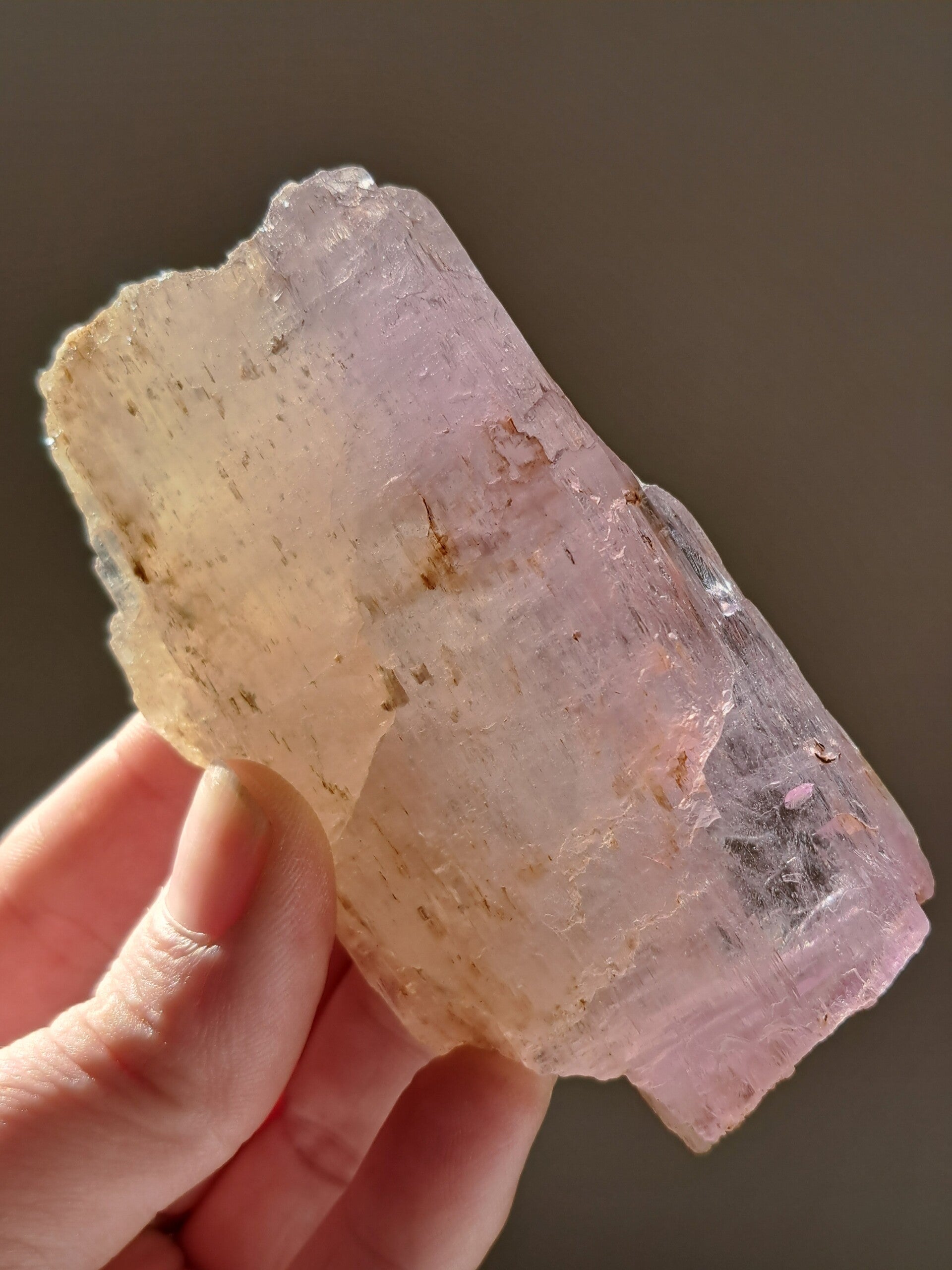 Prachtig, volledig getermineerd stuk meerkleurige Spodumene (Spodumeen/Kunziet), verlopend in kleur van Helder naar geel naar licht roze.