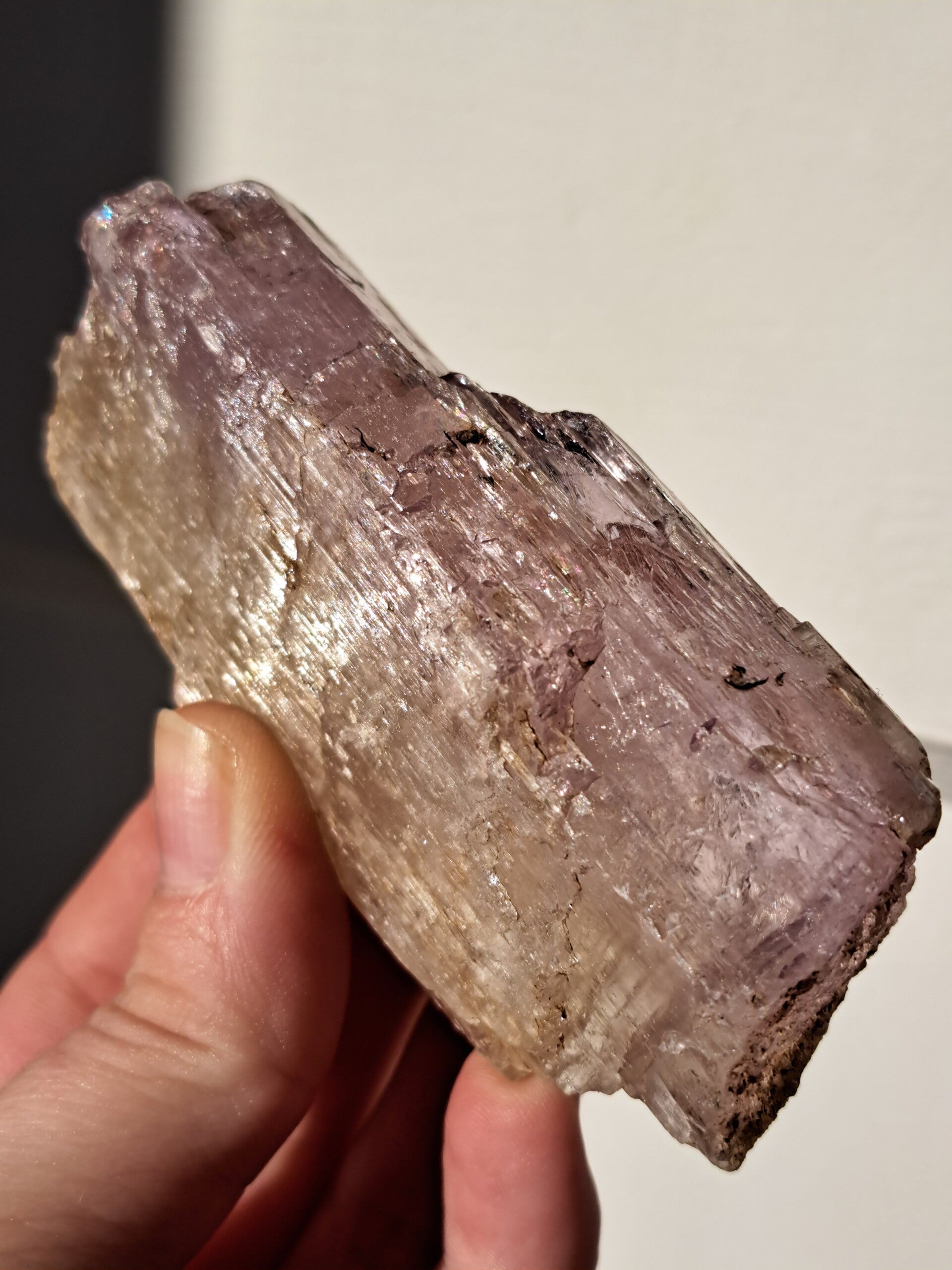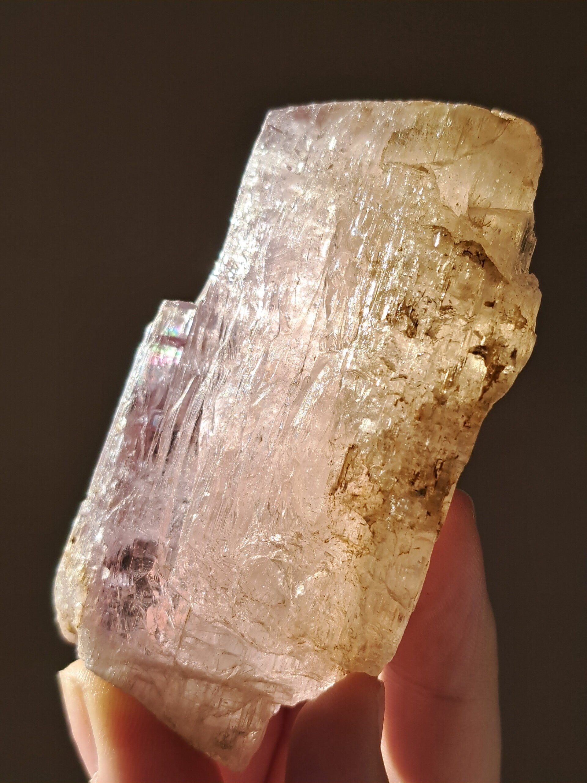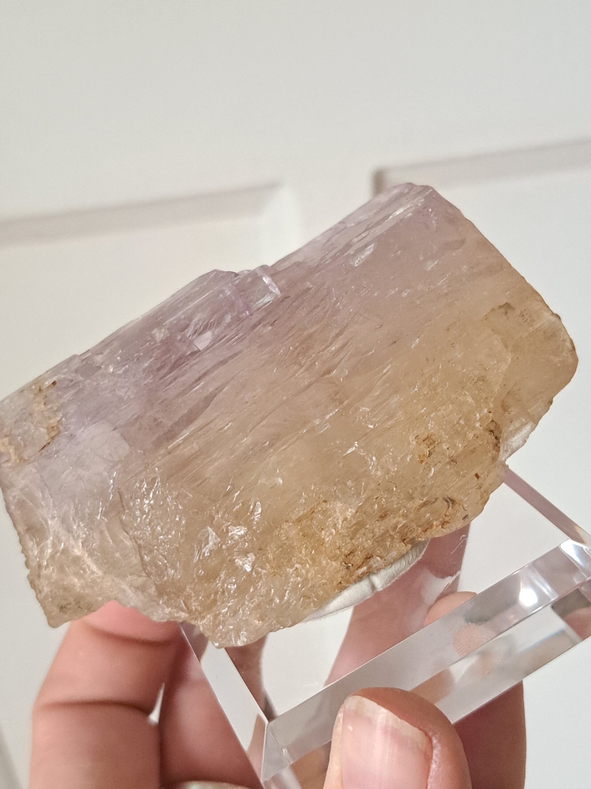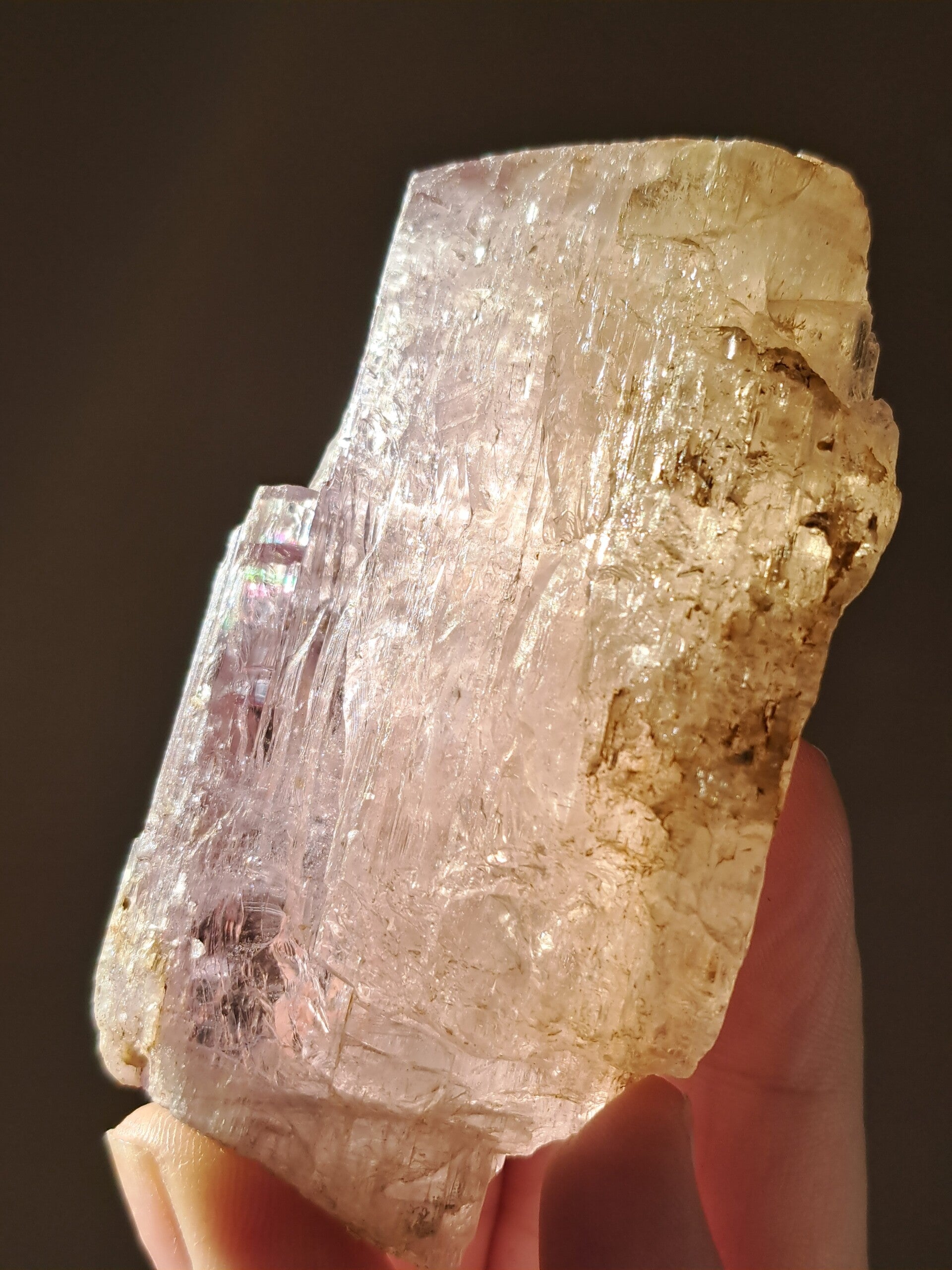 Prachtig, volledig getermineerd stuk meerkleurige Spodumene (Spodumeen/Kunziet), verlopend in kleur van Helder naar geel naar licht roze.