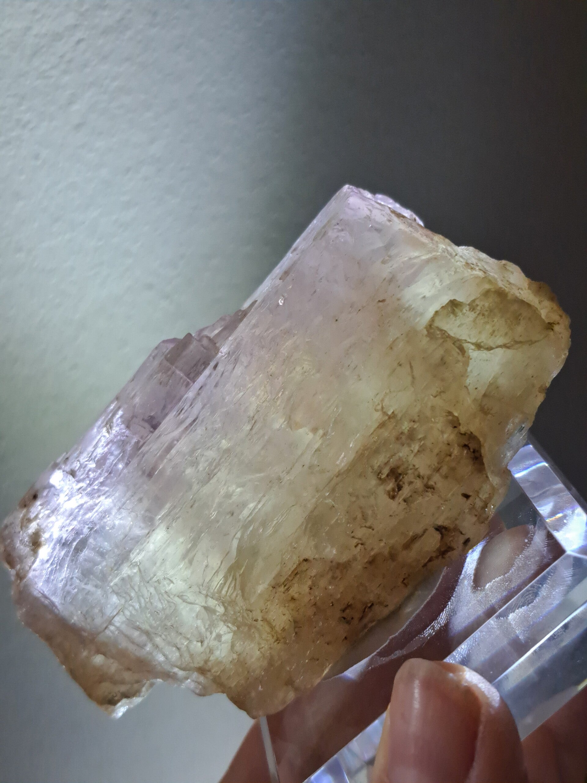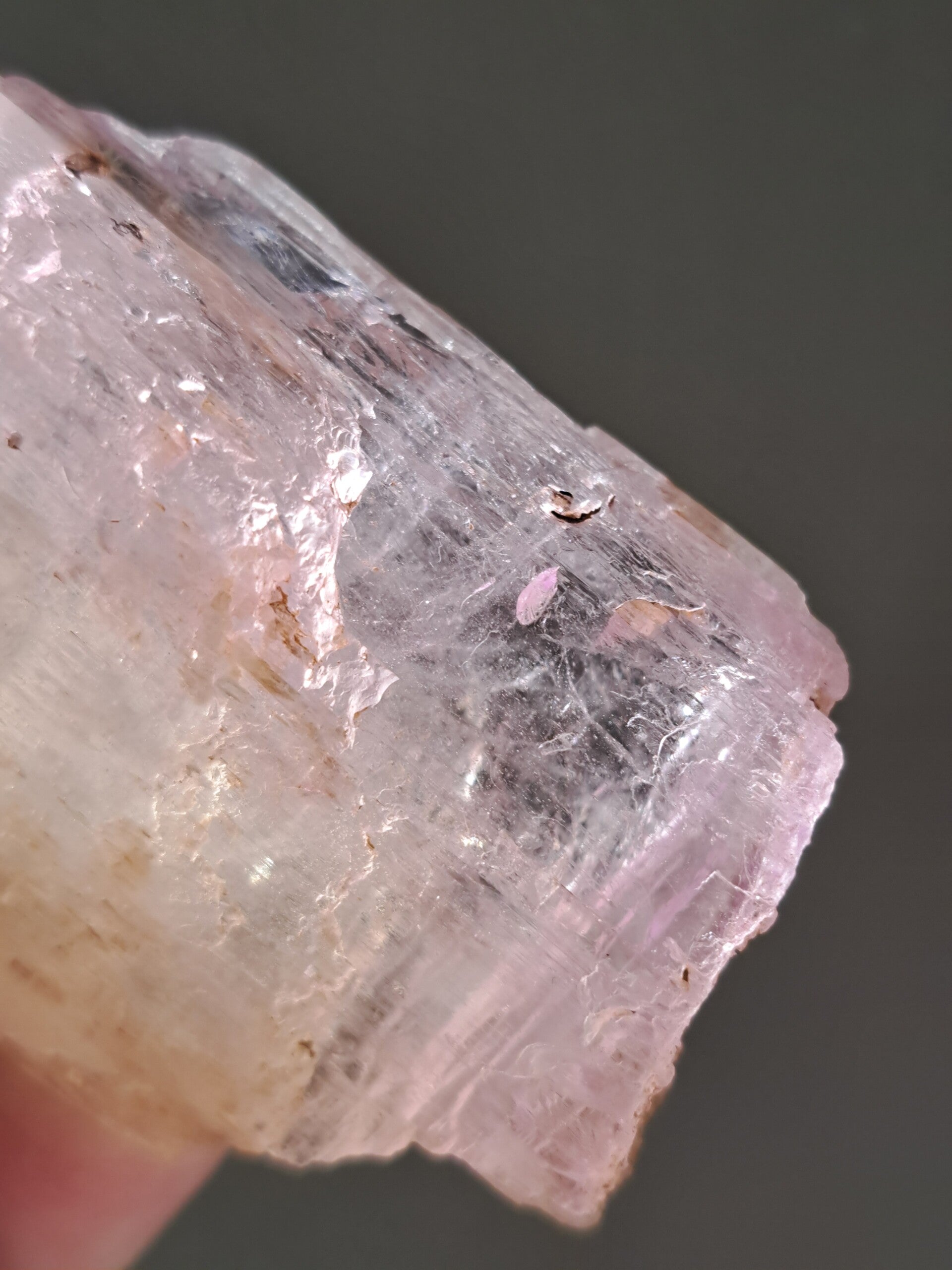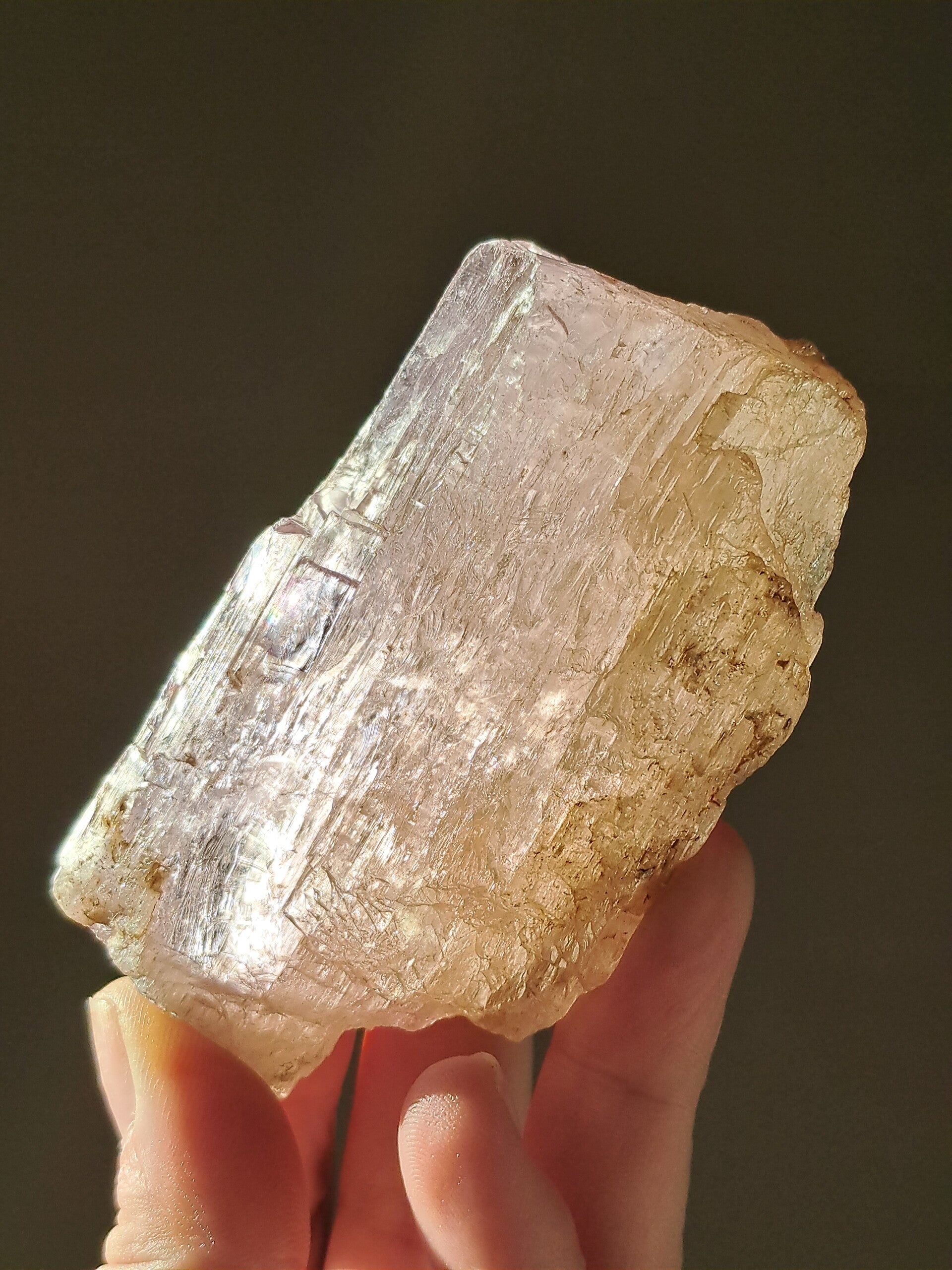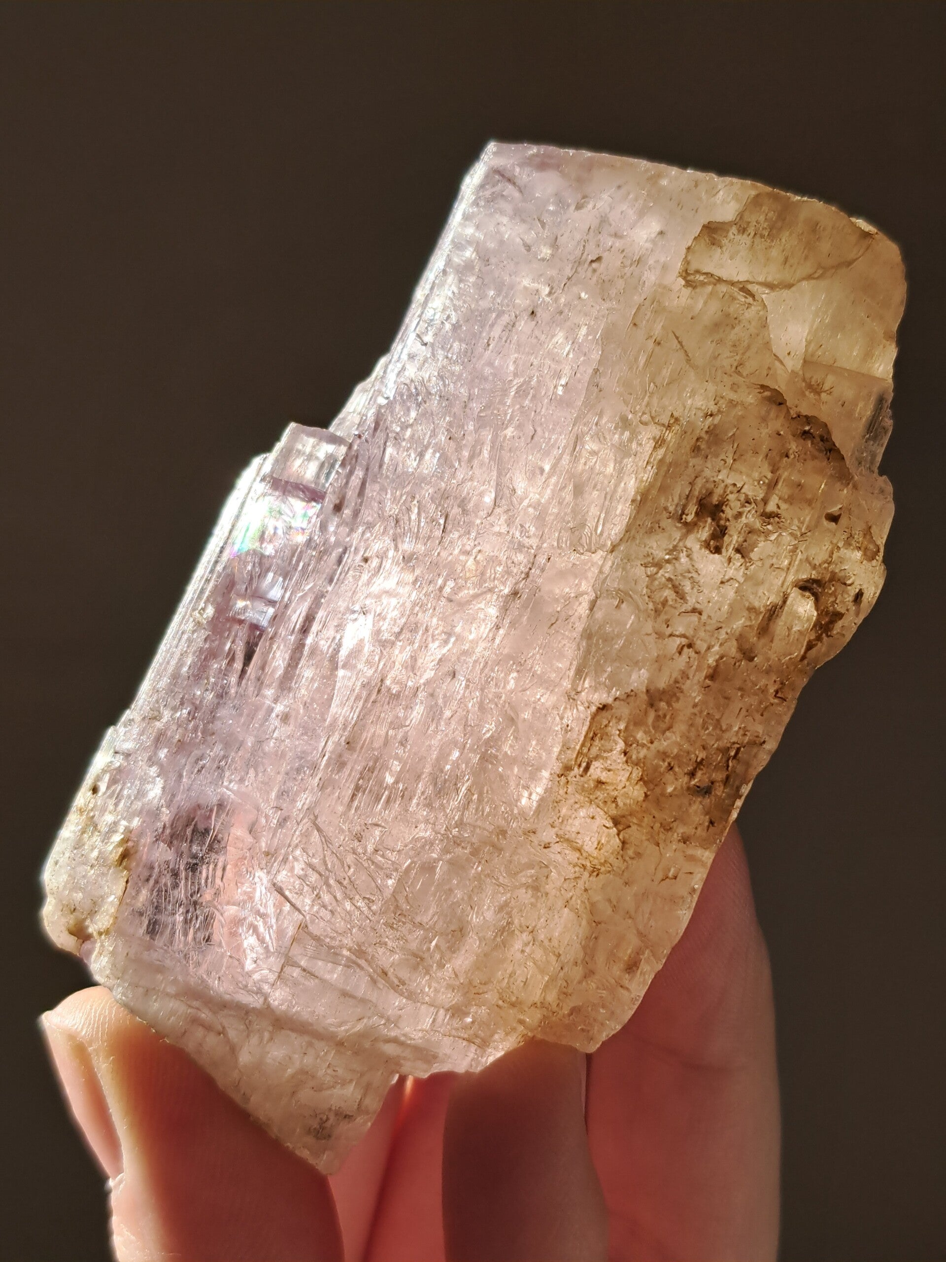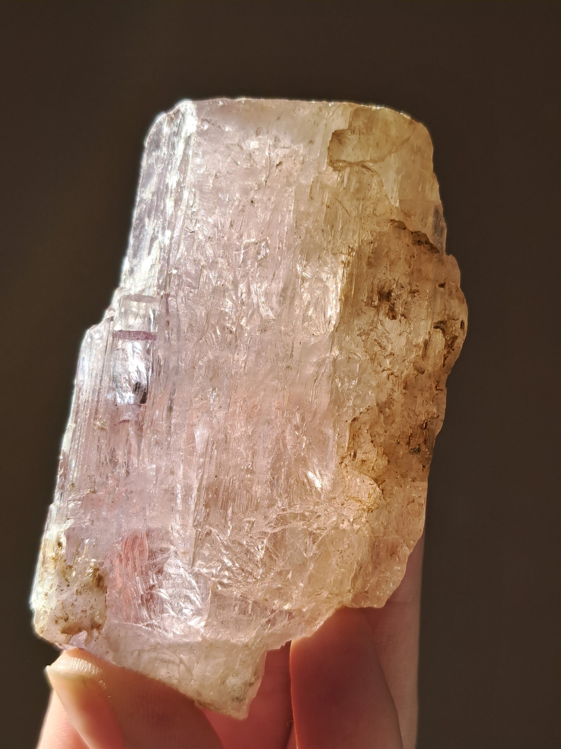 Prachtig, volledig getermineerd stuk meerkleurige Spodumene (Spodumeen/Kunziet), verlopend in kleur van Helder naar geel naar licht roze.