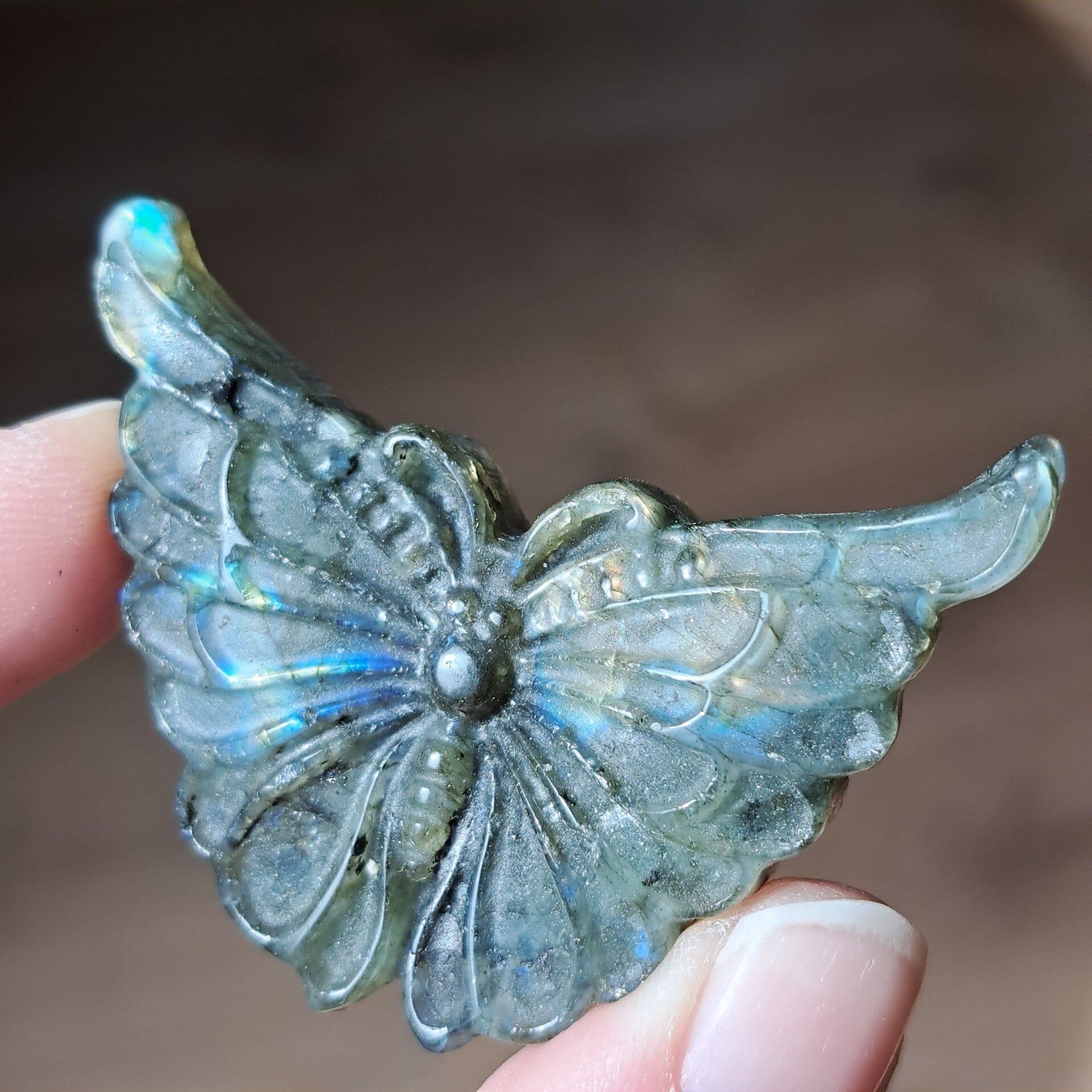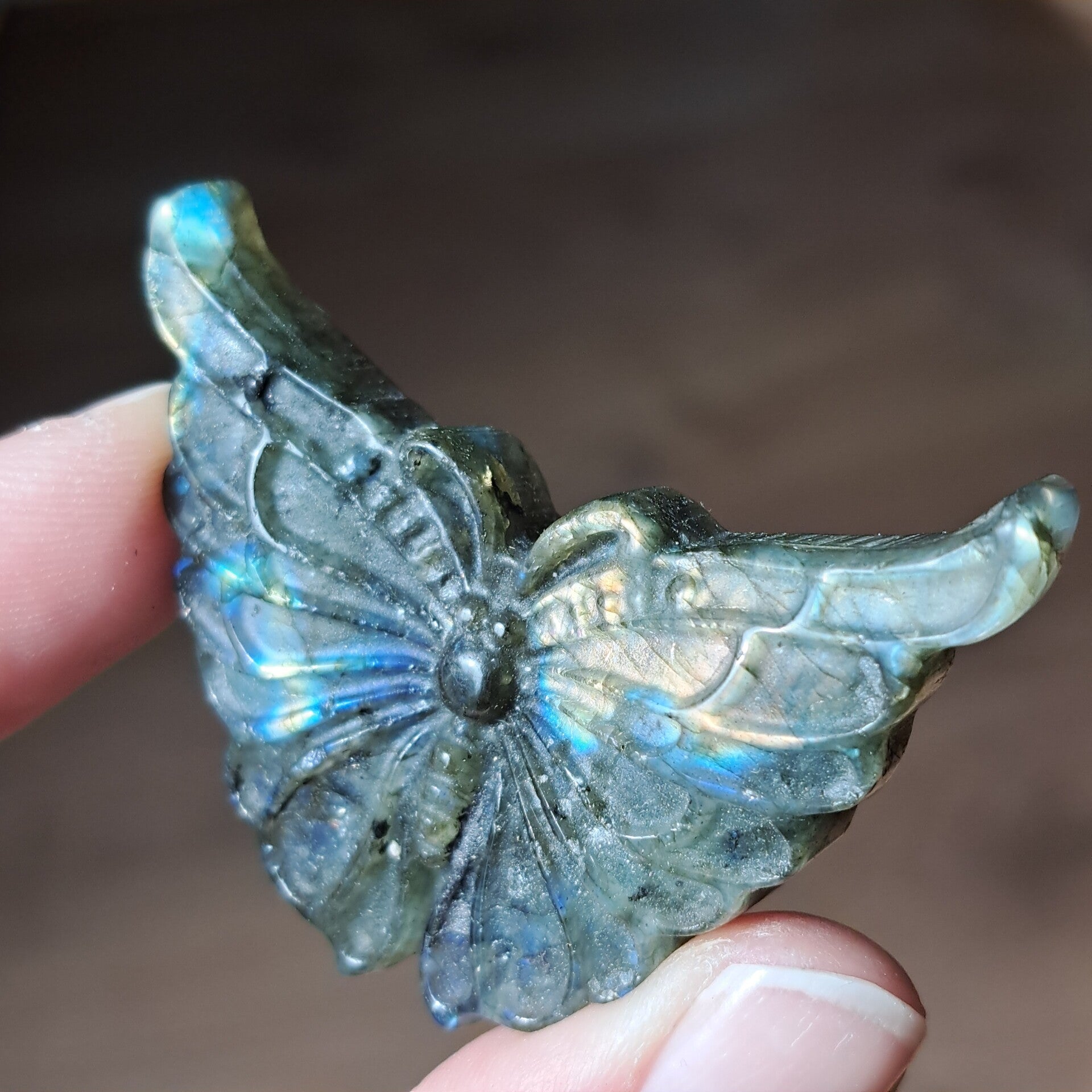 Deze met zorg geslepen vlinder van circa 5 cm vangt het licht op een bijzondere manier. De kenmerkende schittering van labradoriet laat zich telkens anders zien, alsof ze je herinnert aan de lagen die ook in jezelf verborgen liggen.
